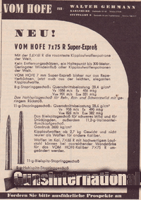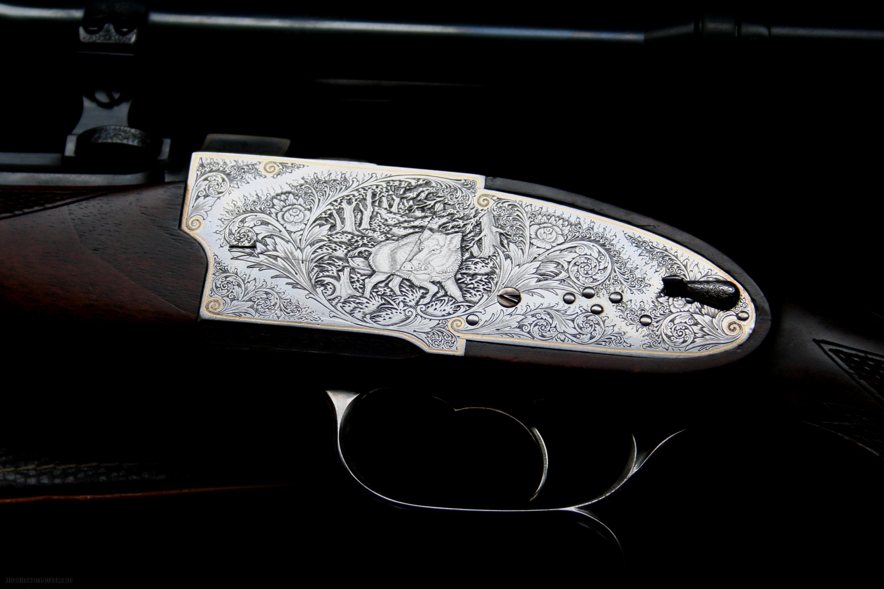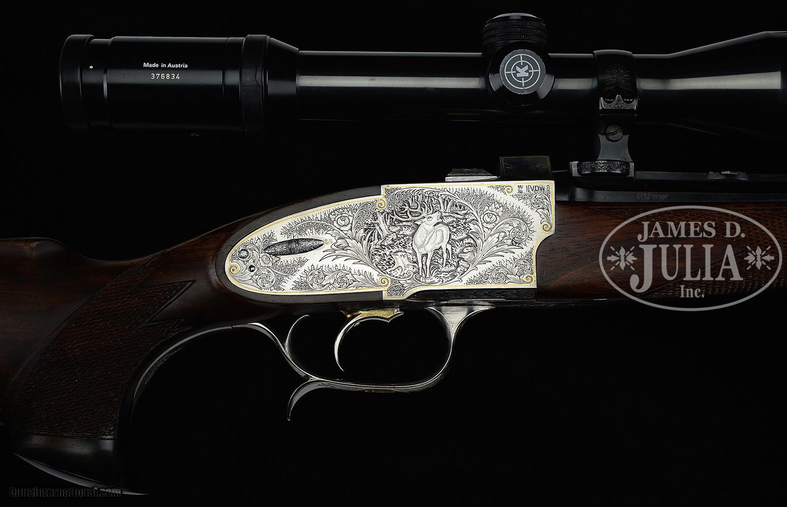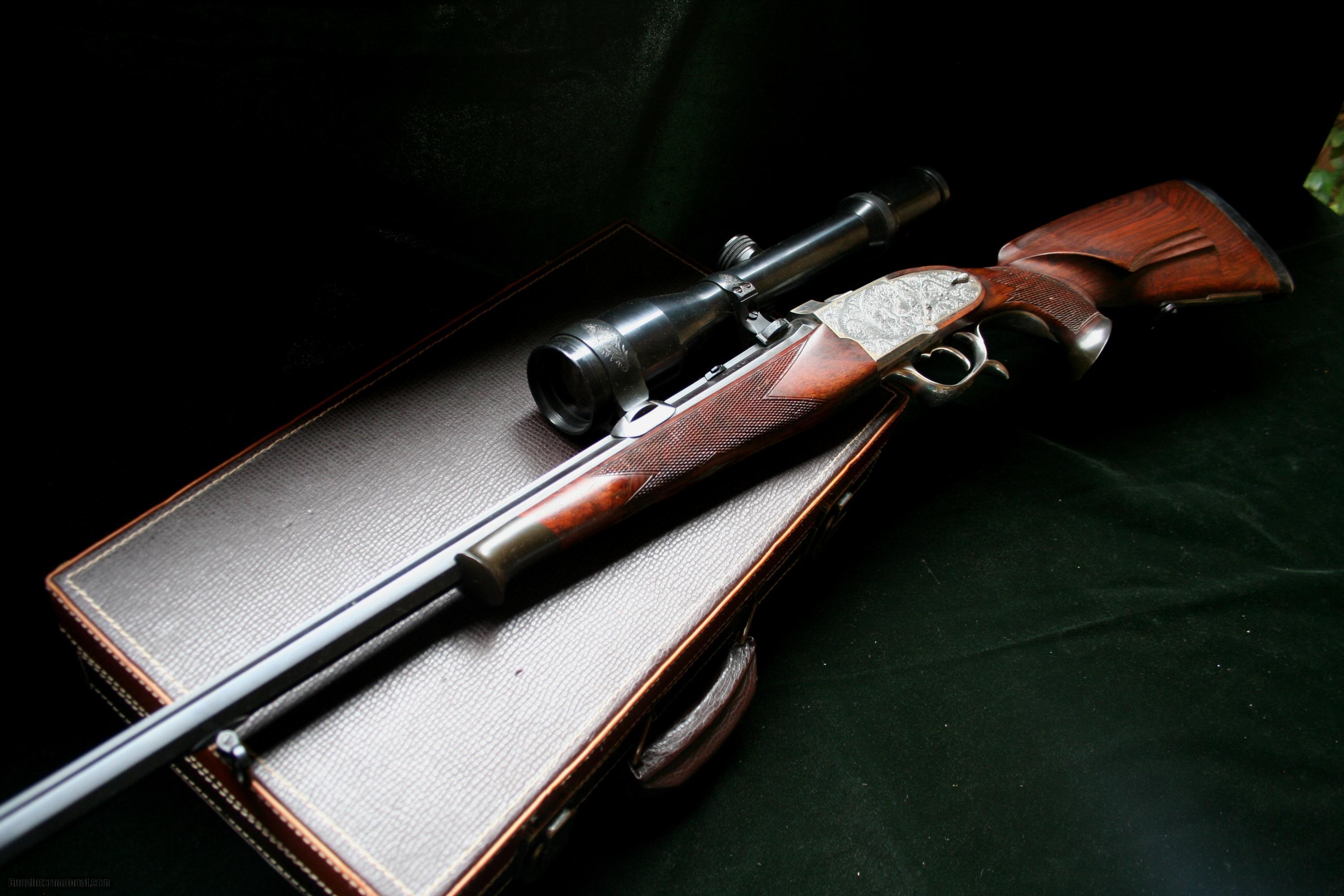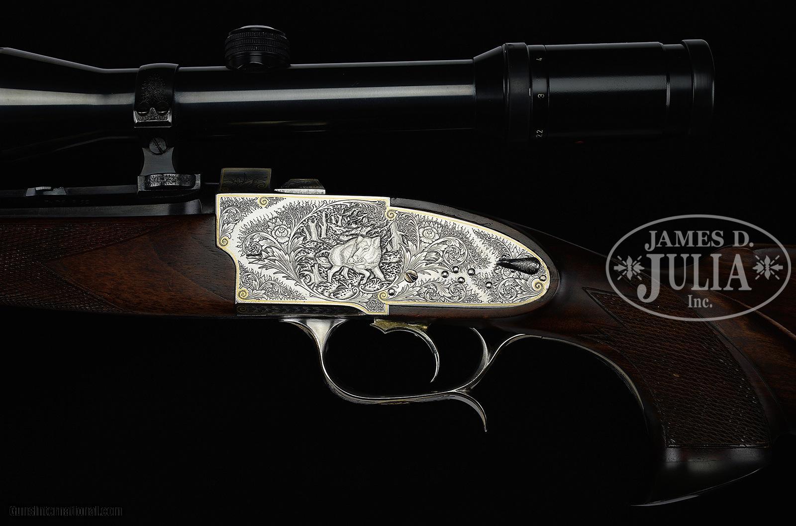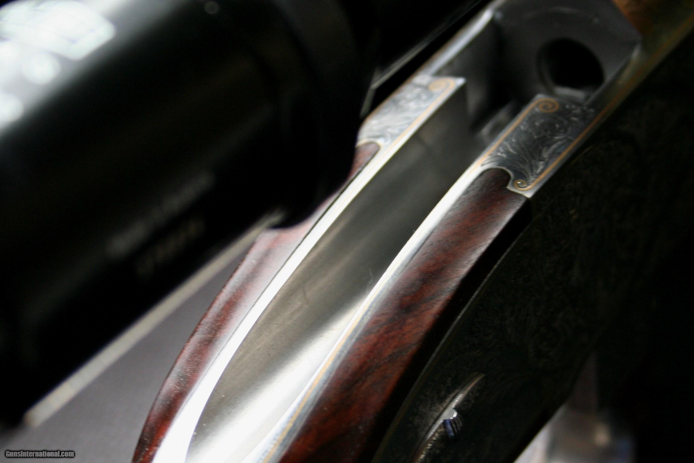 Description: FINELY CRAFTED "KREISITS - FERLACH" SINGLE SHOT DROPPING BLOCK STALKING RIFLE WITH SCOPE. SN #5001.Cal. 7x75R. 26" Rapid taper octagon bbl has intergral rib which tapers forming ramp for brass bead front sight. Rear portion is fitted with flip-up rear sight blade, and claw scope bases. "Kreistits - Ferlach" is Gold-inlaid on central portion of rib. Rifle is stamped with Vienna nitro proofs with date of 2001. Coin finished dropping block action actuated by spurred trigger guard as opening lever, is fitted with single set trigger, hand detachable sidelock on left side,and plate on right fitted with safety. Internals are hand turned with removable Gold-plated parts. Action and lockplates are hand engraved with very well cut shaded scroll with floral highlights, within Gold-inlaid wire borders. This fine engraving surrounds game scenes deplicting beasts which are suitable quarry for this custom rifle; wild boar in dense woodlands on left, and bugling stag in open woodlands on right. Monogram "KK" is relief Gold-inlaid on trigger guard bow. Dark and dense, nicely figured and streaked top grade European walnut buttstock measures 14-3/8 over black leather coverd pad. Stock features right hand fluted Tyrolean cheekpiece, extream pistiol grip with flared horn cap, fluted comb, point pattern checkering, chinstrap transition from grip to butt, and spring-loaded cartridge trap, engraved to match action, on toe line, with space for four cartridges. Matching slim foreend,with flared horn tip, attaches to bbl. with screw through lozenge shaped escutcheon. Kahles - Helias 2.2 - 9 X Scope with 30mm tube has three heavy post and crosshair reticle, and is in well made steel rings engraved to match action. Also included with rifle is leather case containing 8 boxes of factory cartariges by Vom Holf, aset of RBS dies, and a bag containing approx. 20 unprimed cases. CONDITION: Excellent throughout, with evidence of little field use. Optics are clear and bright. Cartridges are fine. A very finly crafted stalking rifle in a caliber with very impressive ballistics. SOLD Manufacturer: "KREISITS FERLACH Model: Single Shot Dropping Block Stalking Rifle Serial Number: #5001 Caliber Info: 7x75R Condition: EXCELLENT Metal Condition: EXCELLENT Wood Condition: EXCELLENT Bore Condition: EXCELLENT Barrels: EXCELLENT Barrel Type: Rapid Taper Octagon Action: Dropping Block Triggers: Single Set Stock: European Walnut Stock Dimensions: 14-3/8 Stock Comb: Approx. 1-3/8 Stock Heel: Approx. 2-5/8 Stock Cast: Right hand fluted Tyrolean cheekpiece Fore End: Flared Horn Butt Pad: Black Leather LOP: 14-3/8 Finish: Coin Weight: 7 lbs. 5 oz. w/o Scope Sights: Front Brass Bead Ramp - Rear Flip-up Blade Manufacture Date: 1958 ? Engraving: Game/Floral/Gold-Inlaid Wire Extras: Yes Case: Ammo Only Item Location: Georgia, USA Proof:Nitro: Vienna 2001 |
