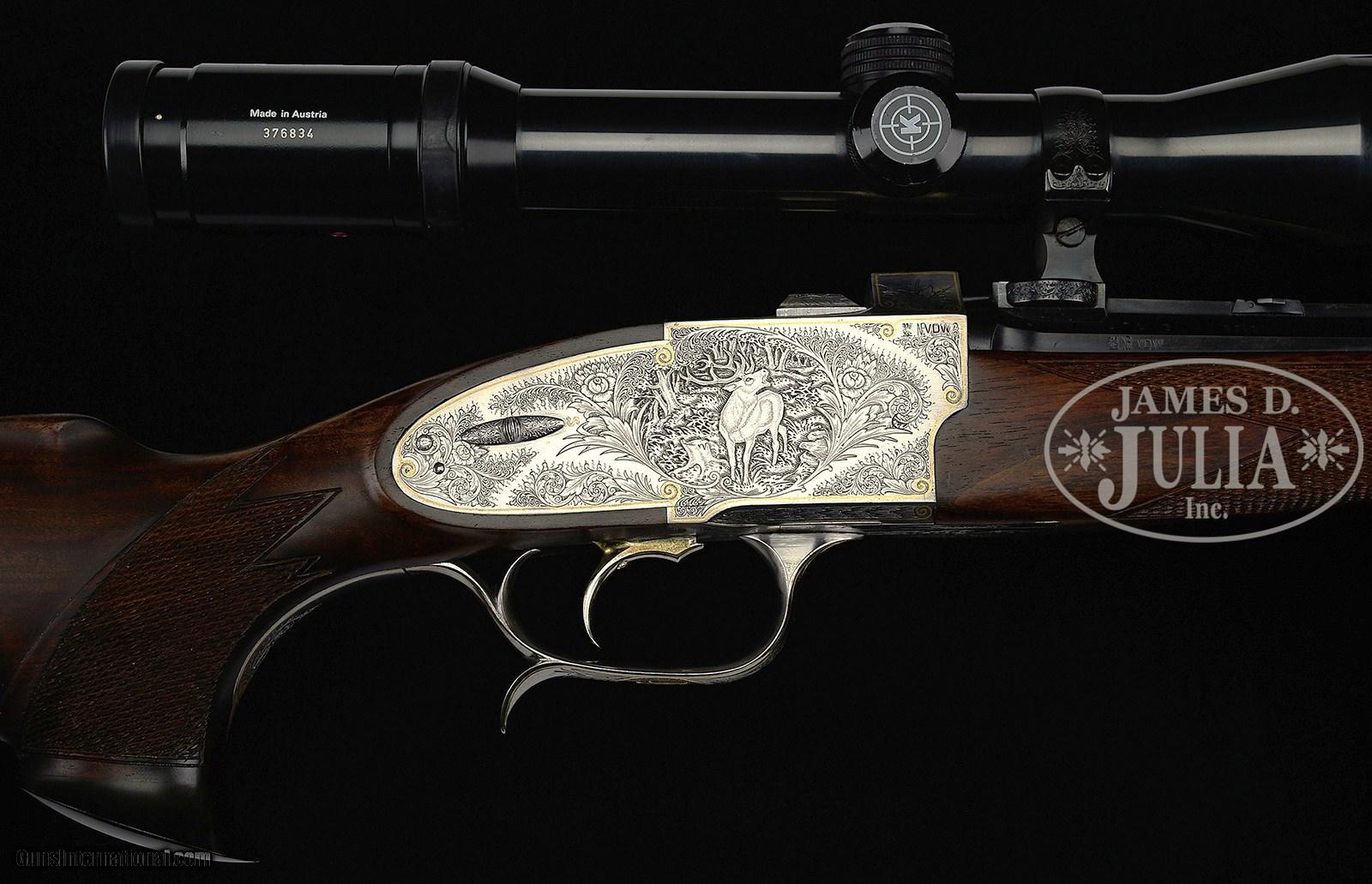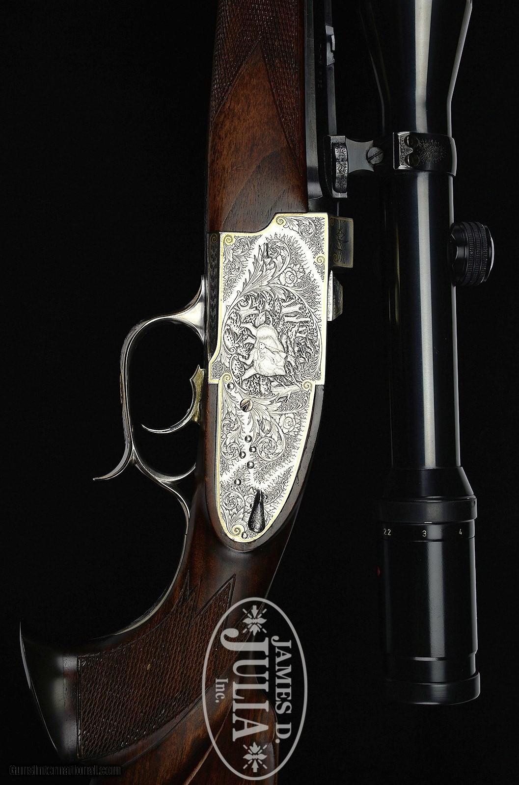 Description: FINELY CRAFTED CUSTOM "KREISITS-FERLACH' SINGLE SHOT DROPPING BLOCK STALKING RIFLE WITH SCOPE (Cal. 7 X 75R SE) SN #xx01 Rapid taper 26" octagon bbl has integral rib which tapers forming ramp for brass bead front sight. Rear portion is fitted with flip-up rear sight blade, and claw scope bases. "KREISITS-FERLACH" is Gold Inlaid on central portion of rib. Coin finished Dropping Block action actuated by spurred trigger guard as operating lever, has single set trigger, hand detachable side lock on left side and plate on right fitted with safety. Internals are hand turned with movable parts Gold-plated. Action and lockplates are hand engraved with very well cut shaded scroll with floral highlights, within Gold inlaid wire boarders. This surrounds game scenes deplicting beasts which are suitable quarry for this rifle; wild boar in dense woodlands on left, and bugling stag in open woodlands on right. Monogram "KK" is relief Gold inlaid on trigger bow. Dark and dense nicely streaked European walnut buttstock measures 14-3/8 over black leather pad. A spring -loaded cartridge trap, engraved to match action, on toe line , with space for four cartridges. Kahles Helias 2.2-9X Scope with 30mm tube has three heavy post and crisshair reticle, and is well made steel rings engraved to match action. Extras included: Leather cartridge case containing 8 boxes (10ea.) of cartridges by vom Hofe, set of RBS dies, and approx 20 unprimed cases. Condition: EXCELLENT with evidence of light field use. SOLD |
