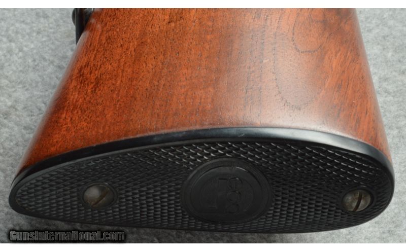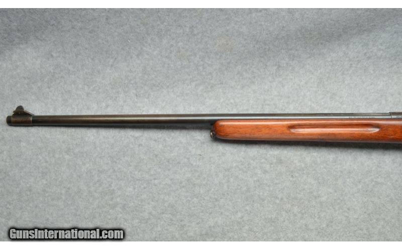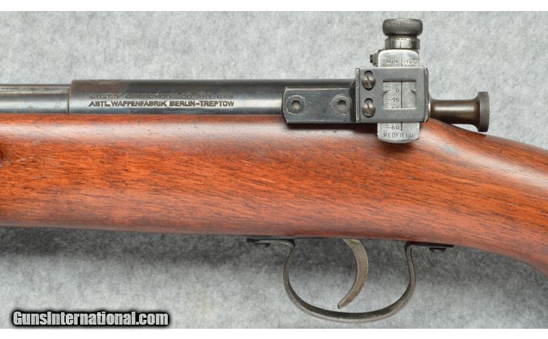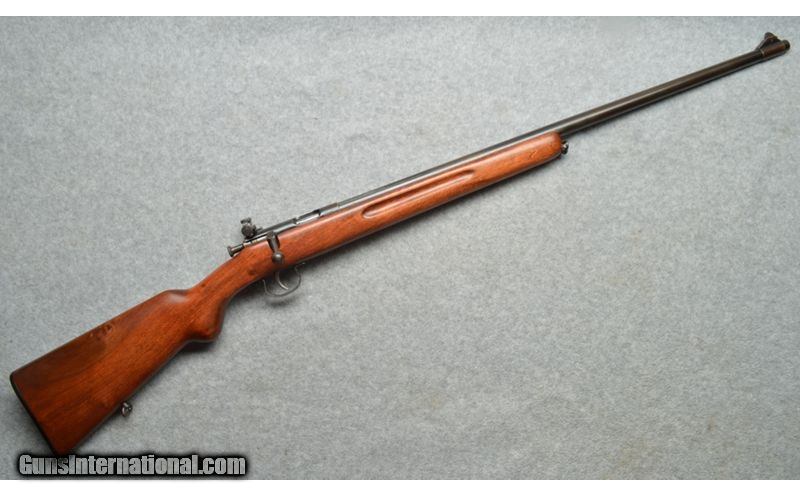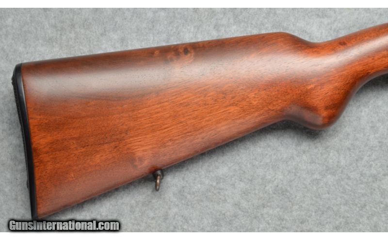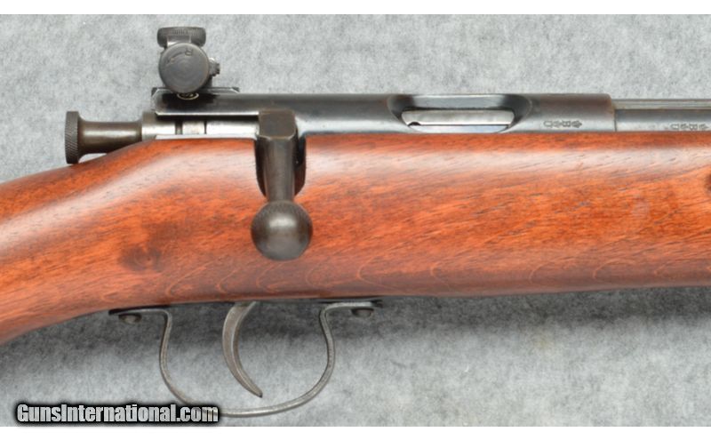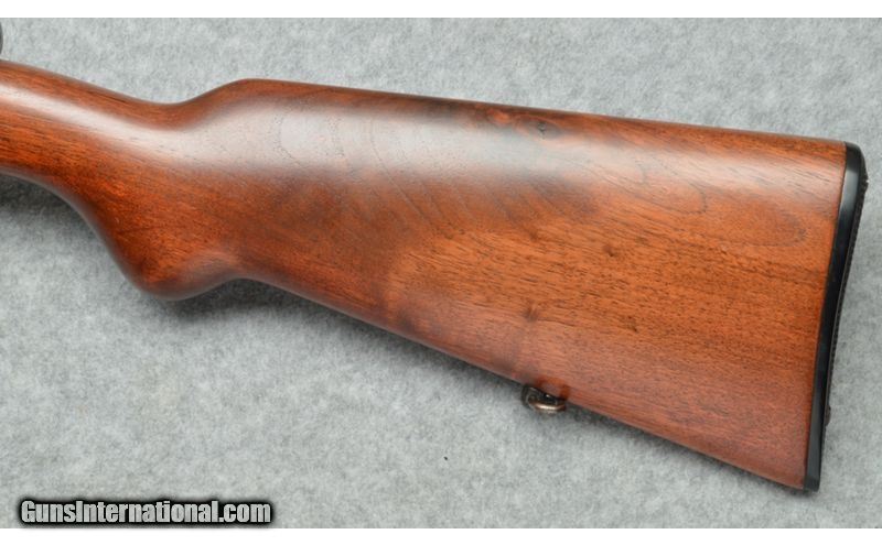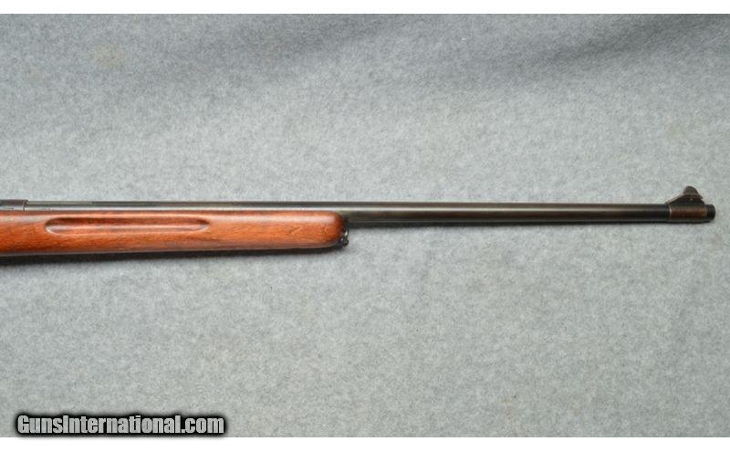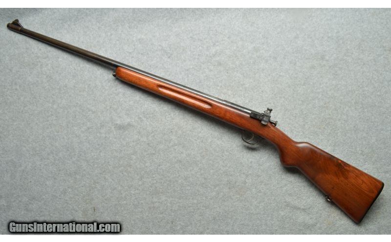 Description: .22 Long Rifle SOLD Chambers: "Bolt action, single shot target rifle. Metal Condition: "Good, bluing is faded in several places. Wood Condition: "Very good, one minor ding and several very small surface scratches. Barrels: 27 inch medium heavy round rifled barrel. Triggers: Two stage trigger. Stock Dimensions: 13 3/4 inch length of pull. Fore End: Smooth fore-end has finger grooves on both sides and is integrated with the stock. Butt Pad: Black checkered synthetic butt plate. Sights: "Blade front sight, Redfield rear peep sight adjustable for elevation and windage. Item Location: Berlin |