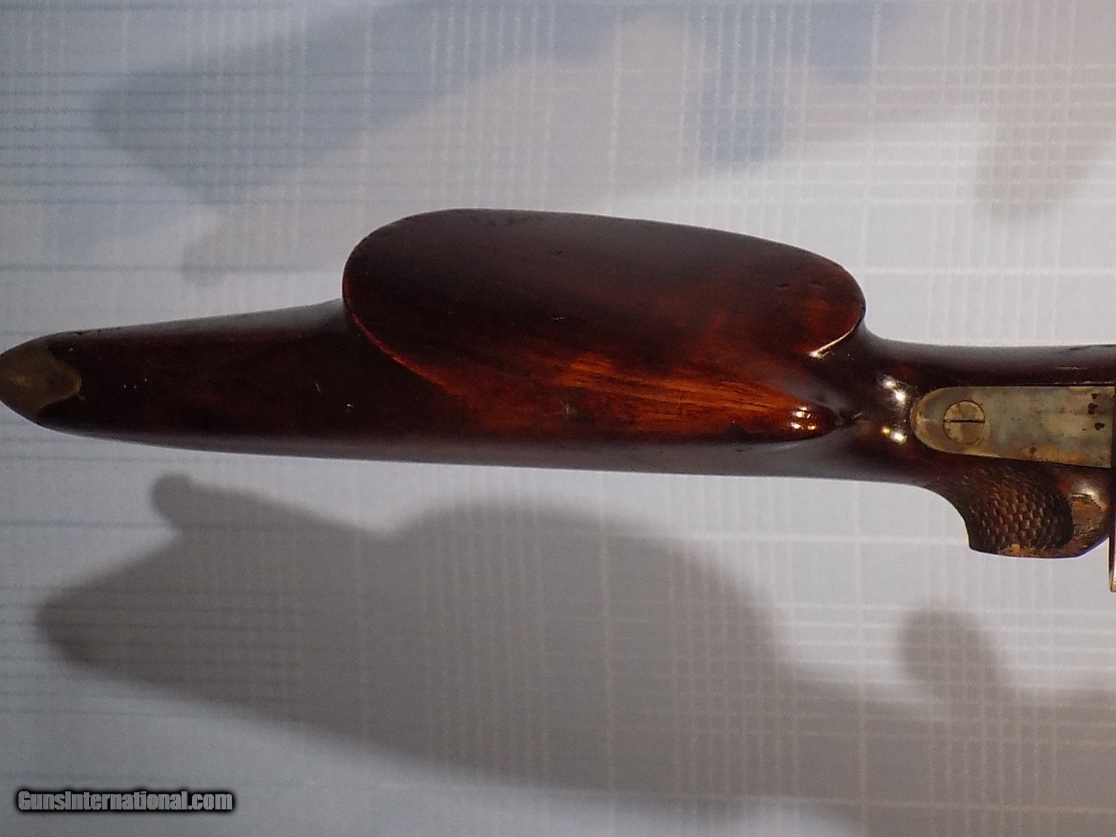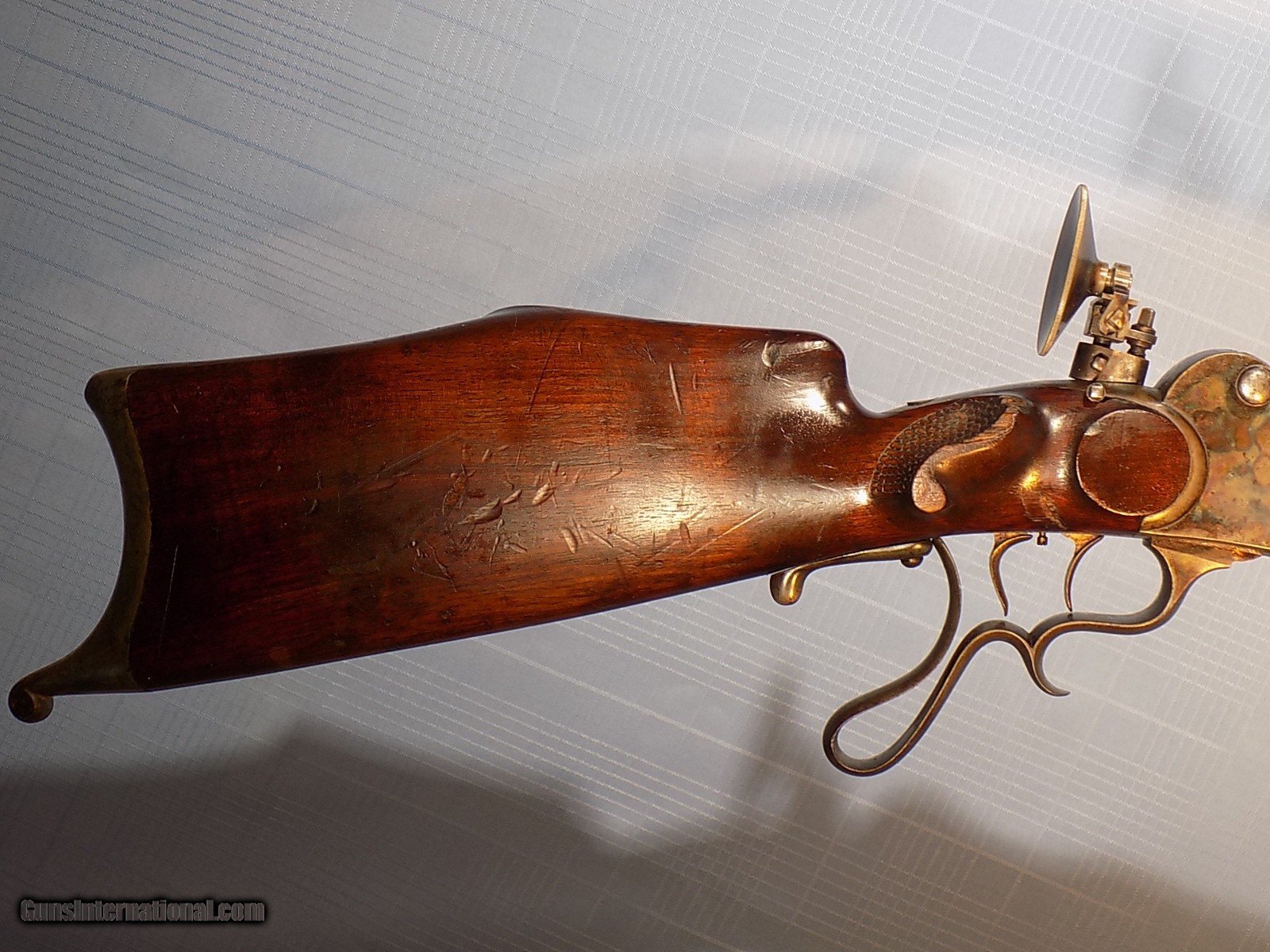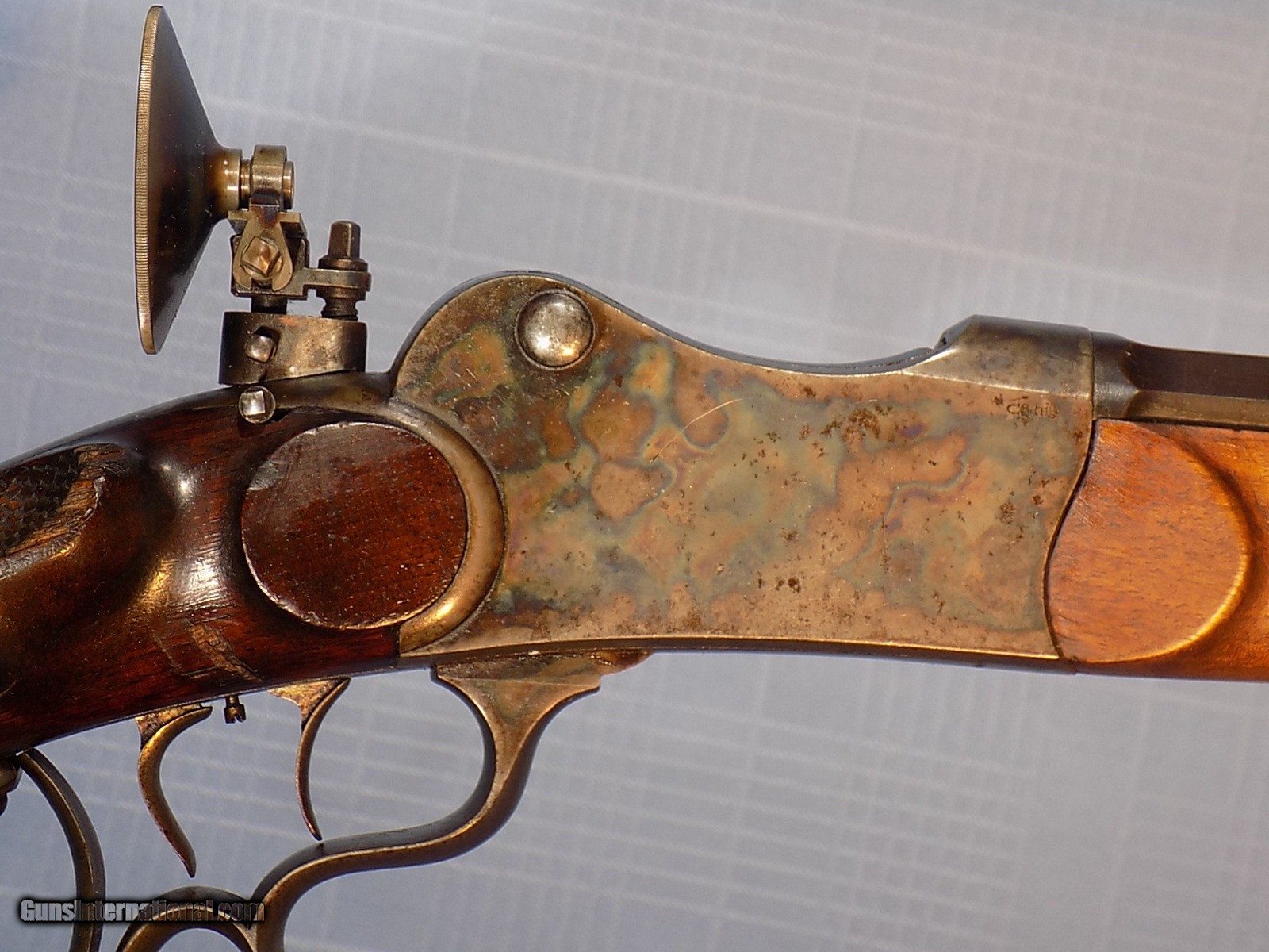 Description: #2591A P. OBERHAMMER GERMAN SCHUETZEN RIFLE, 9.3 cal., 29 1⁄2 bbl., Martini style action, large Schuetzen tang sight, adjustable pinhead Schuetzen front sight, DST, Schuetzen lever, cheek rest & buttplate, marked on top of bbl. Oberhammer KGL, Bayr. Hofruchsenmaucher, Muchin , exc. bore, 95% casehardening, 97% bbl. blue, good wood, quick lever release lower tang, sling swivel eyelets. $1500 SOLD Antique: Yes |