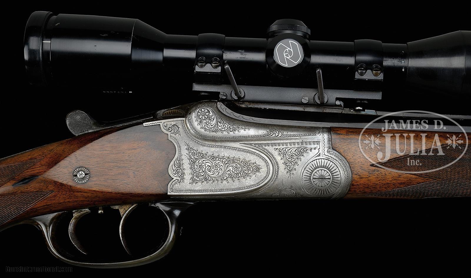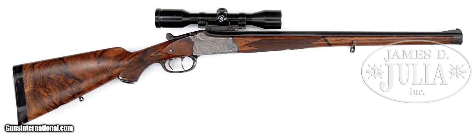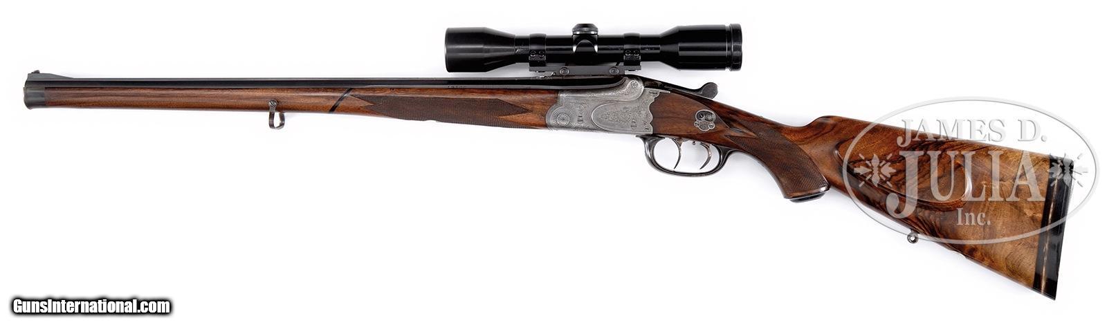 Description: "STAHL & BERGER" SINGLE SHOT KIPLAUF WITH SCOPE SN # 13706. Cal. 7x57R. 21-1/2" Tapered octagon bbl with full length intergral rib is fitted with flip-up rear sight, and silver bead front sight with flip-up "moon" bead in short ramp. Rear portion is fitted with slip-on dovetail for scope. Rib is engraved; "Stahl & Berger, Hamburg". Coin finished, scallop-backed, boxlock action has crossbolt third fastener, reinforcing bolsters, Greener type side safety, and dbl set triggers. It is engraved with varying size scroll with floral highlights. Trigger guard is of horn. Finely marbled and nicely figured European walnut horn capped pistol grip buttstock measures 13-3/4" over ribbed horn buttplate over 5/8" spacer. Stock features inlet lozenge shaped horn drop points,point pattern checkering, small shallow line right hand cheekpiece, and sling eye, as well as vacant silver oval, on toe line. Forestock extends to muzzle with horn cap. Removable portion has Deeley release. Ziess Diatal - C 4X Scope with duplex reticle is in slip-on custom rings. Coin finished action is untouched, bbl retain nearly all of original satin blue, and stocks retain all of hand rubbed oil finish. Bore is fine. Action is tight. Optics are clear and bright. Amazing condition for 90 year old gun. SOLD Manufacturer: "STAHL & BERGER Model: Single Shot Kiplauf With Scope Serial Number: #13706 Caliber Info: 7x57R Condition: VERY GOOD Metal Condition: VERY GOOd Wood Condition: EXCELLENT Bore Condition: EXCELLENT Barrels: VERY GOOG Barrel Type: Tapered Octagonal Action: Boxlock Triggers: Dbl Set Stock: European Walnut Stock Dimensions: 21-1/2 Stock Comb: Approx. 1-9/16 Stock Heel: Approx. 3 Stock Cast: Shallow line right hand cheekpiece Fore End: Two piece/Extends to muzzle with Horn Cap Butt Pad: Horn LOP: 13-3/4 Rib: Full Finish: Metal/Coin-Wood/Oil Weight: 6lbs. 2oz. w/o Scope Sights: Silver bead front w/flip-up "moon" bead-flip-up rear Manufacture Date: 1928 Engraving: Scroll/Floral Item Location: Georgia, USA |