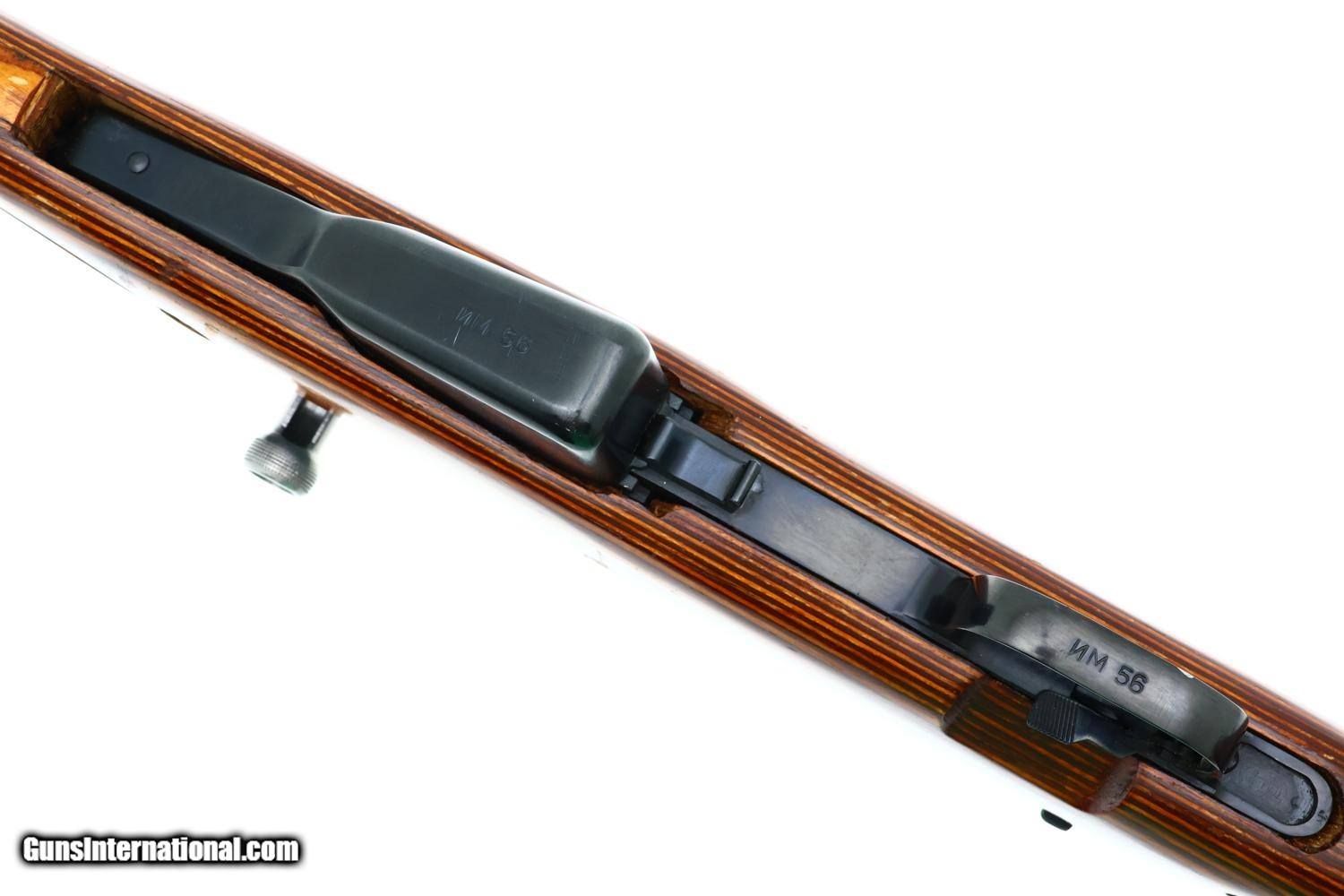 Standard configuration and all-matching Russian made Izhevsk SKS semi-automatic rifle in 7.62x39mm caliber, manufactured 1953, SN:56, with 20.5-inch barrel, height-adjustable post front sight and tangent rear sight graduated 1-10 for range. Top of receiver bridge marked w/ Izhevsk arrow in a triangle within a circle and year marking 1953 followed by Cyrillic "r". The right side of receiver shows serial number "56" with additional Cyrillic markings, proofs, and very faint import marks on the barrel. Fitted with laminated hardwood stock, full matching SN on left side, military-style finish, and blued metal trapdoor buttplate. Ten-round fixed magazine with hinged floorplate for stripper clip loading and folding spike-bayonet.