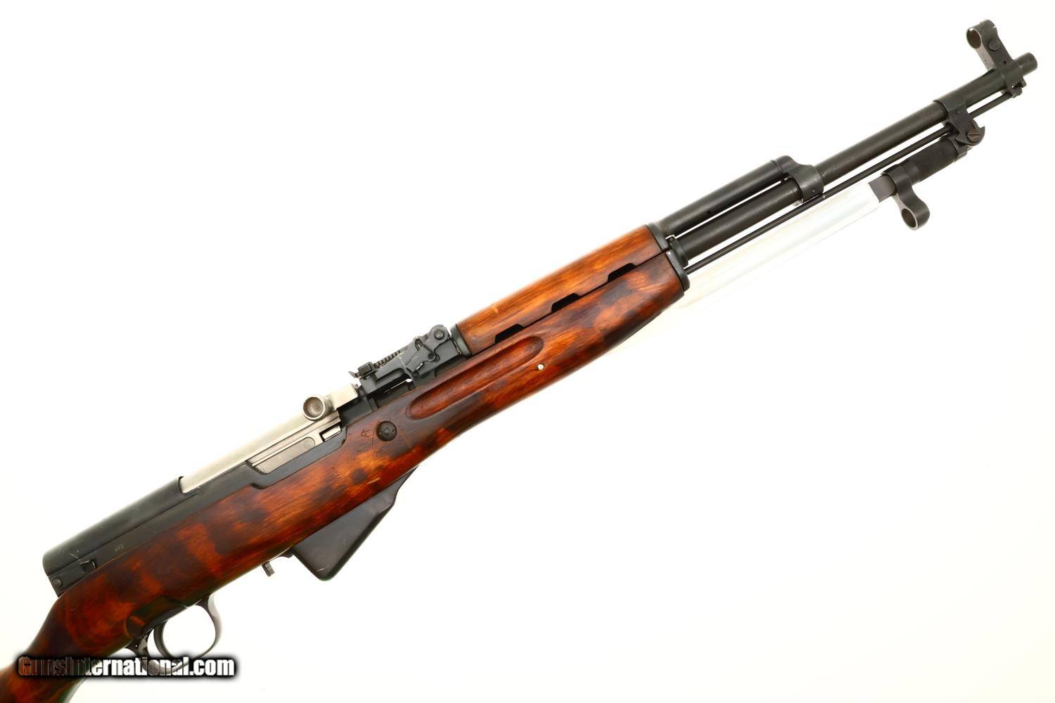 Standard configuration and all-matching Russian made Tula Arsenal SKS semi-automatic rifle in 7.62x39mm caliber, manufactured 1953, SN:56, with 20.5-inch barrel, height-adjustable post front sight and tangent rear sight graduated 1-10 for range. Top of receiver bridge marked w/ Tula Arsenal arrow w/in 5-pointed star and year marking 1953 followed by Cyrillic "r". The right side of receiver shows serial number "492" with additional Cyrillic markings, proofs, and very faint import marks on the barrel. Fitted with hardwood stock, arsenal marking, year of production and full SN on left side of buttstock, military-style finish, and blued metal trapdoor buttplate. Ten-round fixed magazine with hinged floorplate for stripper clip loading and folding spike-bayonet.