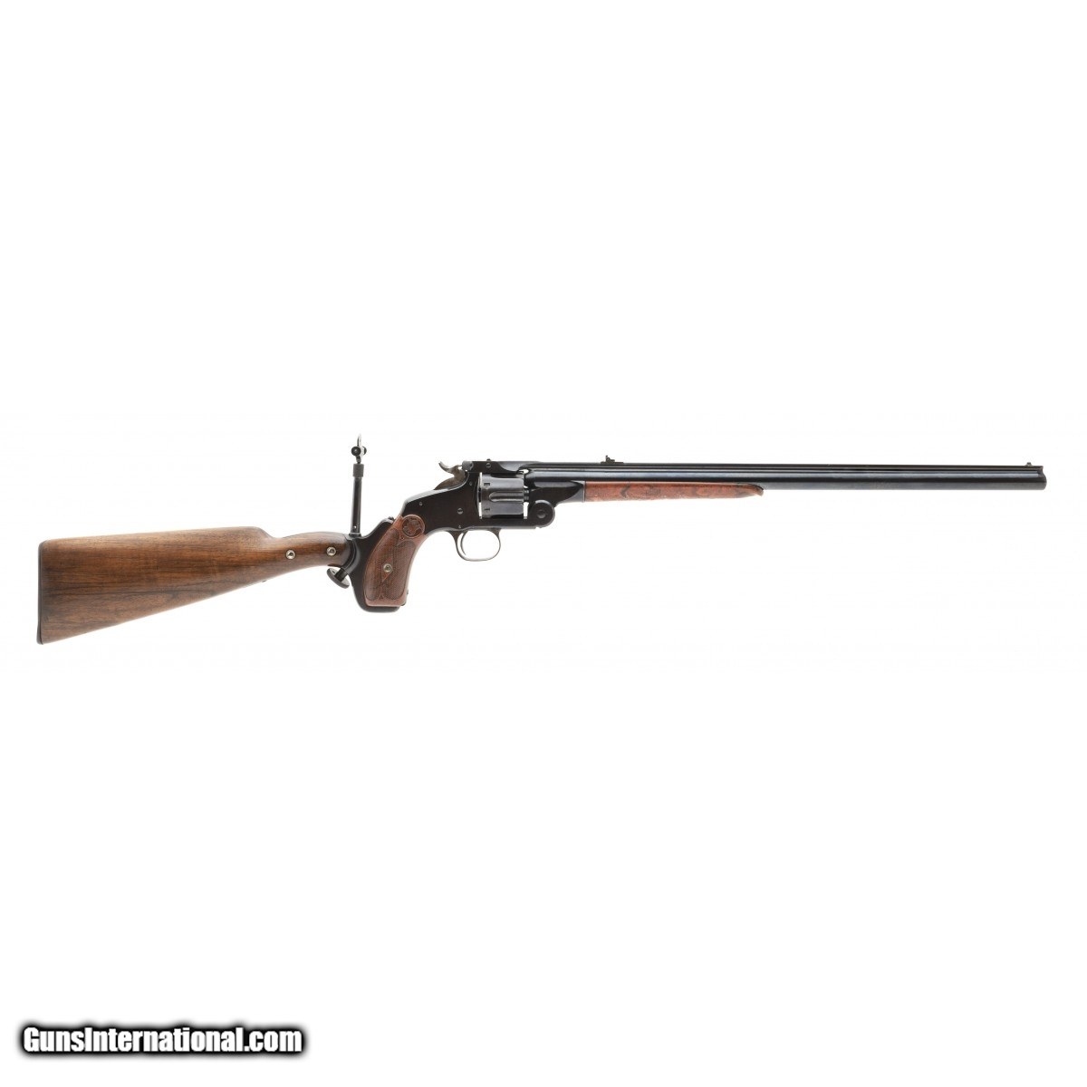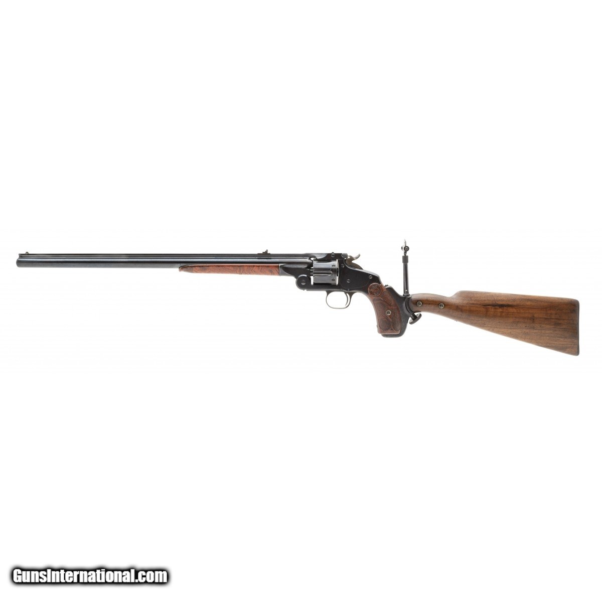 Very rare revolving rifle with detachable shoulder stocker. Barrel is 16"". Bore is excellent. Action works perfectly and locks up on time. Forend and grip are of the burnt orange and black matrix and are original to the gun. Right side pistol grip has a very small chip on the underside at the toe. (You have to turn the gun upside down to see it. Very minor!) The shoulder stock is excellent and so is the Smith & Wesson butt plate. The rear sight on the shoulder stock is perfect and extends perfectly and diopter at top folds correctly. Elevation is adjustable by turning the knurled knob at the top of the post. Note: The stocks are usually damaged when one finds these rare 320 revolving rifles! A very fine example.