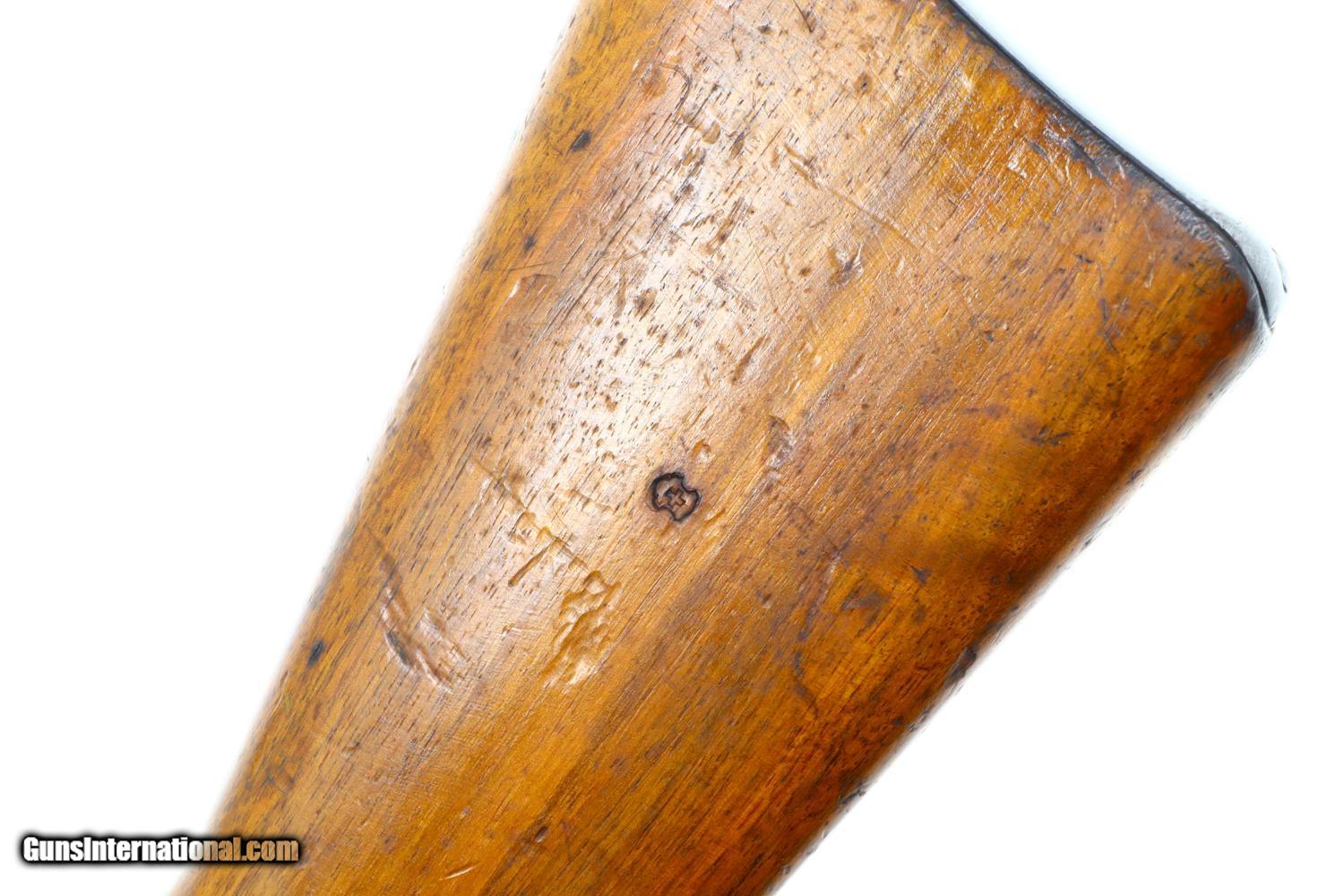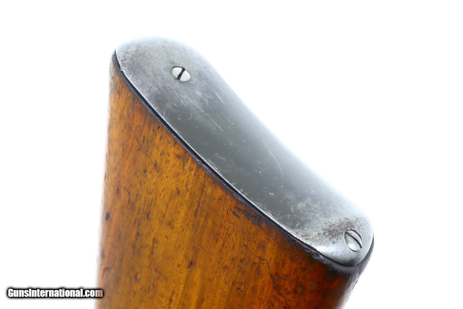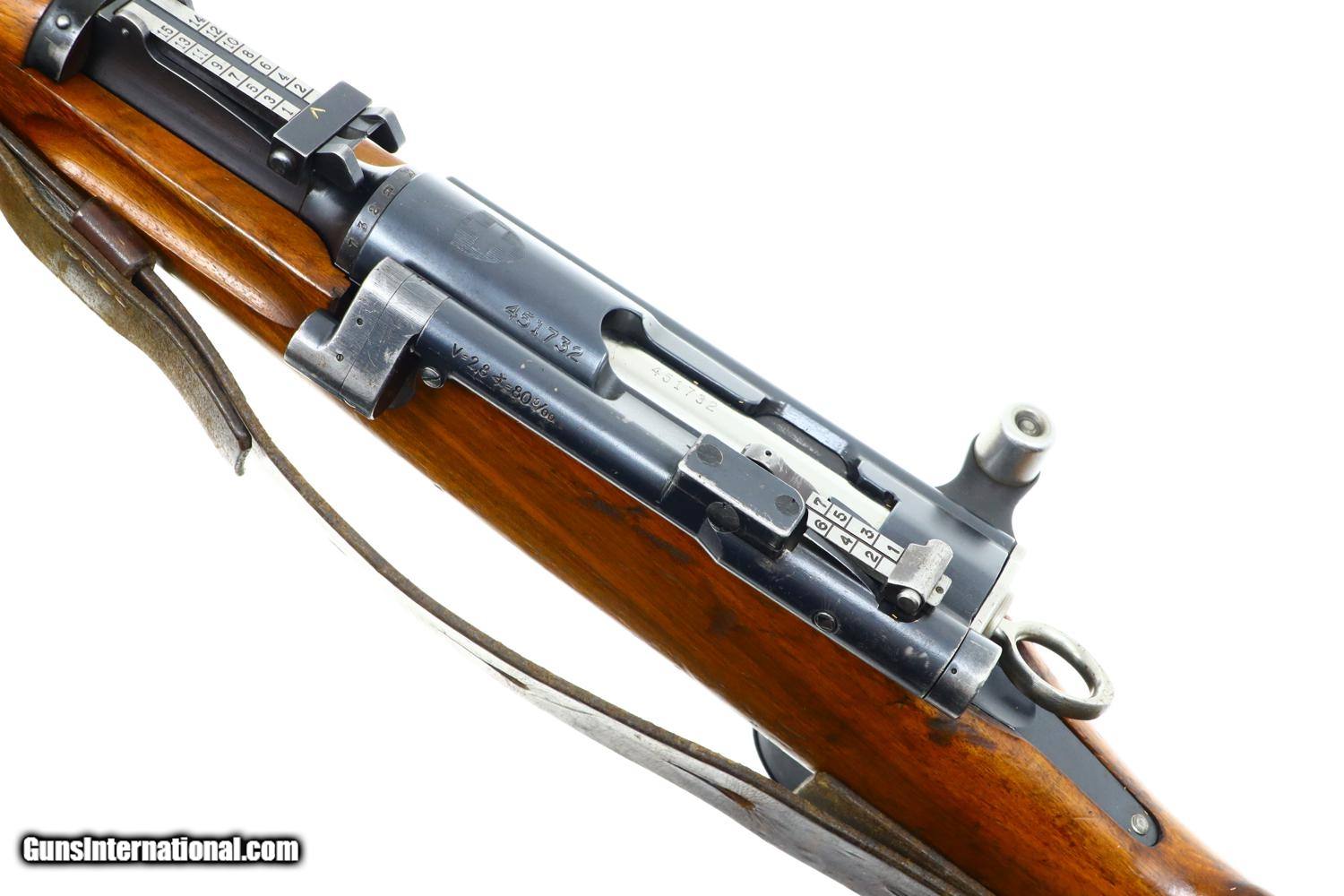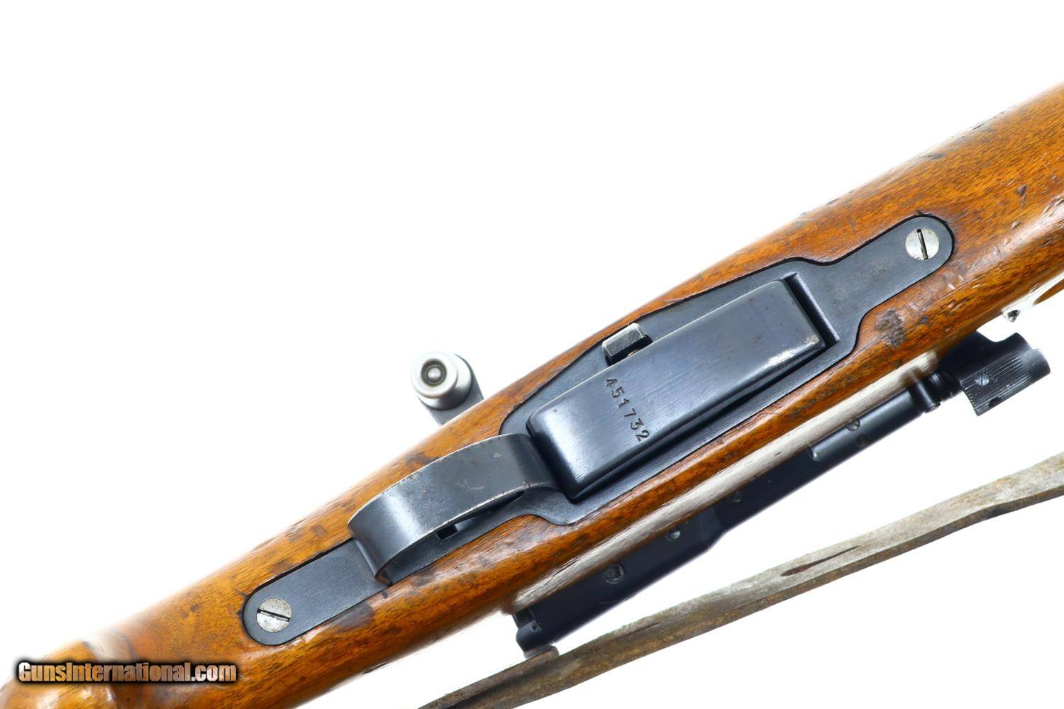 Description: Scarce Swiss Military sniper rifle, based on the K31, this the more desirable variation with the 2.8 power scope. Standard configuration sniper with full serial number on the receiver, bolt, and magazine, the last three digits repeated on the barrel. The left side of the scope marked with the power. Vertically adjustable ramp, graduated 1-7. Import markings under barrel above stacking rod. Brass muzzle cover. Correct sling dated “1946”. Synopsis: Bern, K31-43, Swiss Military Sniper Rifle, Matching, 7.5x55. Condition: VG original finish with finish wear and scattered handling marks as one might expect from a sniper rifle that has seen moderate field use. Hazy optics as typical for the K31-42 and K31-43, the reticle bar functioning properly. Comparable condition sling. Mirror bore. Perfect manual mechanics. One of the scarcest Swiss sniper rifles, much rarer than the K31-42, seldom offered for sale. ~~Insured shipping fee of $50; most packages shipped using FedEx 2nd Day.~~ SOLD Curio/Relic: Yes Manufacturer: Bern Serial Number: 451732 Caliber Info: 7.5x55 |