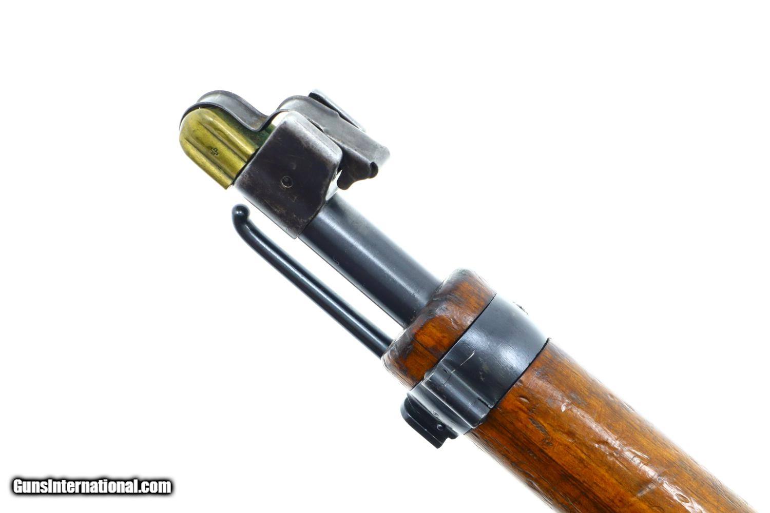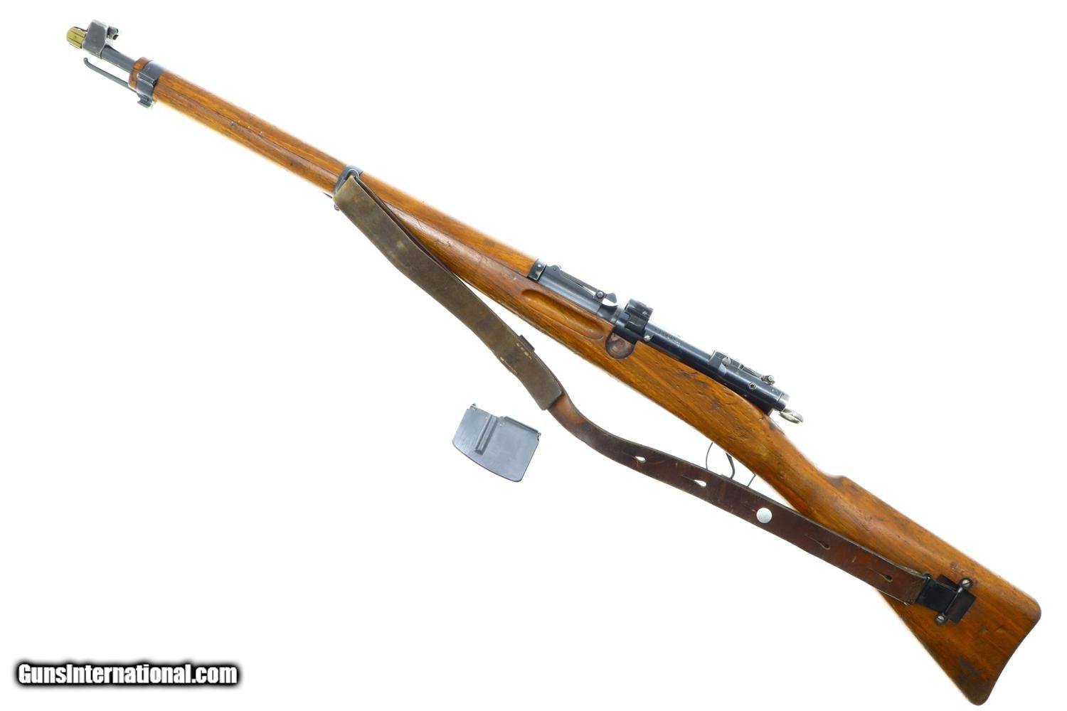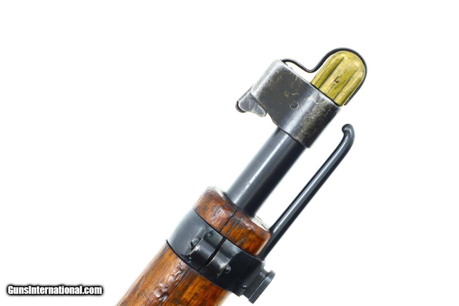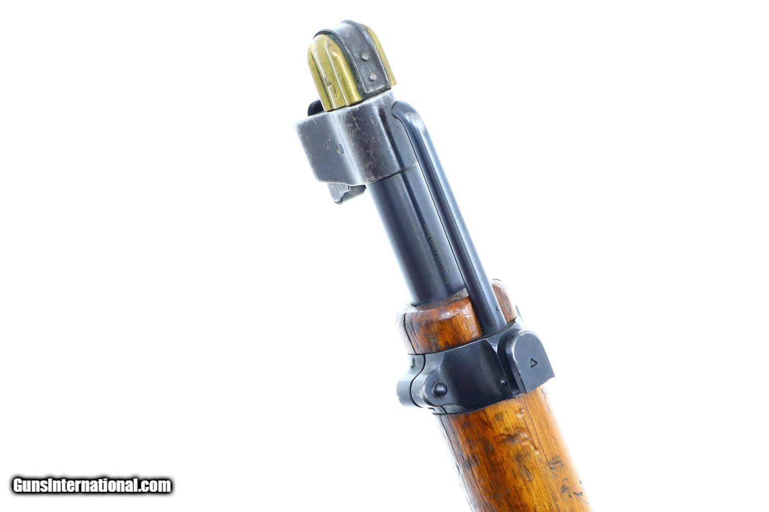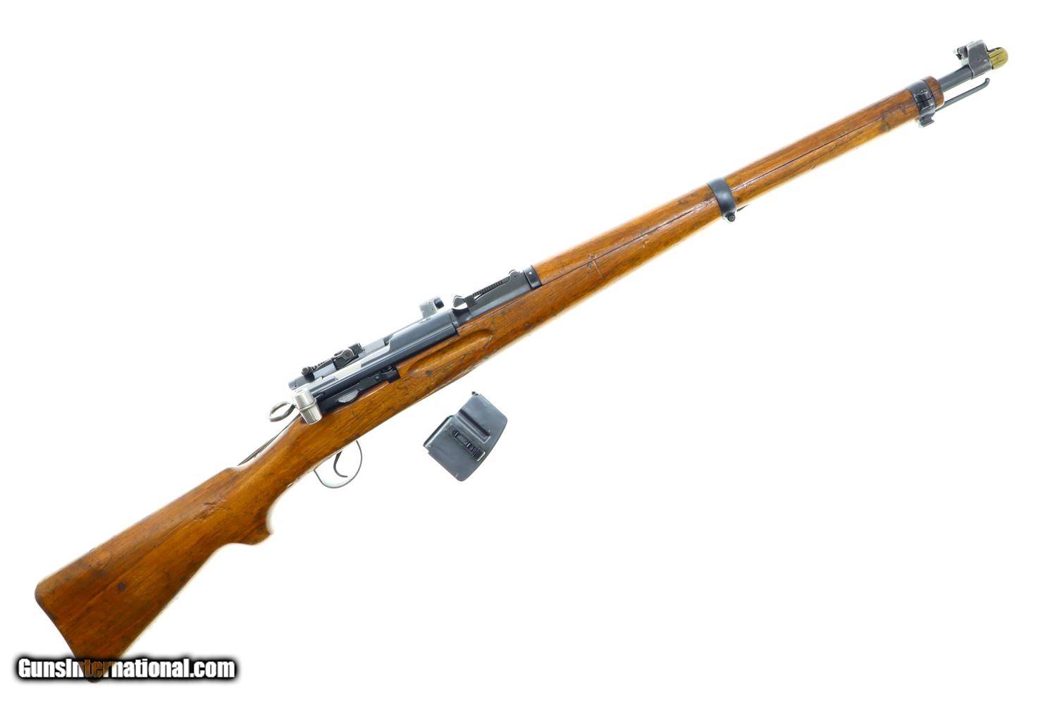 Description: Scarce Swiss Military sniper rifle, based on the K31, this the more desirable variation with the 2.8 power scope. Standard configuration sniper with full serial number on the receiver, bolt, and magazine, the last three digits repeated on the barrel. The left side of the scope marked with the power. Vertically adjustable ramp, graduated 1-7. Import markings under barrel above stacking rod. Brass muzzle cover. Correct sling dated “1946”. Synopsis: Bern, K31-43, Swiss Military Sniper Rifle, Matching, 7.5x55. Condition: VG original finish with finish wear and scattered handling marks as one might expect from a sniper rifle that has seen moderate field use. Hazy optics as typical for the K31-42 and K31-43, the reticle bar functioning properly. Comparable condition sling. Mirror bore. Perfect manual mechanics. One of the scarcest Swiss sniper rifles, much rarer than the K31-42, seldom offered for sale. ~~Insured shipping fee of $50; most packages shipped using FedEx 2nd Day.~~ SOLD Curio/Relic: Yes Manufacturer: Bern Serial Number: 451732 Caliber Info: 7.5x55 |