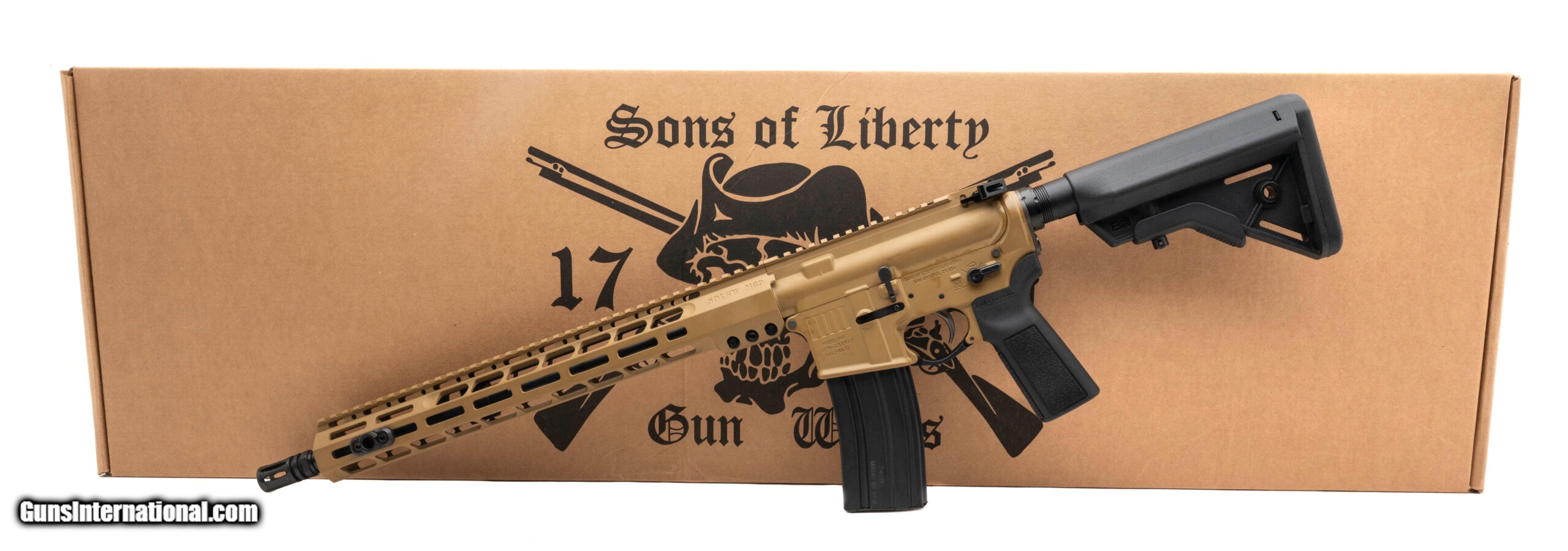 Description: "Sons Of Liberty Gun Works M4 89 Rifle. 5.56 NATO with an 16"" barrel. Semi-automatic rifle with an Anodized Tiger brown finish, an Liberty Fighting Trigger, Vltor A-5 Buffer System, and an adjustable stock . New. UPC: SOLGWM48916TGR (STOCK PHOTO) SOLD |