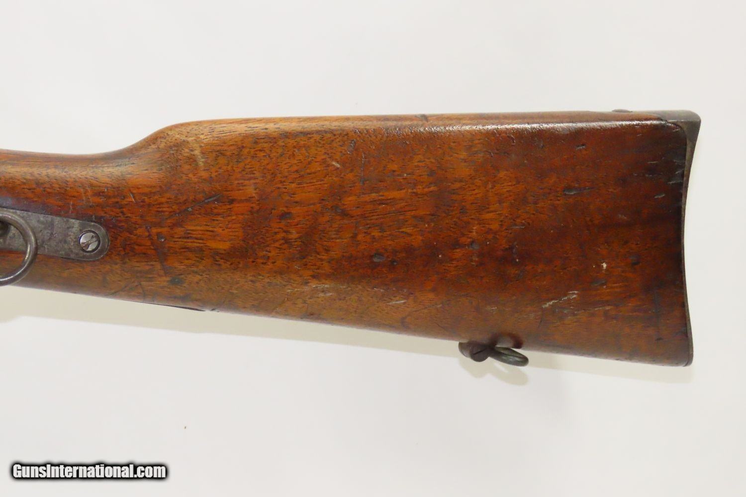 Description: Antique SPENCER REPEATING RIFLE CO. Saddle Ring CARBINE Early Repeater Famous During Civil War & Wild West Here we present an antique Spencer Repeating Rifle Co. Army Model Saddle Ring Carbine, made circa 1863-1865 in Boston, Massachusetts, during the Civil War. These lever-operated, breech-loading rifles were marvels of the time and had a lasting impact on how war was to be fought in the future. Though their service life in the U.S. military was relatively short, the Spencer story includes Christopher Spencer, the inventor of the rifle, demonstrating and shooting with President Abraham Lincoln, who gave his full endorsement of the piece. Supposedly, during the battle at Gettysburg, a captured Rebel that day said one could “load in the morning and fire all day!” This was due to the Spencer’s most endearing quality: a 7-round magazine tube in the butt of the gun. This gave the shooter phenomenal firepower in a day when most soldiers were muzzle-loading single shots or even singly loading their breech-loading carbines. This is one of the iconic carbines of the Civil War and Western Frontier. The Spencer was the world's first military metallic cartridge repeating rifle, and over 200,000 examples were manufactured in the United States by the Spencer Repeating Rifle Co. and Burnside Rifle Co. between 1860 and 1869. The Spencer repeating rifle was adopted by the Union Army, especially by the cavalry, during the American Civil War but did not replace the standard issue muzzle-loading rifled muskets in use at the time. Among the early users was George Armstrong Custer. This Spencer carbine was a shorter and lighter version designed for the cavalry. This piece has been modified during the period of use. The breechblock mechanism has been converted in a primitive way to centerfire. The bore has been bored out to .52 caliber. The muzzle shows that it was turned down a bit and you can see the original sleeve from the first conversion (from the original .52 caliber to .50 caliber). The Stabler cutoff (also from the time of the initial conversion) has been eliminated. The cartridge guide has been removed as well. The barrel band is from a musket and fits a bit loosely. The overall condition is good. Strong action. The barrel has been smooth bored. The walnut stock is solid. An interesting Spencer from the 1860s! Own the original! This is a legitimate antique and not a reproduction. Barrel is 22 inches. Caliber: .52 Centerfire Overall condition as seen in photos. Very Fast. Very Safe. FREE SHIPPING WORLDWIDE. Delivered directly to your door by express mail! Guaranteed AUTHENTIC & Includes CERTIFICATE OF AUTHENTICITY. ancestryguns $2545 #210050 SOLD Antique: Yes |