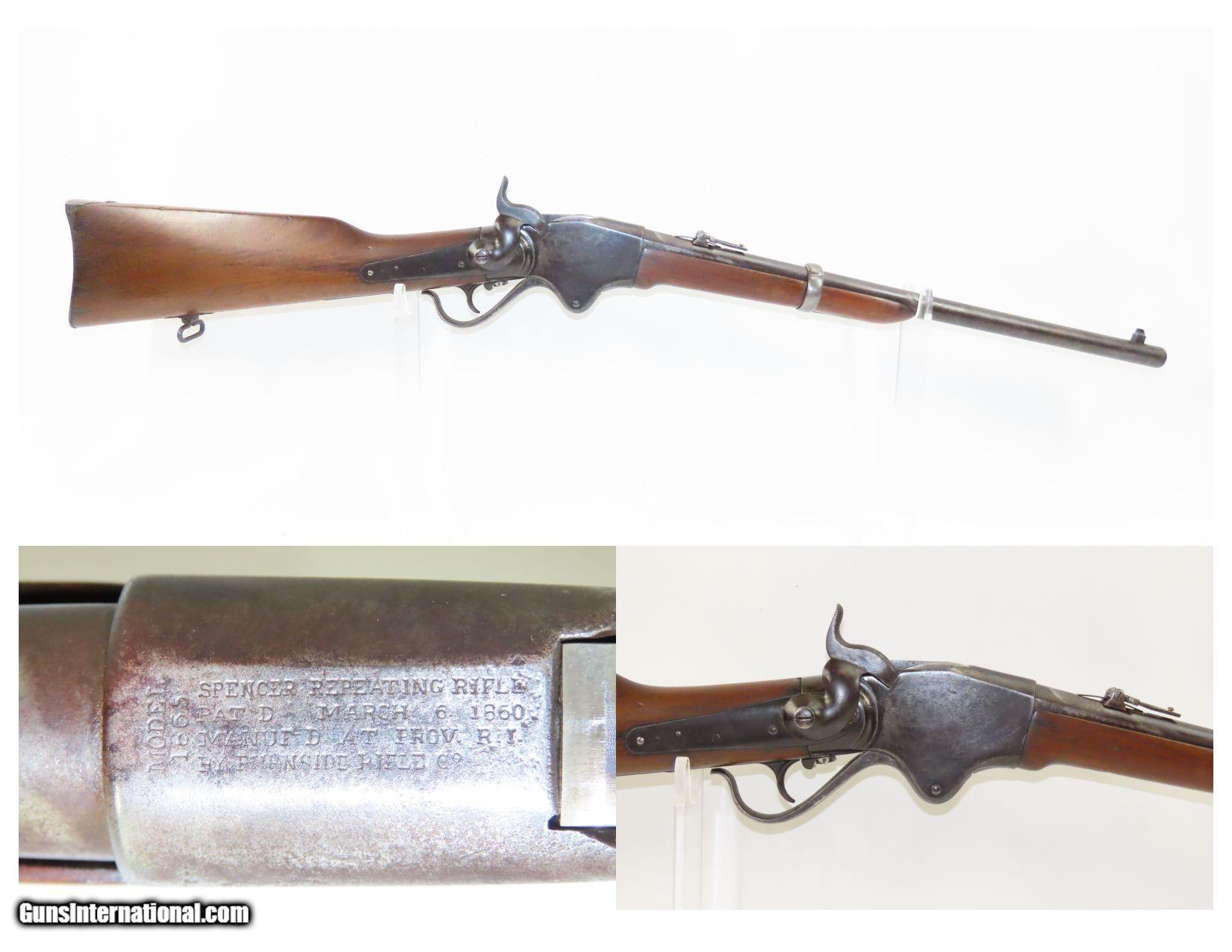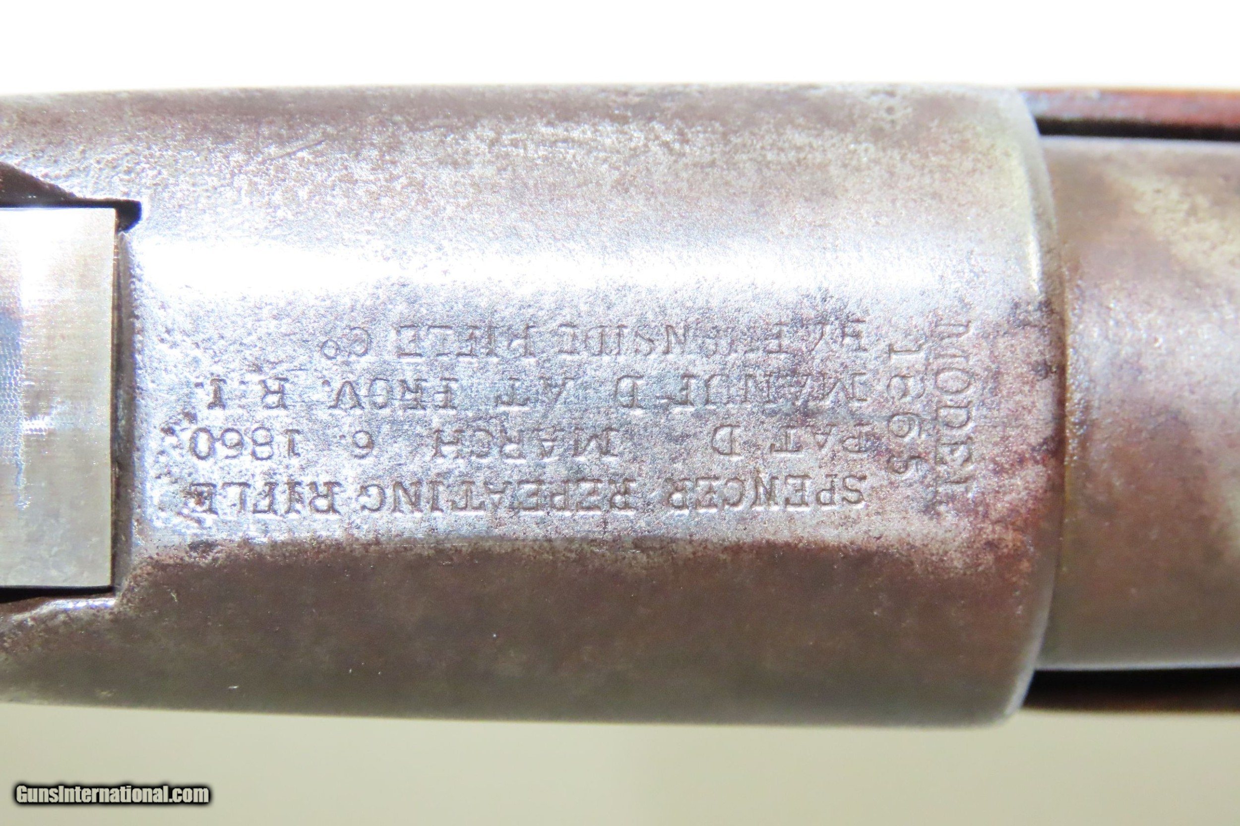 Description: CENTERFIRE! 56-50 SPENCER Antique Model 1865 Saddle Ring CAVALRY CARBINE INDIAN WARS; 1 of 23,000 M1865 Carbines Produced Here we present an antique Spencer Repeating Rifle Co. Model 1865 Repeating Carbine, Chambered for 56-50 Centerfire, made circa 1865 in Boston, Massachusetts, at the end of the Civil War. The Model 1865 carbines were lever-operated, breech-loading rifles that were marvels of the time and had a lasting impact on how war was to be fought in the future. Though their service life in the U.S. military was relatively short, the Spencer story includes Christopher Spencer, the inventor of the rifle, demonstrating and shooting with President Abraham Lincoln, who gave his full endorsement of the piece. Supposedly, during the battle at Gettysburg, a captured Rebel that day said one could “load in the morning and fire all day!” This was due to the Spencer’s most endearing quality: a 7-round magazine tube in the butt of the gun. This gave the shooter phenomenal firepower in a day when most soldiers were muzzle-loading single shots or even singly loading their breech-loading carbines. This carbine has been converted from the original rimfire to centerfire so that it may be fired with modern, reloadable ammunition. This is a fantastic opportunity for the historical enthusiast, re-enactor, or shooter to be able to put rounds down range with a 155 year old cavalry carbine! The overall condition is very good. Even patina throughout. The action is strong. the bore is bright and shiny. The majority of the walnut stock is smooth and solid. There is a bit of a sliver on the left side of the forearm. Here’s a great opportunity to pick up a nice Spencer Carbine that helped to tame the Wild West after the close of the Civil War! Own the original! This is a legitimate antique and not a reproduction. Barrel is 20 inches. Caliber: .50 Spencer (Centerfire) Overall condition as seen in photos. Very Fast. Very Safe. FREE SHIPPING WORLDWIDE. Delivered directly to your door by express mail! Guaranteed AUTHENTIC & Includes CERTIFICATE OF AUTHENTICITY. ancestryguns $2875 #215600 SOLD Antique: Yes |