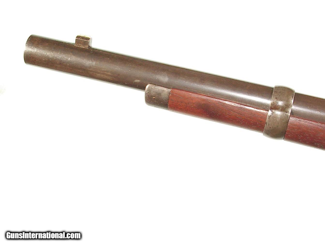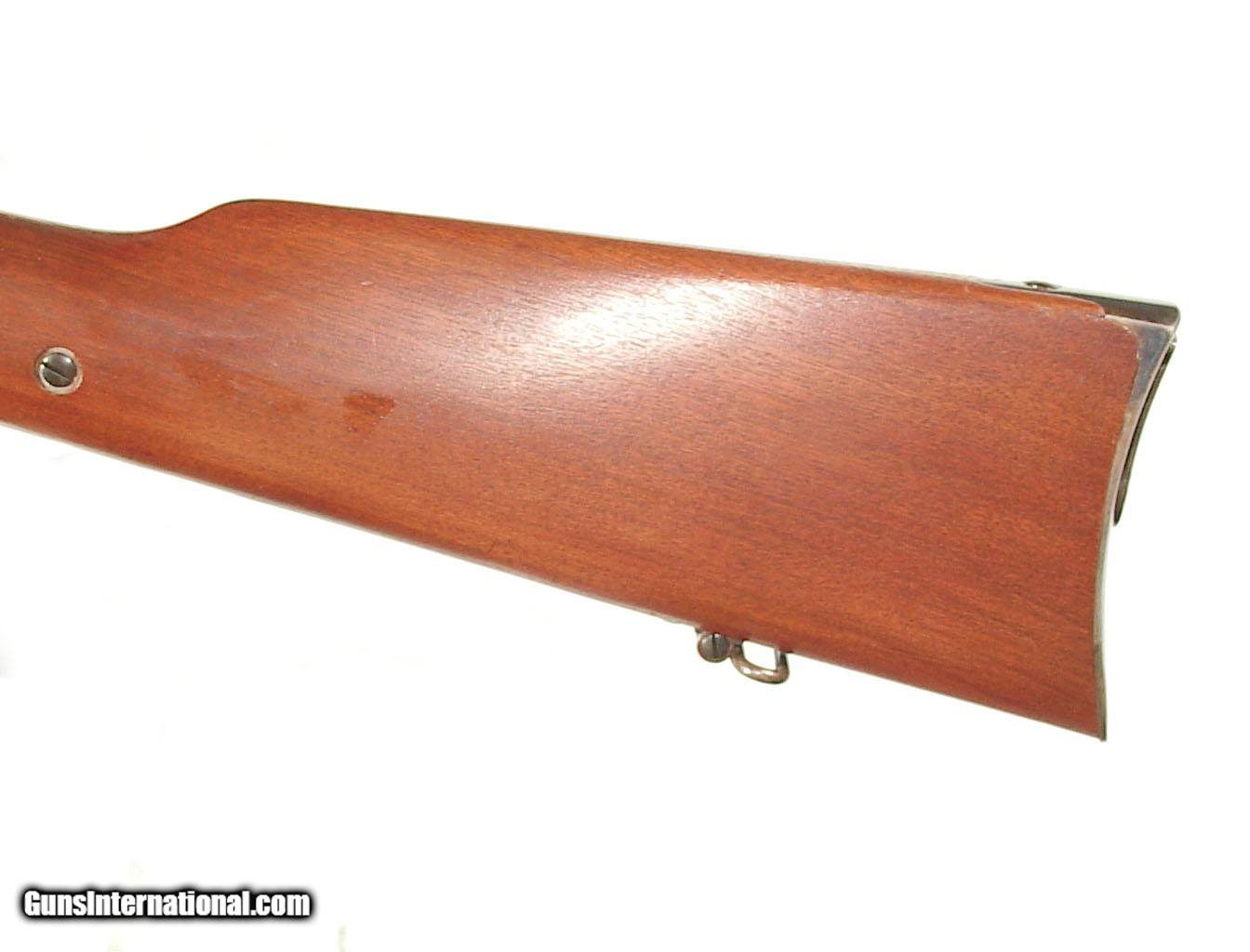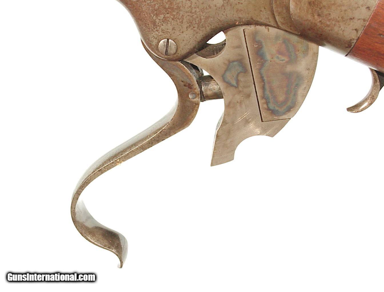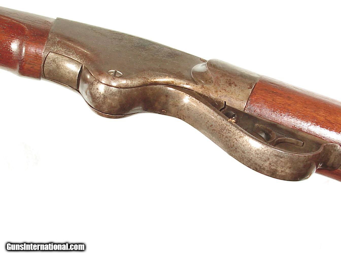 Description: 30" barrel, .52-56 rimfire caliber, lever action breechloading design with external hammer and the 7 shot magazine located in the buttstock. In superb original condition with the barrel retaining nearly all of the blue Strong casehardened finish remaining on the barrel bands and buttplate. The sides of the action show some brown patina mixing with case colors and the interior parts such as the breechlock showing all of the vivid casehardened finish. The wood is as good as I have seen on one of these rifle showing almost no evidence of use. Mint bore. Very low number 4437. SOLD Antique: Yes |