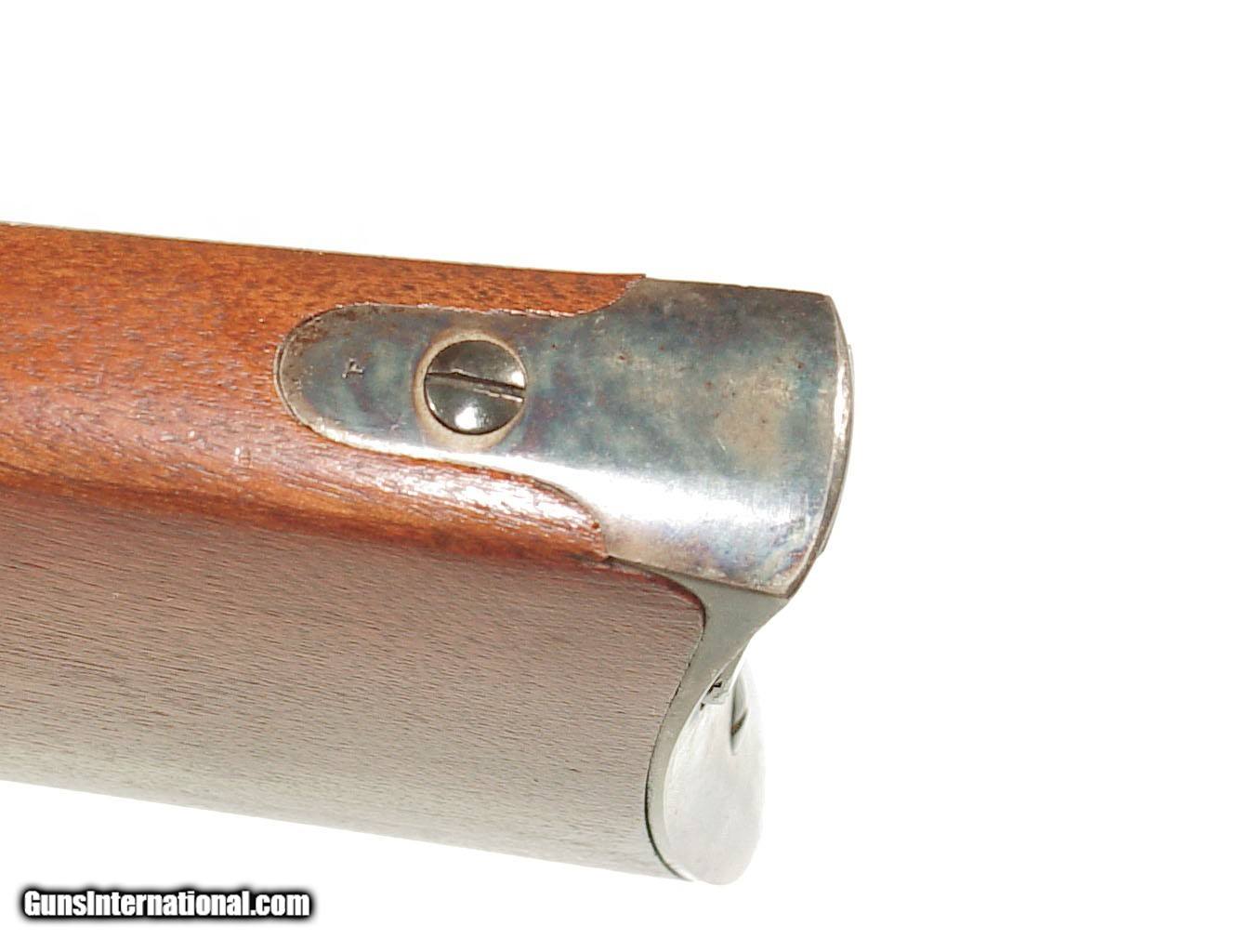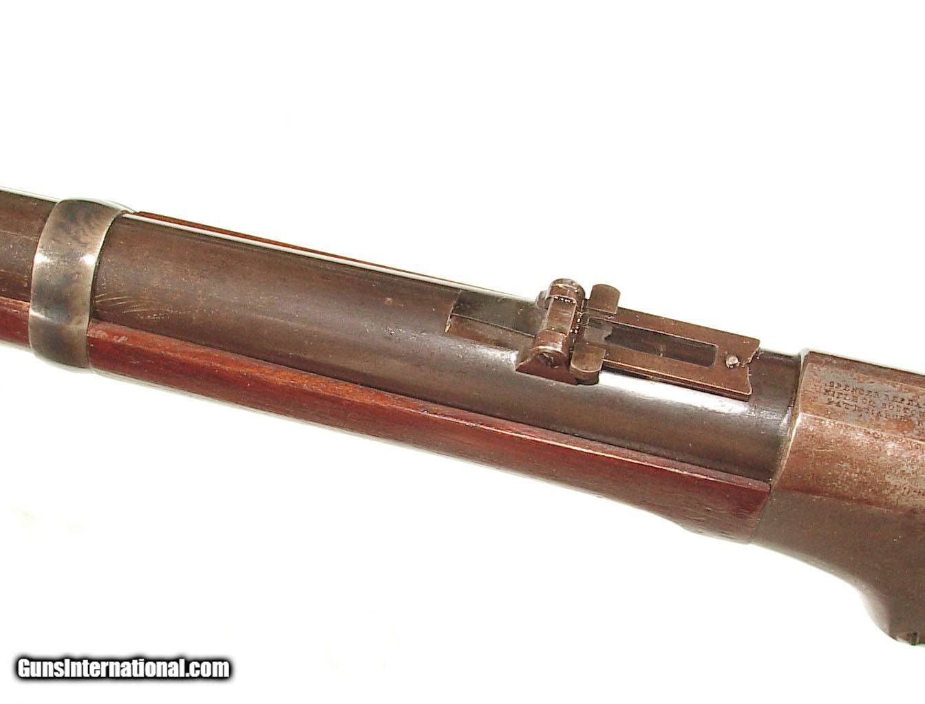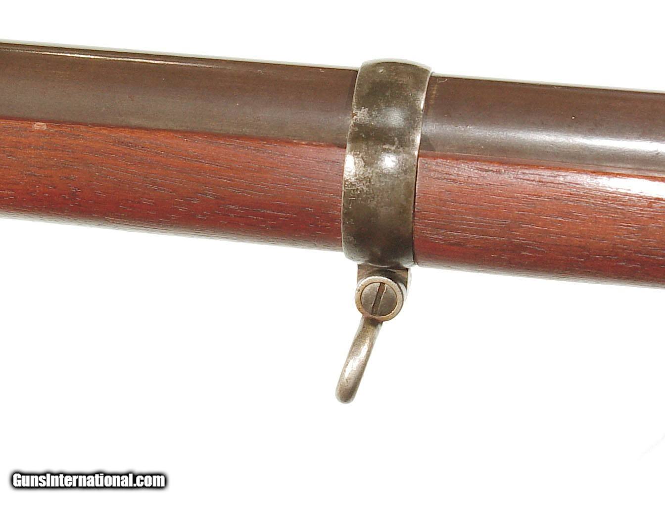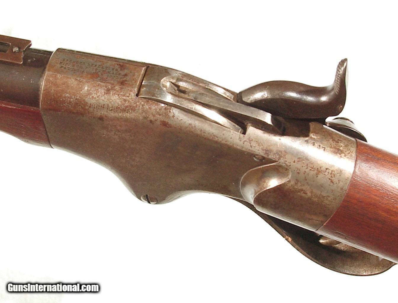 Description: 30" barrel, .52-56 rimfire caliber, lever action breechloading design with external hammer and the 7 shot magazine located in the buttstock. In superb original condition with the barrel retaining nearly all of the blue Strong casehardened finish remaining on the barrel bands and buttplate. The sides of the action show some brown patina mixing with case colors and the interior parts such as the breechlock showing all of the vivid casehardened finish. The wood is as good as I have seen on one of these rifle showing almost no evidence of use. Mint bore. Very low number 4437. SOLD Antique: Yes |