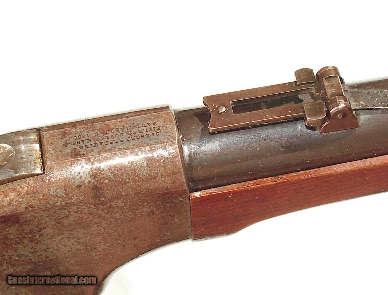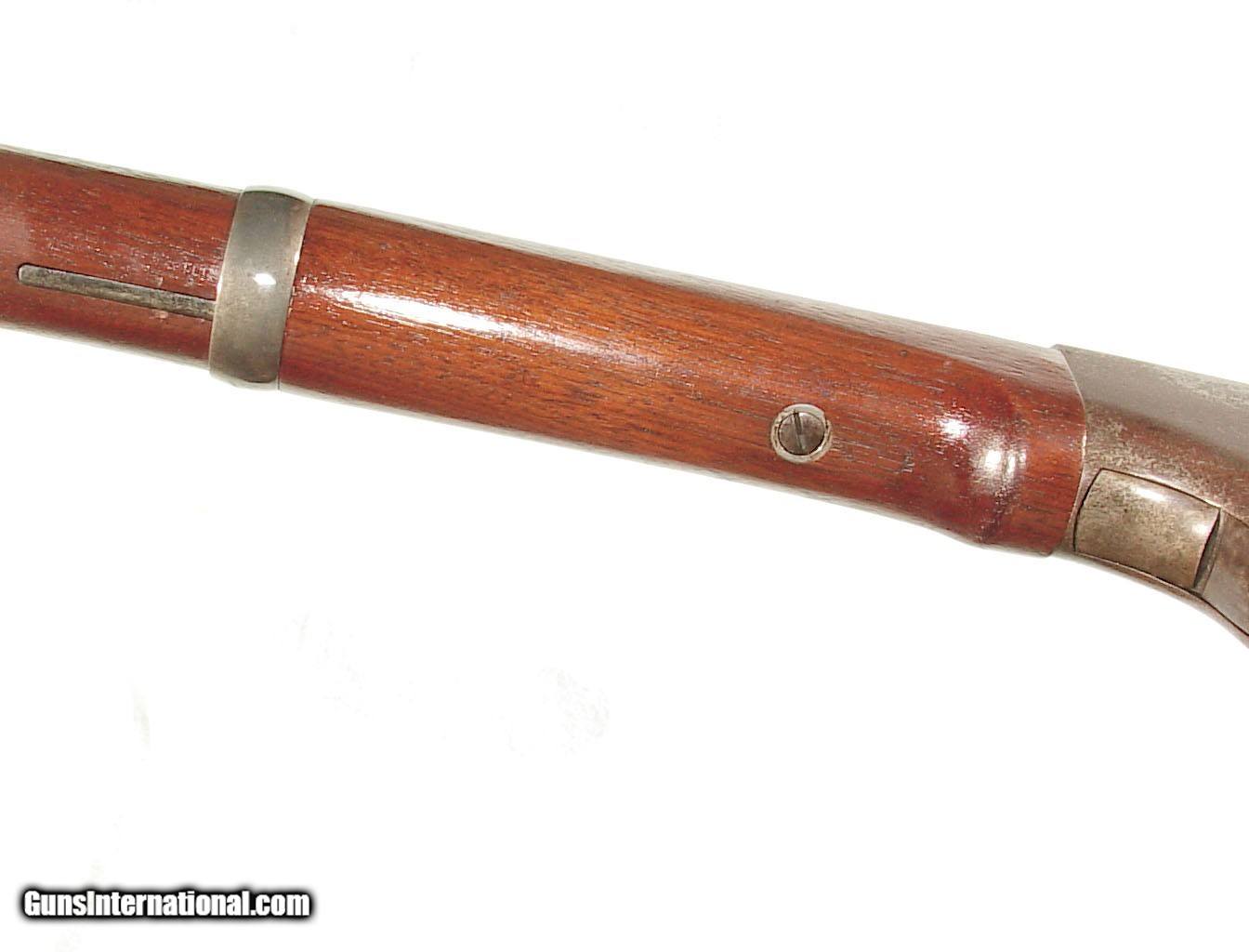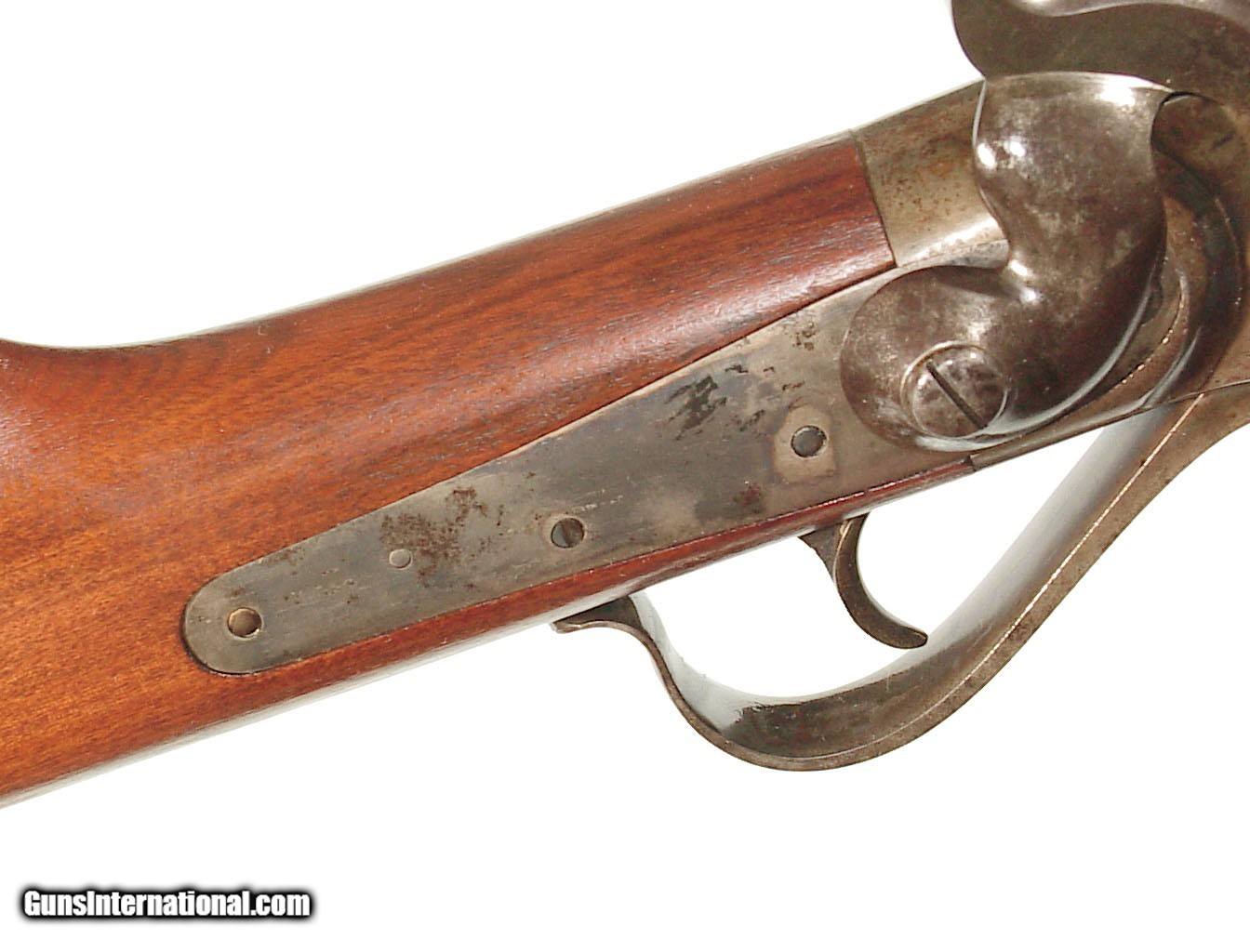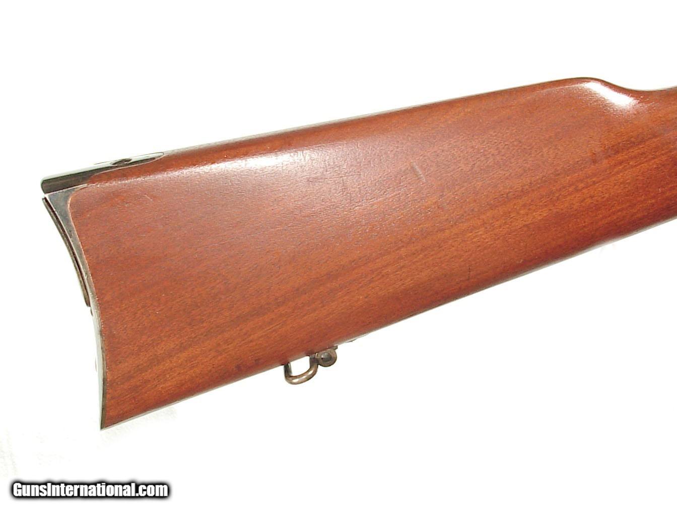 Description: 30" barrel, .52-56 rimfire caliber, lever action breechloading design with external hammer and the 7 shot magazine located in the buttstock. In superb original condition with the barrel retaining nearly all of the blue Strong casehardened finish remaining on the barrel bands and buttplate. The sides of the action show some brown patina mixing with case colors and the interior parts such as the breechlock showing all of the vivid casehardened finish. The wood is as good as I have seen on one of these rifle showing almost no evidence of use. Mint bore. Very low number 4437. SOLD Antique: Yes |