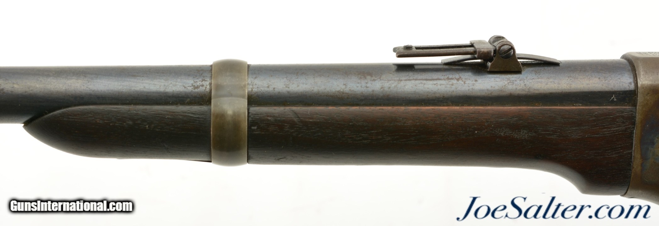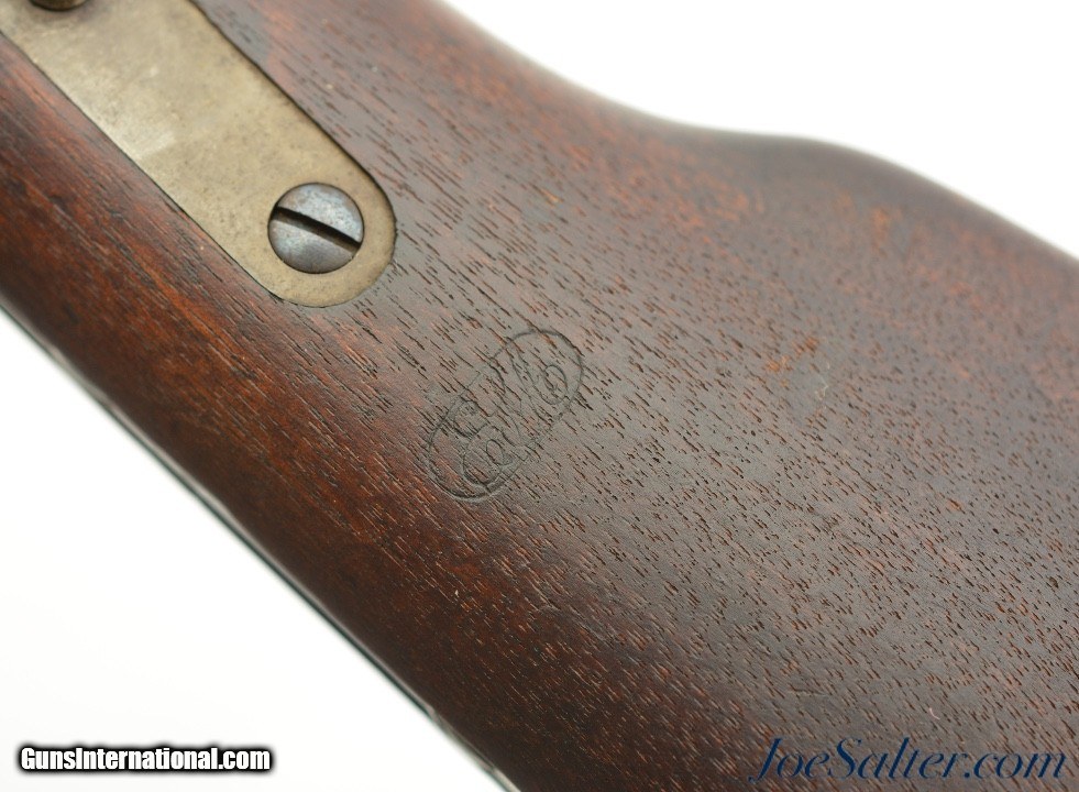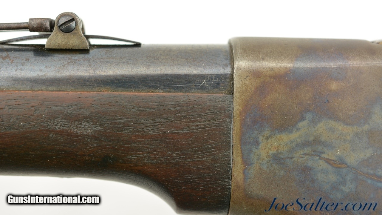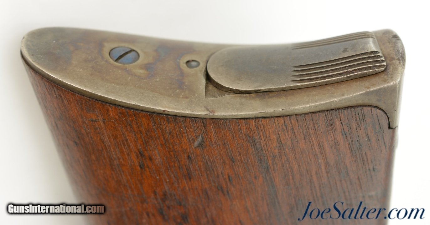 Description: Serial #19774, .50 Spencer RF, 20" barrel with an excellent, bright bore. This is a US-inspected carbine that has matching numbers on the receiver and barrel. The barrel retains 85-90% of the original bright blue, with scattered patches of mild surface freckling present. The frame has a commensurate amount of the original bright color case-hardening that carries over onto the hammer, lockplate, and barrel band. Bright fire blue is still present on the Stabler cut-off switch, some of the screw heads, and the band retainer. The walnut forend and buttstock have only minor handling marks in the otherwise fine original military oil finish, and the "ESA" (Erskine S. Allin) cartouche is crisp and clear on the left side of the wrist. The magazine tube is in very good shape with a functional spring and follower and the mechanism is still tight and fully functional. This is an excellent Indian Wars Spencer overall. Antique; Antique: Yes Price: $7,495.00 Contact Seller |