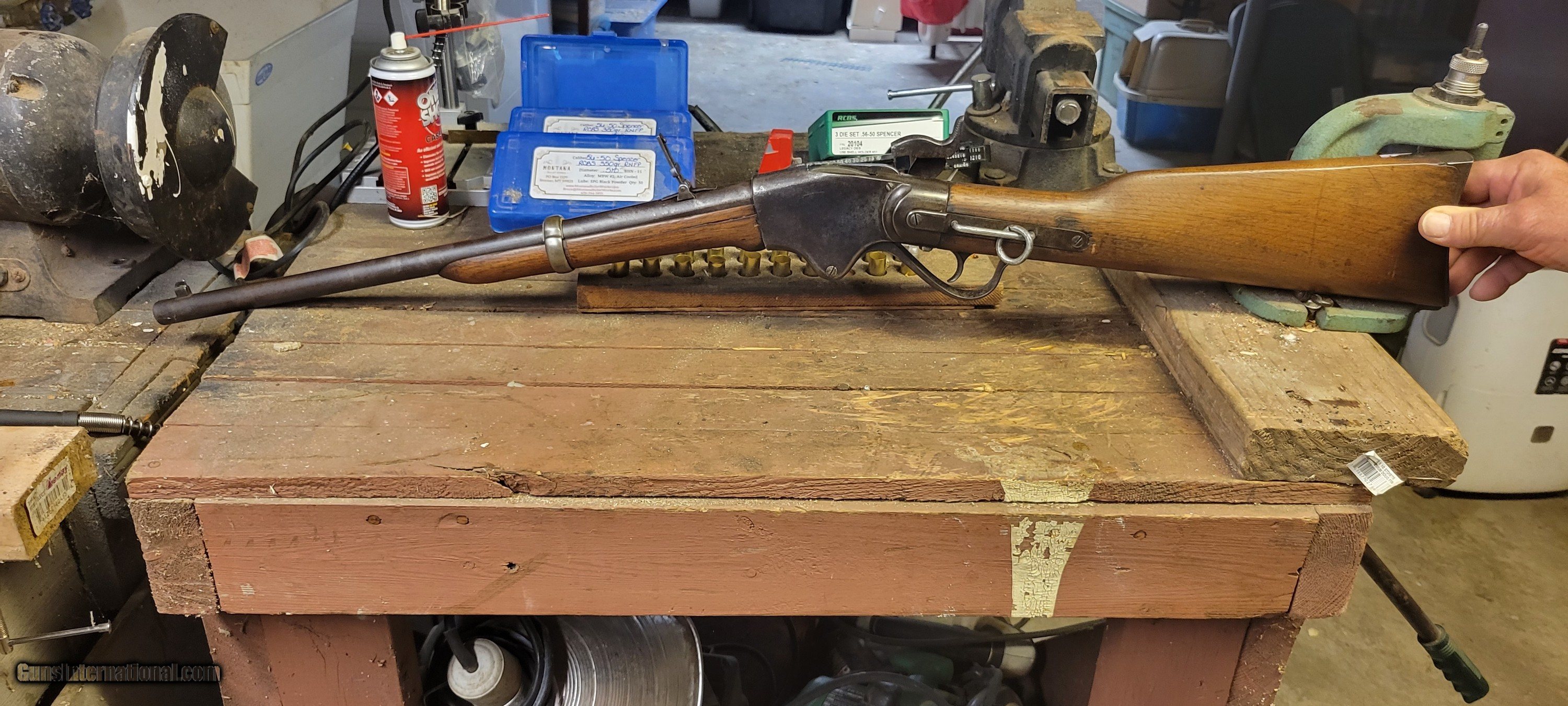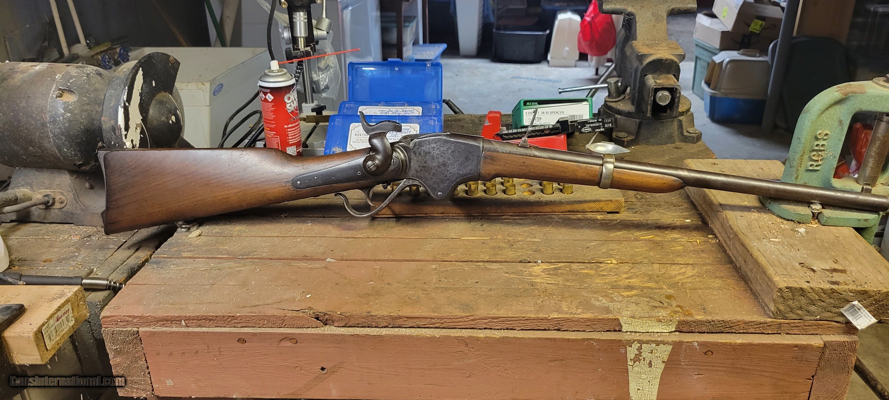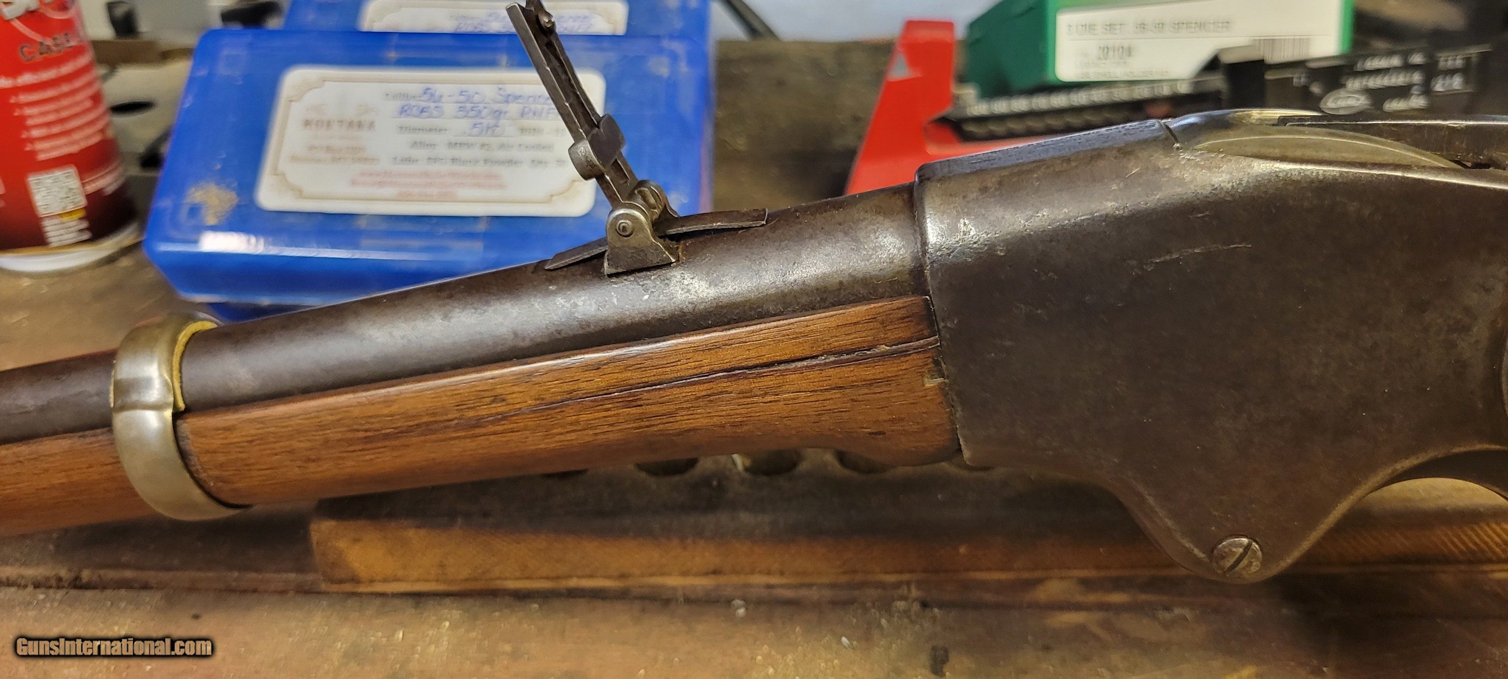 Description: Very nice indian period Spencer. Made in Providence R.I. Works flawlessly. Has cutoff switch. Comes with 2 3/4 boxes of lead, brass, scale and dies and single stage press Wood is excellent very light crack on the handguard (see pics) NEW PRICE CONVERTED TO CENTER FIRE SOLD Antique: Yes Rifle Caliber: .50 Spencer |