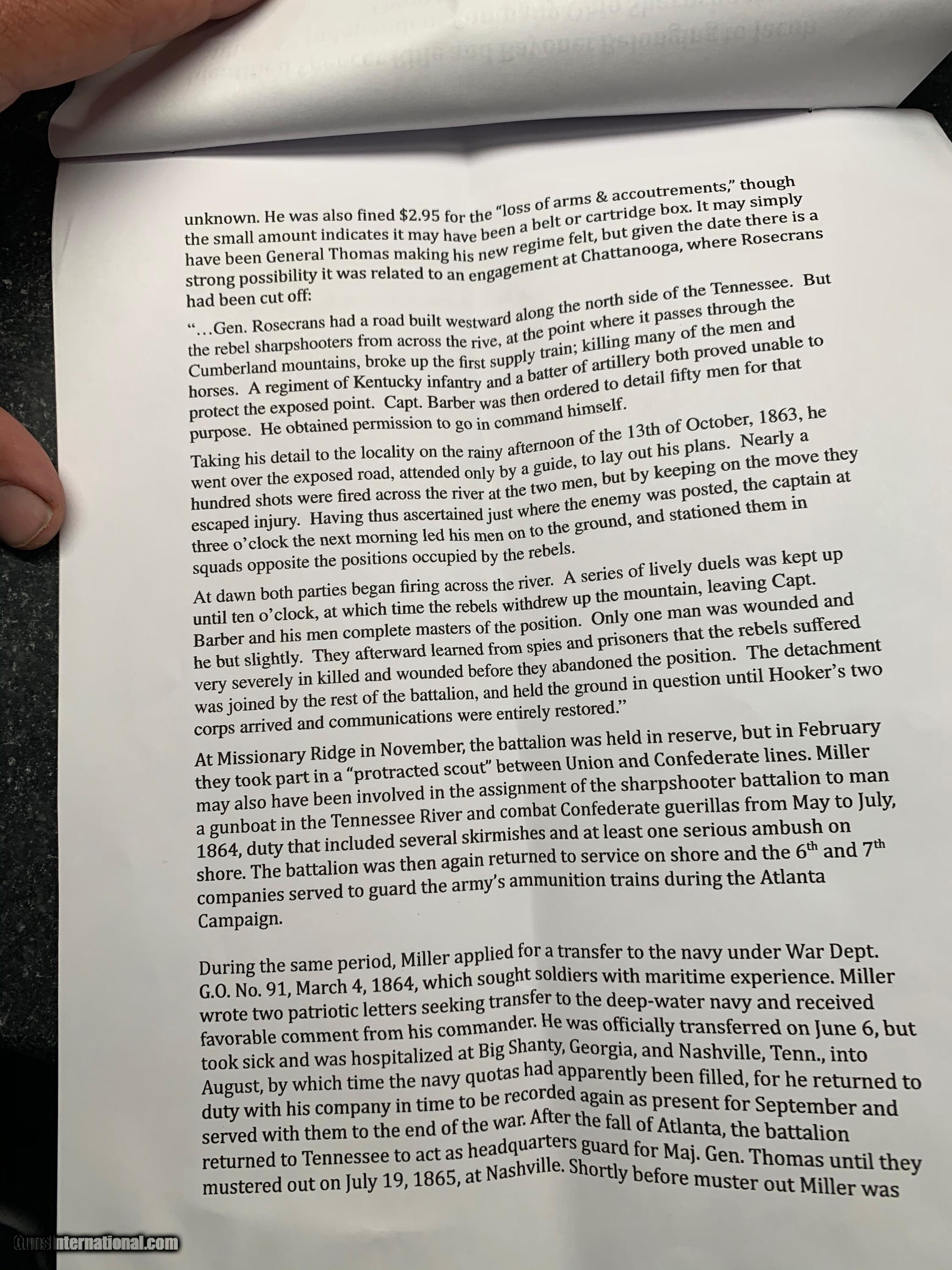 Description: Here is a very nice named and serial number ided Spencer Rifle . Named on the gin to J. C Miller 6th Co. Independent Ohio Sharpshooters serial # 2837 with original rare Spencer rifle bayonet .This Spencer # 2783 is a dead on Identifed to Jacob Miller 6th Indepent Co. Ohio Sharpshooters by and entry in the clothing descriptive , order , and morning report book of the company as well as named on the metal to him . Also. This rifle comes with a nice research archive of paperwork .15 pages copies of Millers military records ,3 pages of photo copies from Regimental history , pension records copies. Hard to find such a nice Spencer rifle with Ohio Sharpshooters ID. SOLD Curio/Relic: Yes Antique: Yes Manufacturer: Spencer Model: Spencer Rifle Serial Number: 2837 Bore: Great Condition: Nice Metal Condition: Nice Wood Condition: Nice Bore Condition: Clean |