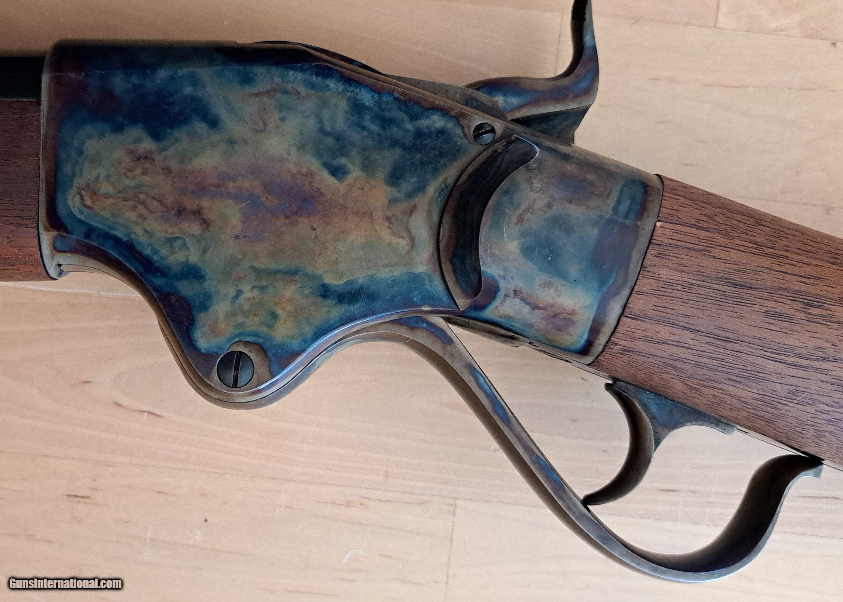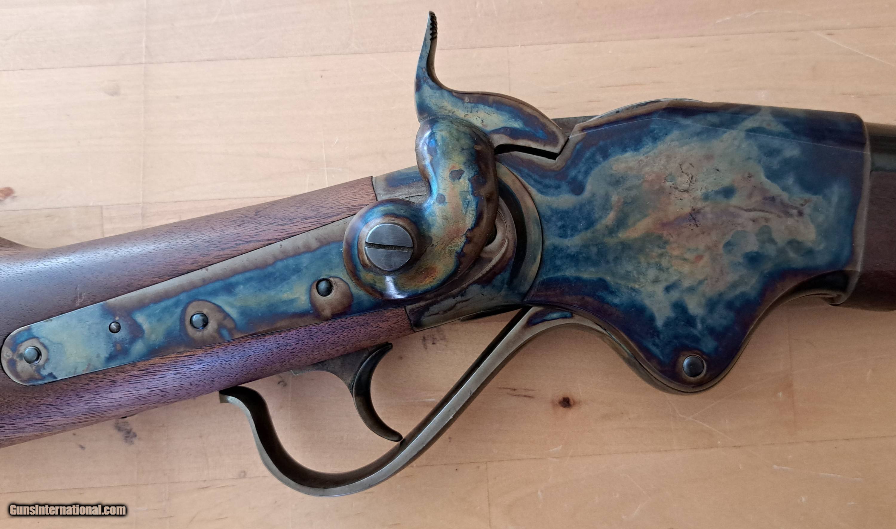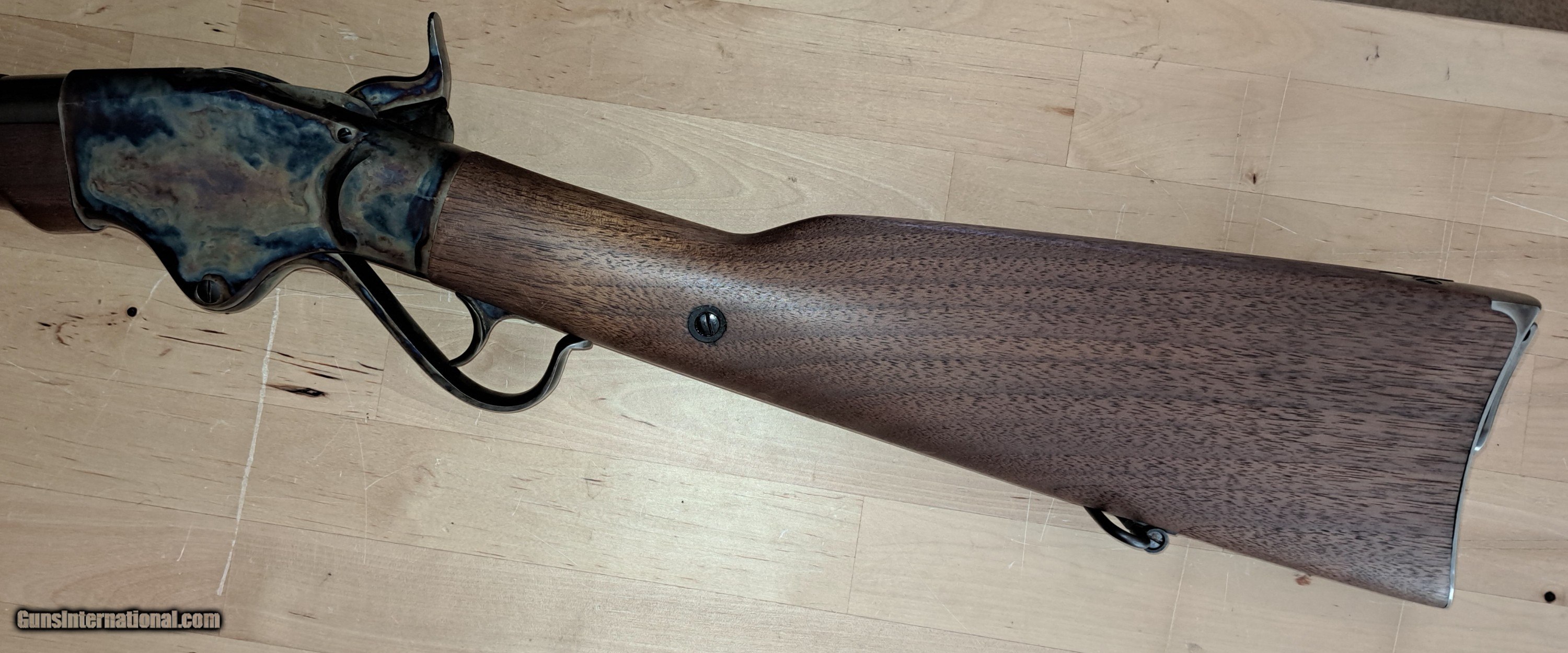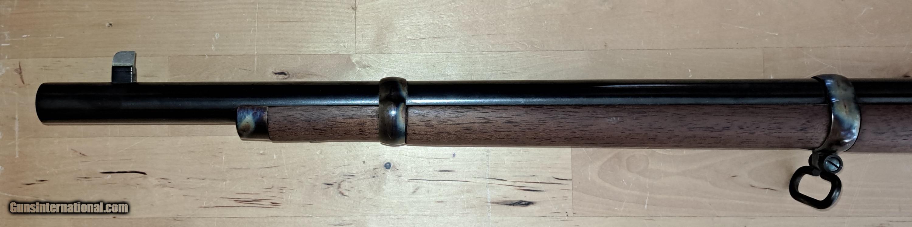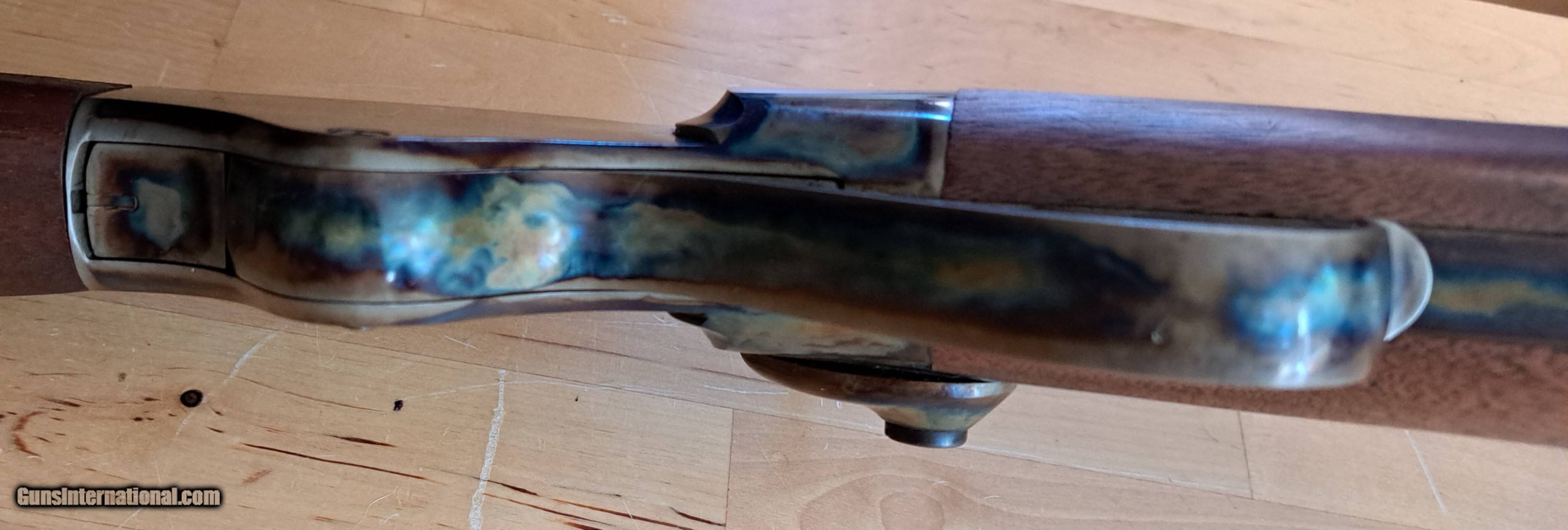 Description: REDUCED. I can offer a generous payment plan on this. Scarce, very high quality replica of a .56-50 Spencer Infantry Rifle built by Larry Romano Rifle Company. It has a blued 30.5" barrel and beautifully case colored receiver and fittings. Bore is near mint. Probably unfired. The rifle was unblemished when shipped to me. Poor packaging by shipper allowed hammer of another rifle in crate to gouge the right side of forestock between the second and third barrel bands. Unfortunate. Still, Mr. Romano only made about 70 of these and they rarely come on the market. Highly sought after by collectors and N-SSA shooters. $3200 + Shipping. More photos available. SOLD |