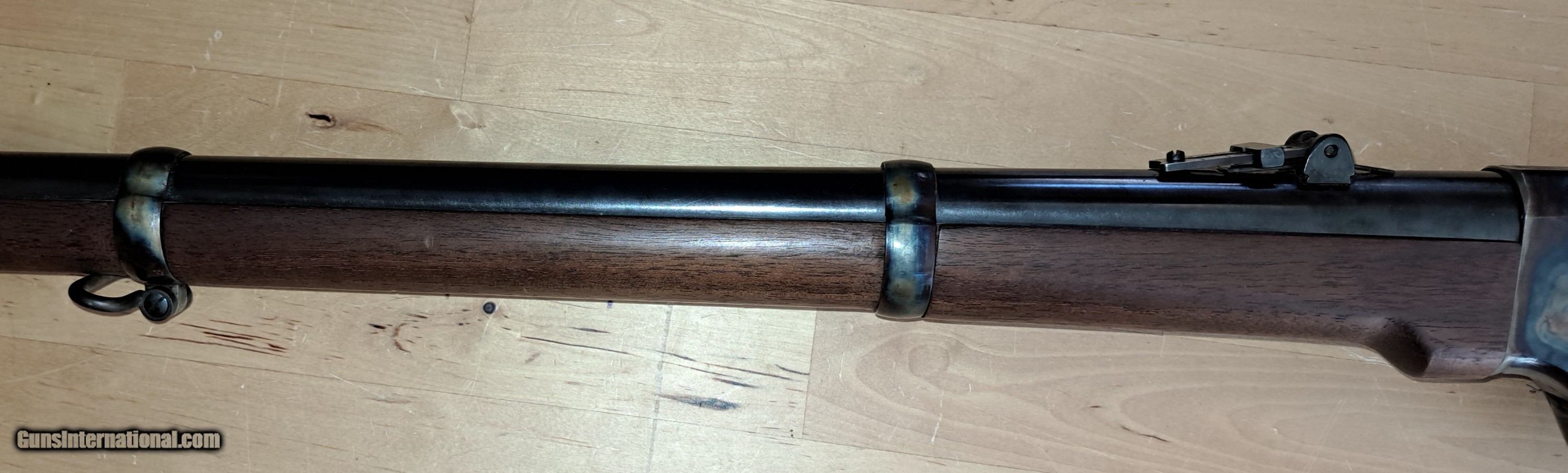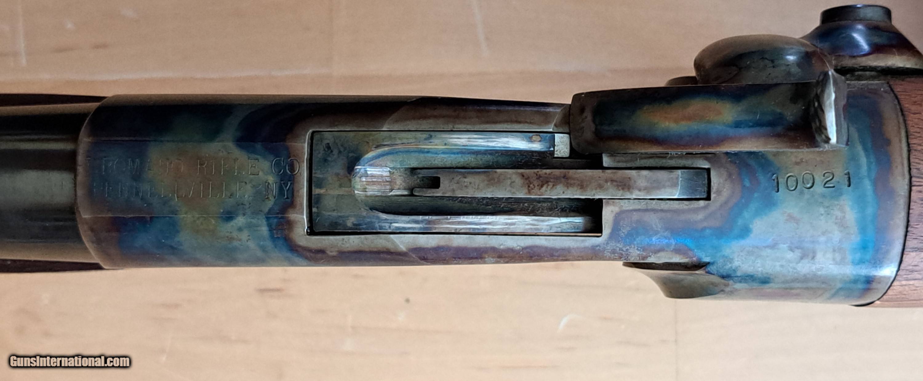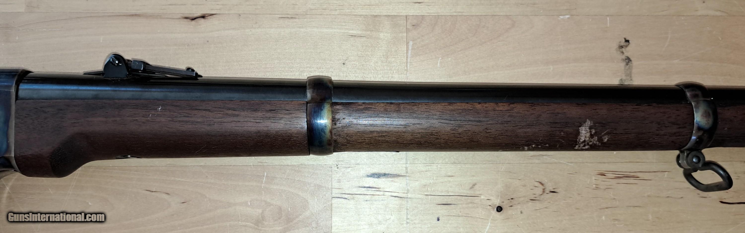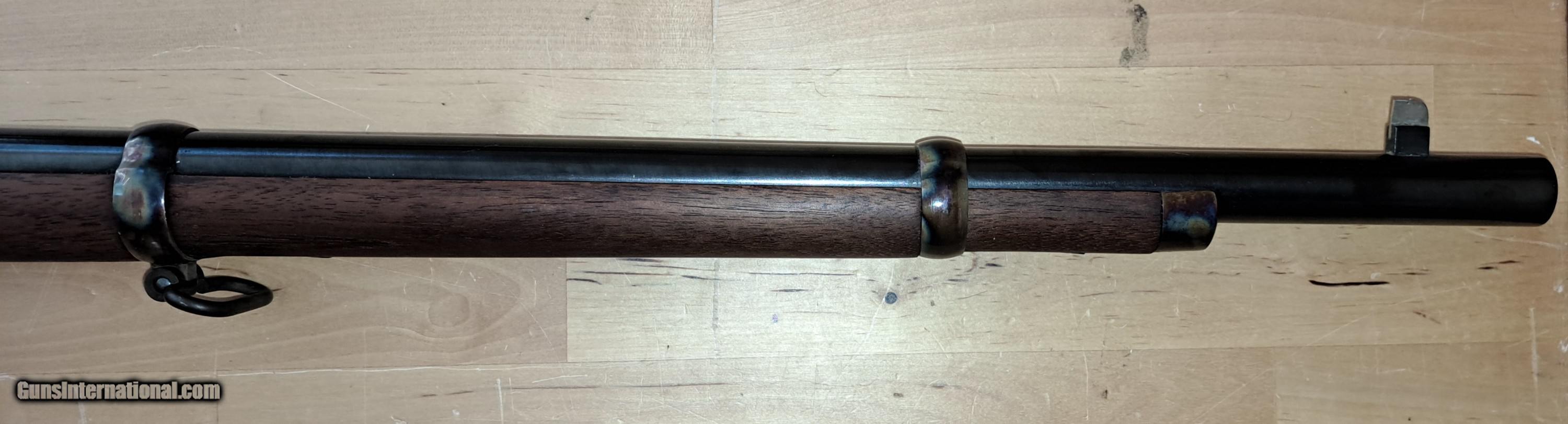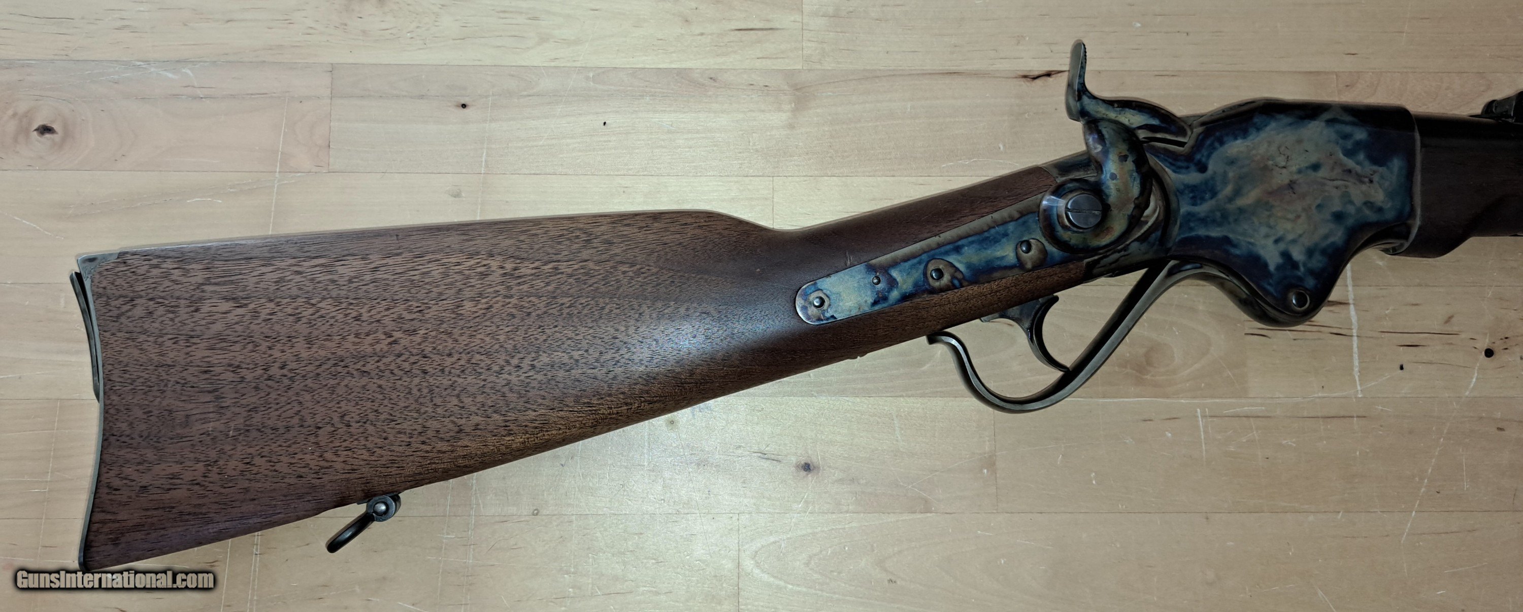 Description: REDUCED. I can offer a generous payment plan on this. Scarce, very high quality replica of a .56-50 Spencer Infantry Rifle built by Larry Romano Rifle Company. It has a blued 30.5" barrel and beautifully case colored receiver and fittings. Bore is near mint. Probably unfired. The rifle was unblemished when shipped to me. Poor packaging by shipper allowed hammer of another rifle in crate to gouge the right side of forestock between the second and third barrel bands. Unfortunate. Still, Mr. Romano only made about 70 of these and they rarely come on the market. Highly sought after by collectors and N-SSA shooters. $3200 + Shipping. More photos available. SOLD |