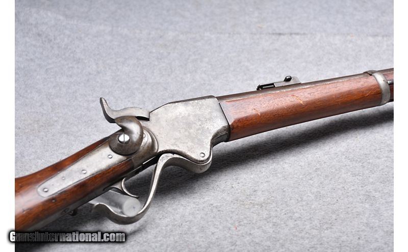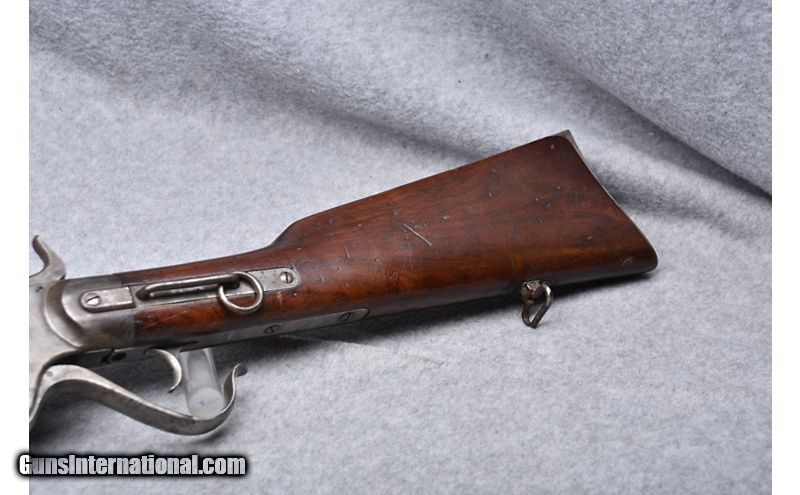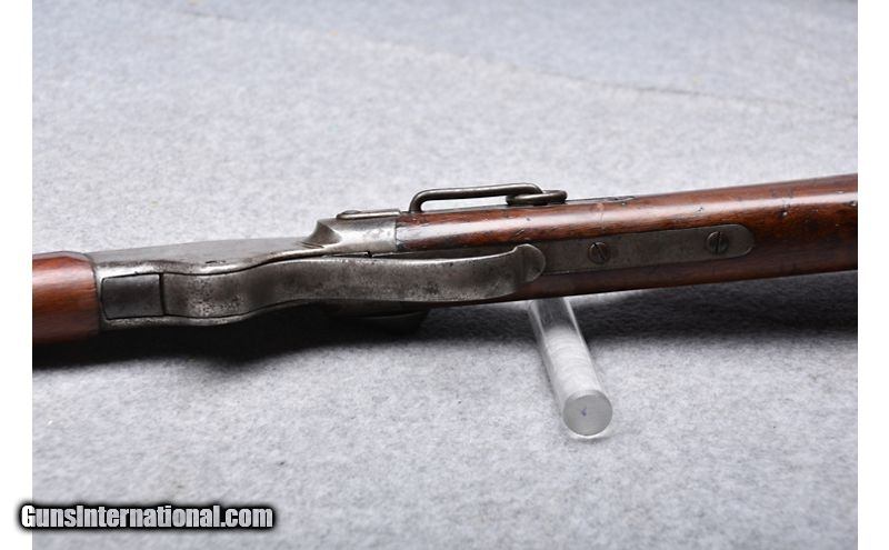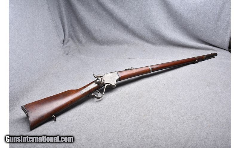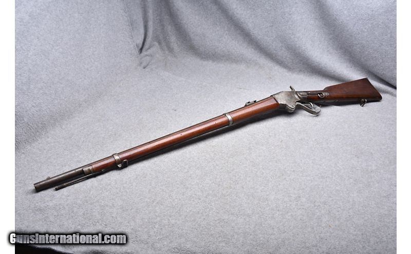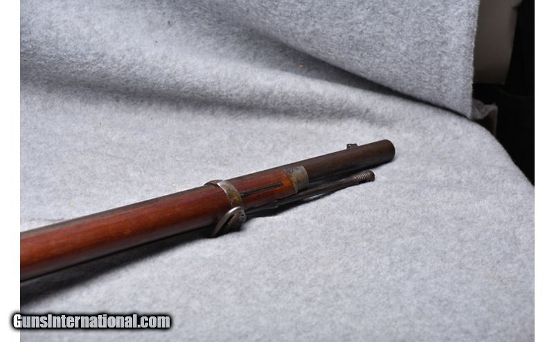 Description: Spencer 1865, chambered in 56-50 Specner. Post War refurb, has some damage to the wood on the right side of the forearm. Alteration Of Calvary Carbine To Infantry Rifle: Performed at Springifield Armory c.1871. The arms used were Burnside marked Model 1865 carbines with receivers refinished at the armory. The armory added new 32.5" round .50 caliber barrel with three groove rifling, Stabler cut off, full forend fastened by two barrel bands and an iron ramrod with ribbed head. 1,108 arms so altered. Serial number marked at breech of barrel to correspond to origenal receiver number. Stock bears ESA inspector markings in oval cartouche on left side of butt. 56-50 SOLD Antique: Yes Metal Condition: Fair Bore Condition: Fair Barrels: 32.5 Sights: Standard Factory Sights Item Location: Reno |