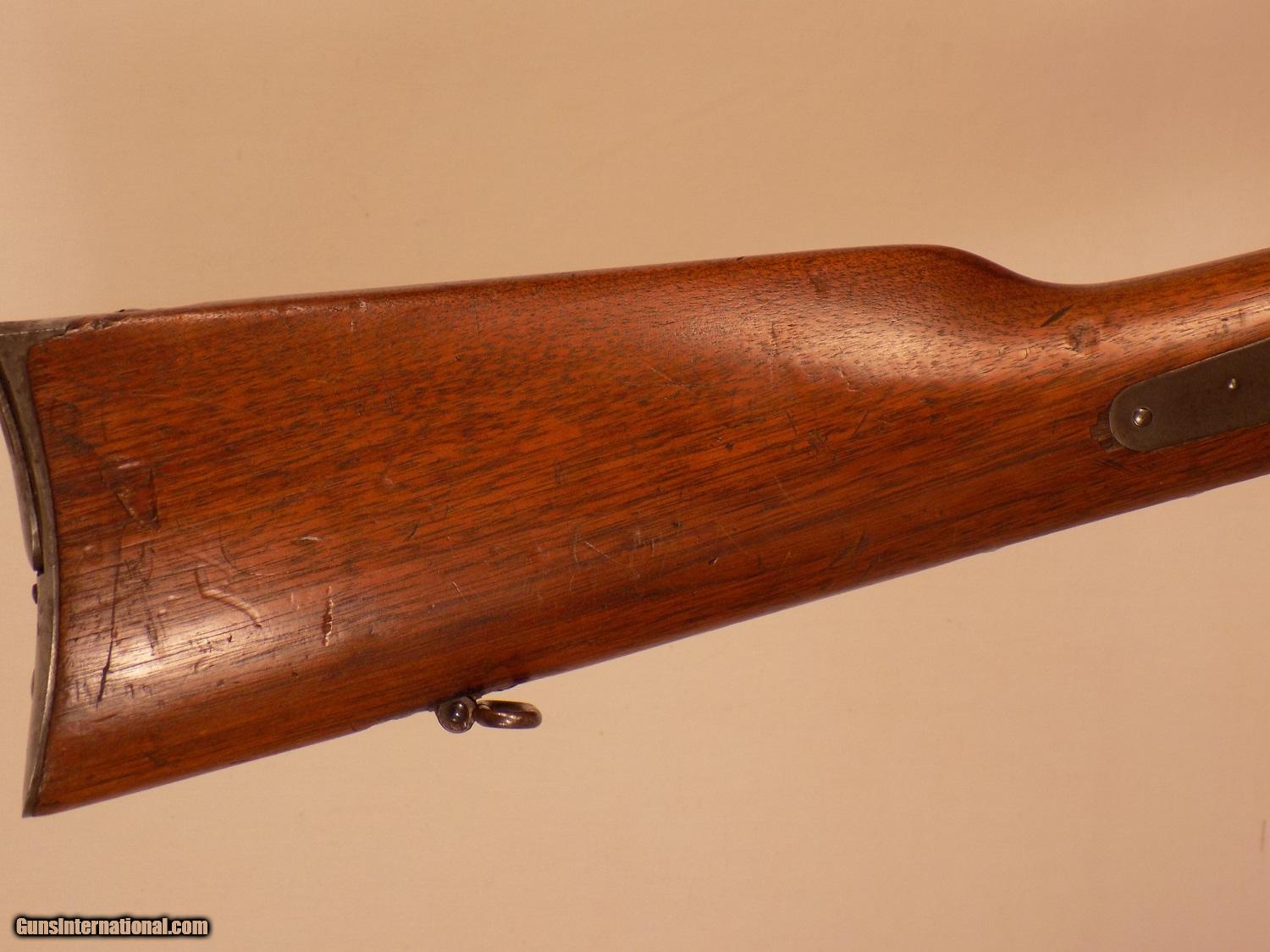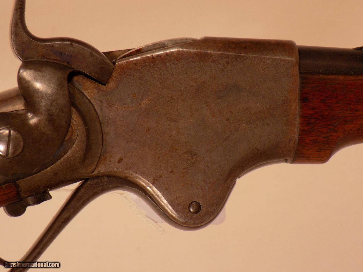Description: SPENCER CIVIL WAR SRC, SN 105XX, 50 cal., 20" bbl., original saddle ring, magazine cut off, original flip up carbine rear sight, VG wood with cartouche visible in left side of stock, several dings in stock, traces of casehardening on the frame, 70% bbl. blue, strong casehardening on the inner parts, VG bore. SOLD Antique: Yes |