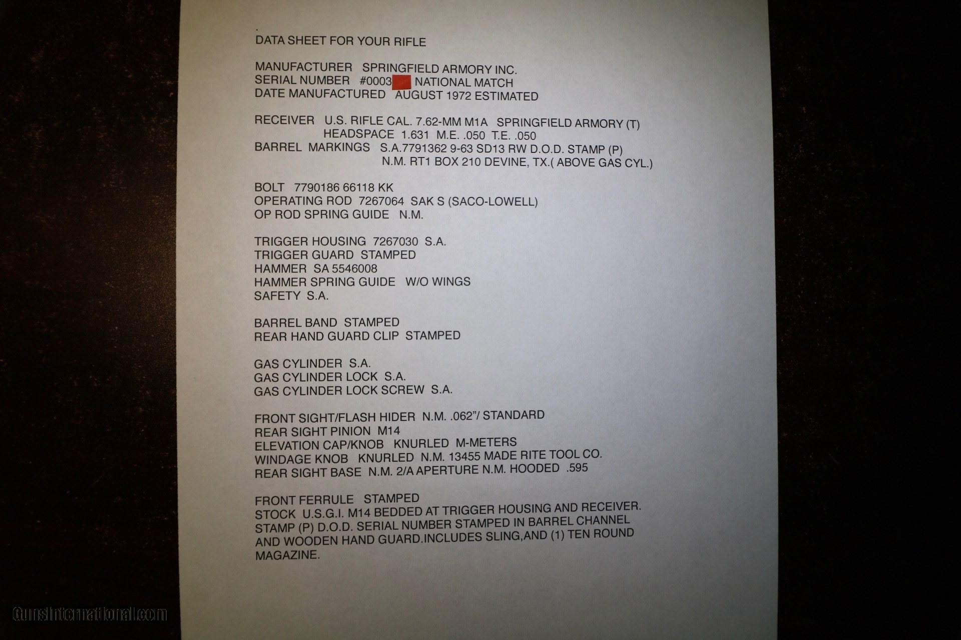 Description: Three digit serial number 0003XX S.A. M1A Divine TX National Match. Estimated date August 1972 is transferable with C.&R. F.F.L.Barrel is marked with Divine,TX address and serial number is stamped in stock and wooden hand guard. Stock is bedded at trigger housing and receiver.Barrel is in the white and an excellent shooter.Please check data sheet for all parts.Serious Buyers Only.Price Is Negotiable "So What Have You Got To Loose?" Includes sling and (1) ten round magazine. Thank you for your interest. SOLD Curio/Relic: Yes Rifle Caliber: 7.62x51mm NATO Manufacturer: Springfield Armory Inc. Model: M1A Serial Number: 0003XX Barrel Length: 22 inches Condition: Very Good Metal Condition: Very Good Wood Condition: Very Good Bore Condition: In The White Manufacture Date: August 1972 Estimate |