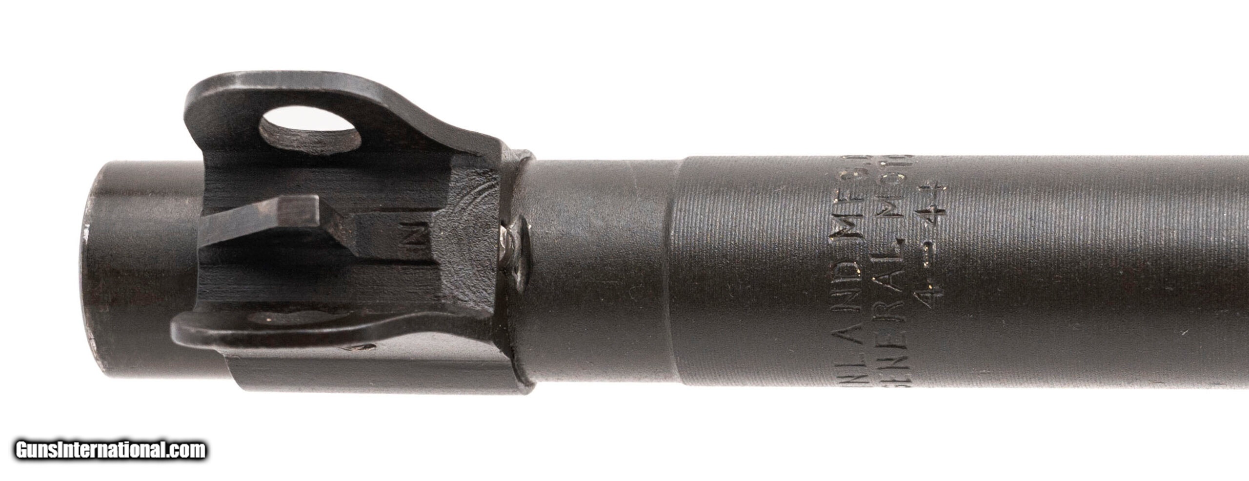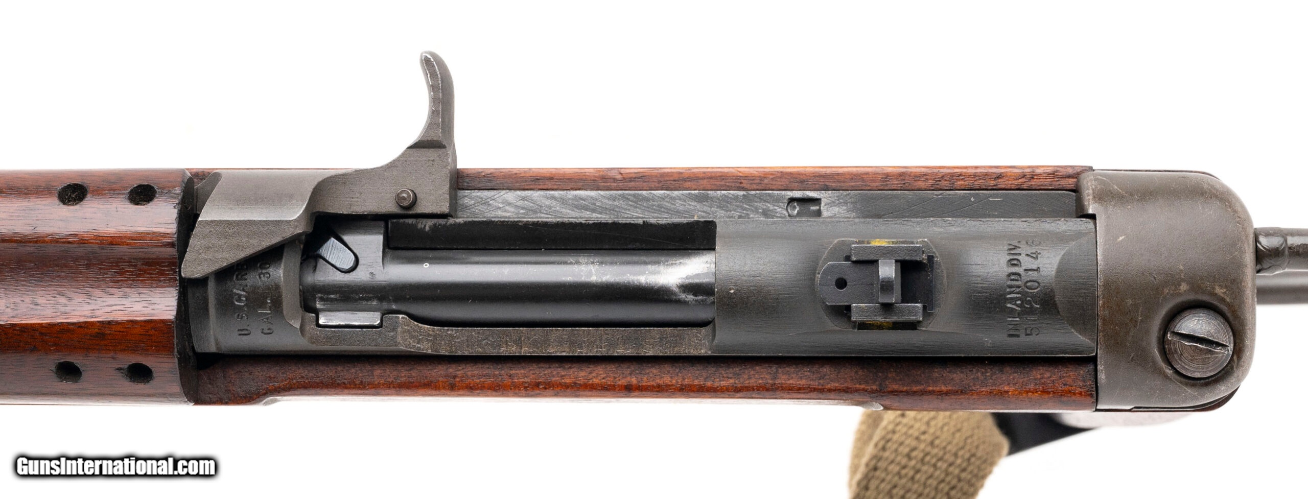 Description: "Serial No. 5120146, circa May-June 1944, .30 carbine, 18" round barrel marked “INLAND M.F.G DIV/ GENERAL MOTORS/4-44", front sight is marked “N". Type B front band is marked “AI". Bolt is round and rear sight is marked “S" and “IN-B" Magazine release is marked “M". Low wood stock is excellent condition, pistol grip is marked “P" on the front. Bottom of pistol grips is stamped with RI/3. Butt plate is marked “B257614- “Wagon wheel"-10". Action is smooth and functions correctly. Comes with oiler and sling with two extra magazines. SOLD |