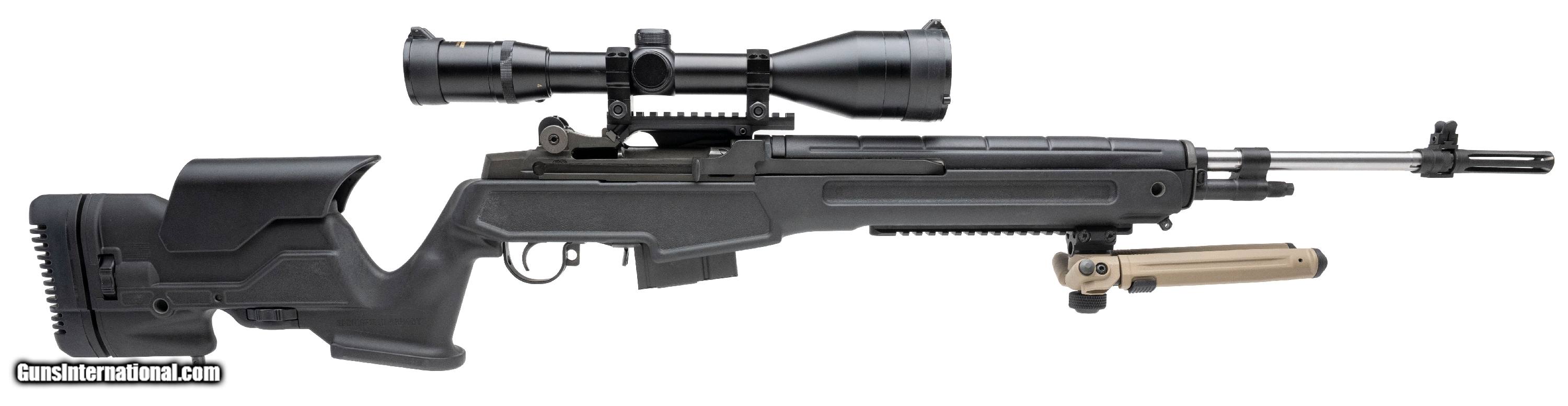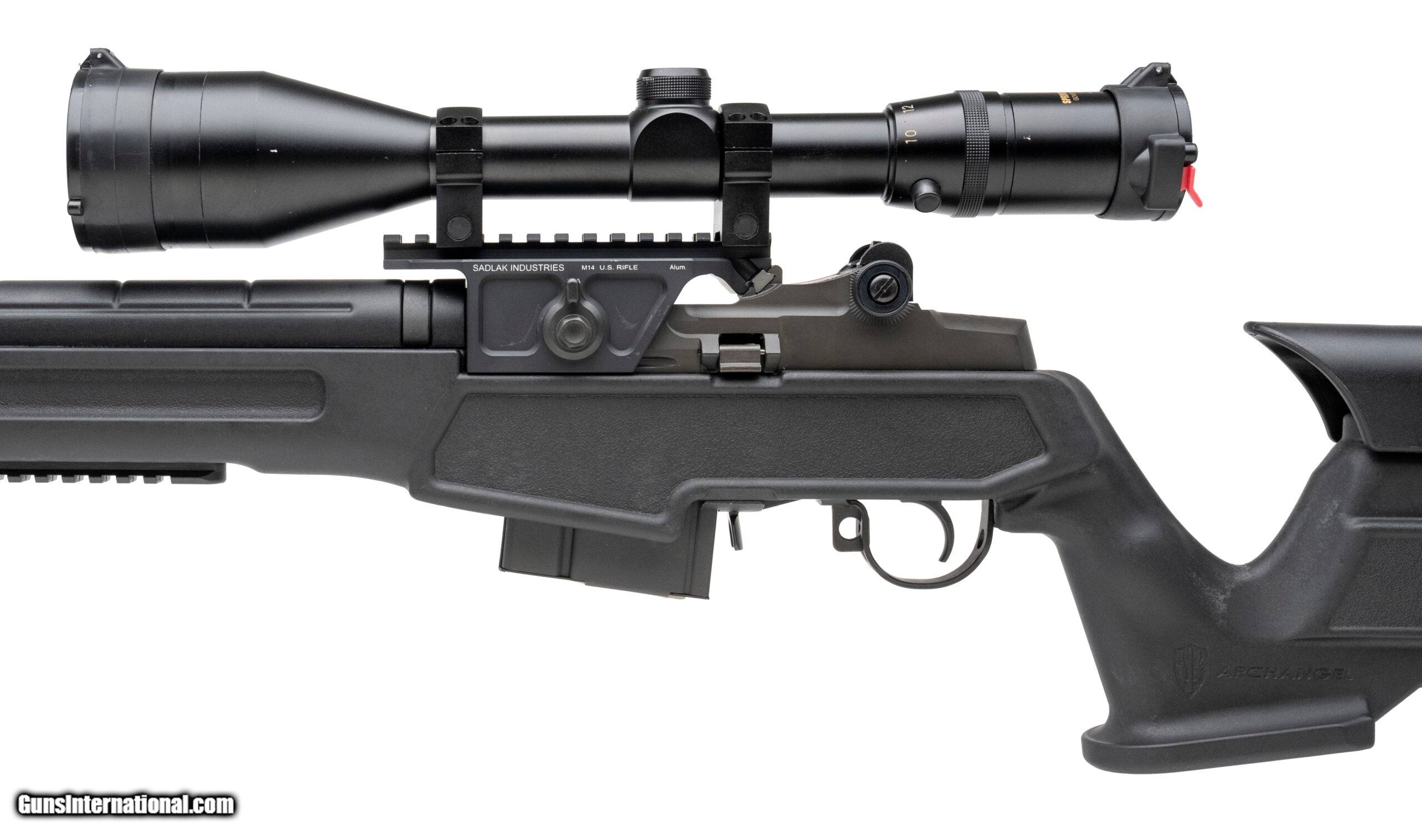 Description: "SN: 405170. Modern production. Semi-automatic rifle made by Springfield Armory. 22"" stainless barrel chambered for .308 Winchester. Great overall condition with handling marks in the black Archangel stock. Parkerized receiver is excellent. Features adjustable length-of-pull and comb height, fore-end accessory rail with mounted pan/tilt/height adjustable bipod, and 3"" birdcage flash hider. Comes with mounted Springfield Government Model 4-14x56 scope on Sadlak rail mount. SOLD |