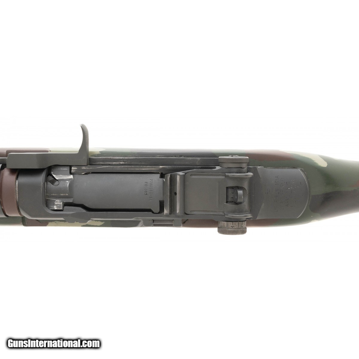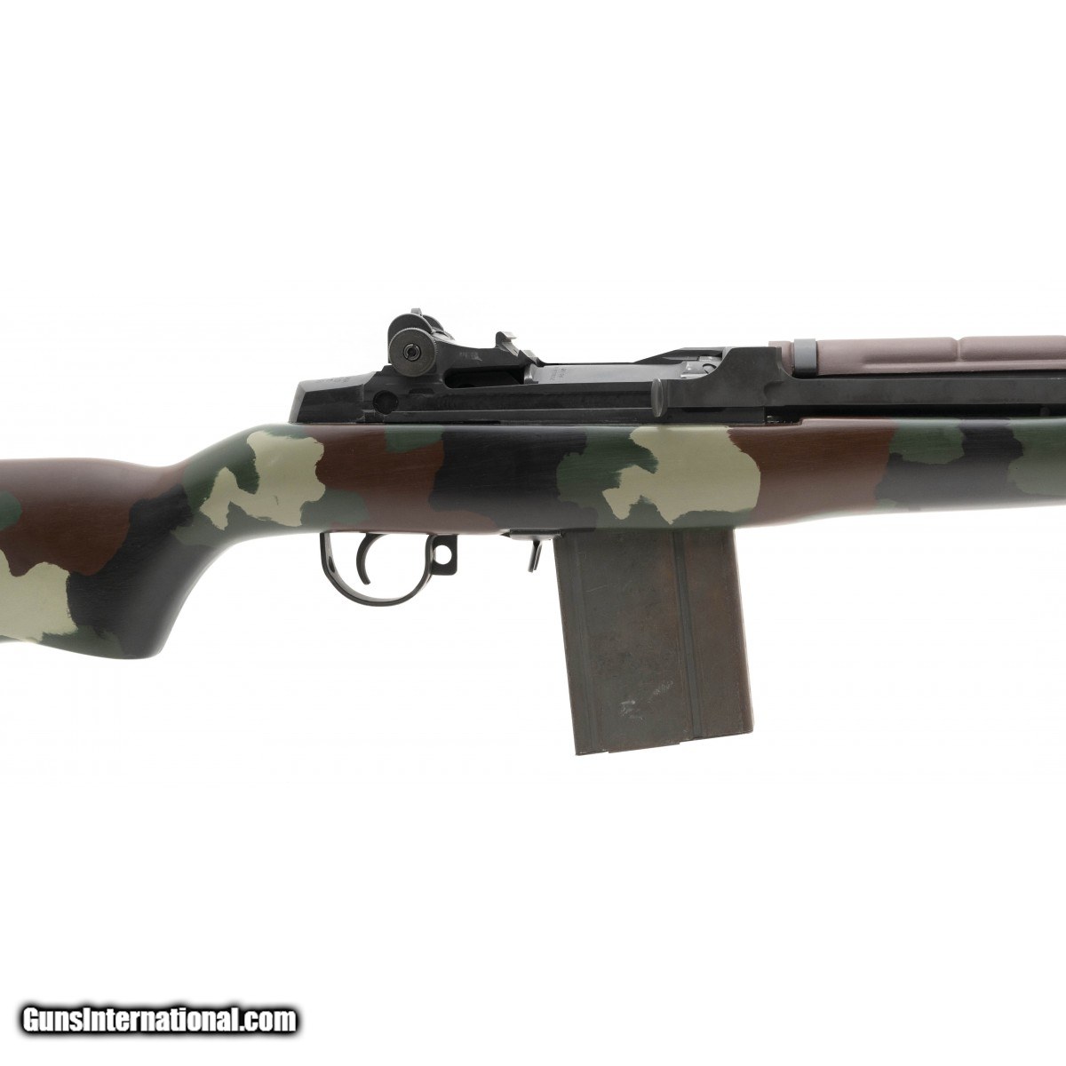 Modern civilian M14 patterned rifle with stainless Douglas heavy match barrel and glass bedded McMillan stock, patterned after Marine Corps woodland camo. Overall excellent condition.