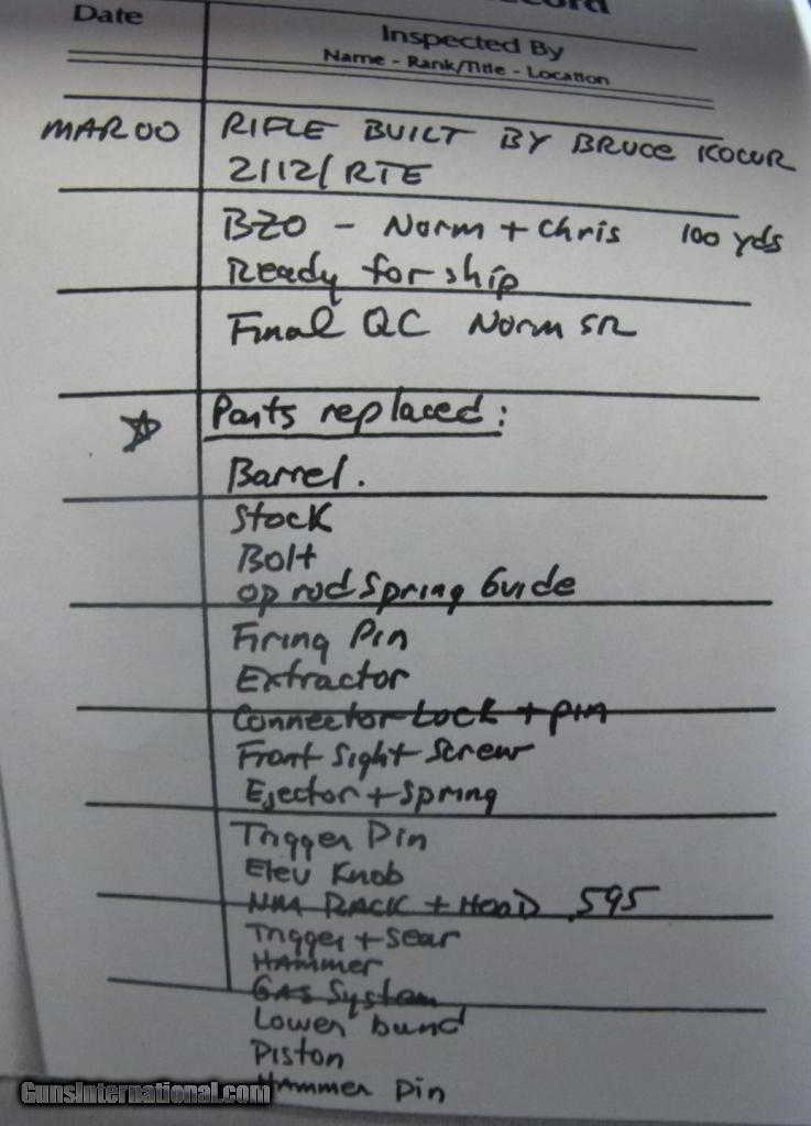 Description: Beautiful Custom Built, pre-Ban Springfield M1A at Iron Brigade Armory by Marine Corps Precision Weapons Armorer Bruce Kocur, MOS 2112. Iron Brigade Armory and the Chandler family, are world renowned for building some of the most accurate rifle platforms. They no longer produce these match winning M14's. Rifle is assembled and bedded in a heavy McMillan woodland camoflage stock. Receiver is pre-ban produced, and has a factory rear lug (rifle is not bolted to stock). Rifle has a heavy, 1-10 308 Gene Barnett USMC spec barrel. Build sheet indicates barrel was Cyrogenically stress relieved for accuracy. Typical match upgrades, unitized gas cylinder, reamed flash hider, NM sights and welded lower band. Front sling swivel is also welded against sling pressure. Here's your chance to have a Marine built quater mile monster of a match rifle. Round count is doucmented at less than 250 shots fired. Rifle weighs roughly 13lbs, and balances at the mag well. Any questions please feel free to ask. Shipping additional based on location, Fedex Ground. SOLD |