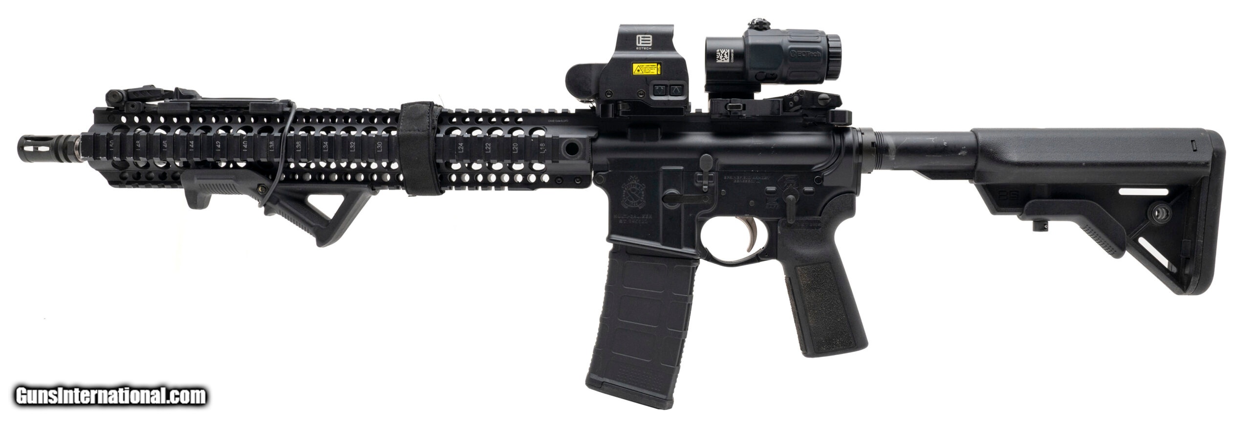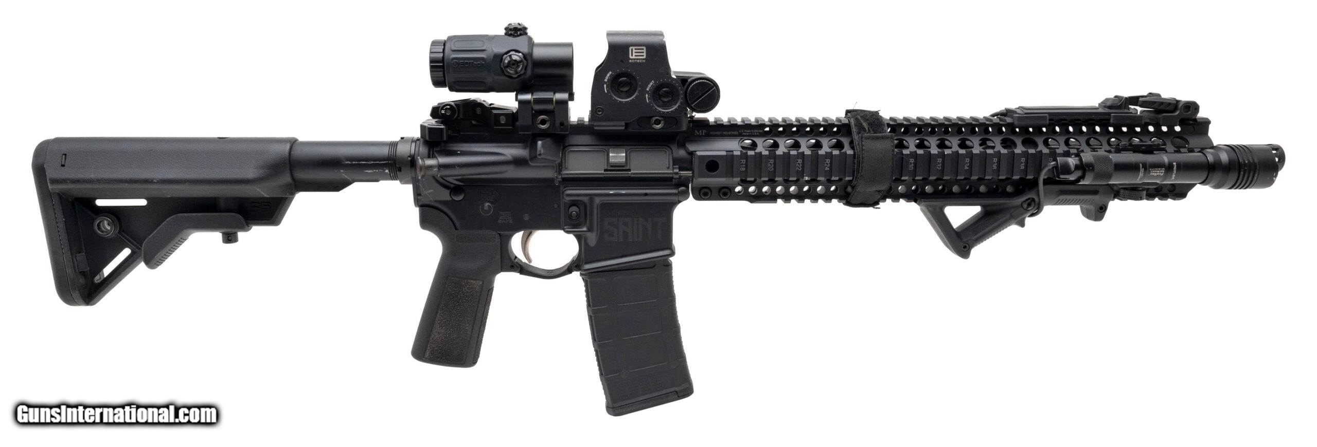 Description: "SN: ST345522. Modern production. 5.56 with a 16"" barrel. Bore is bright with strong rifling. Semi-automatic tactical rifle. Finish is in good condition with handling wear noted. Rifle comes built out with a 15"" Midwest Industries quad rail handguard, Streamlight ProTac light, Eotech XPS-2 with a 3x magnifier. Overall good condition. SOLD |