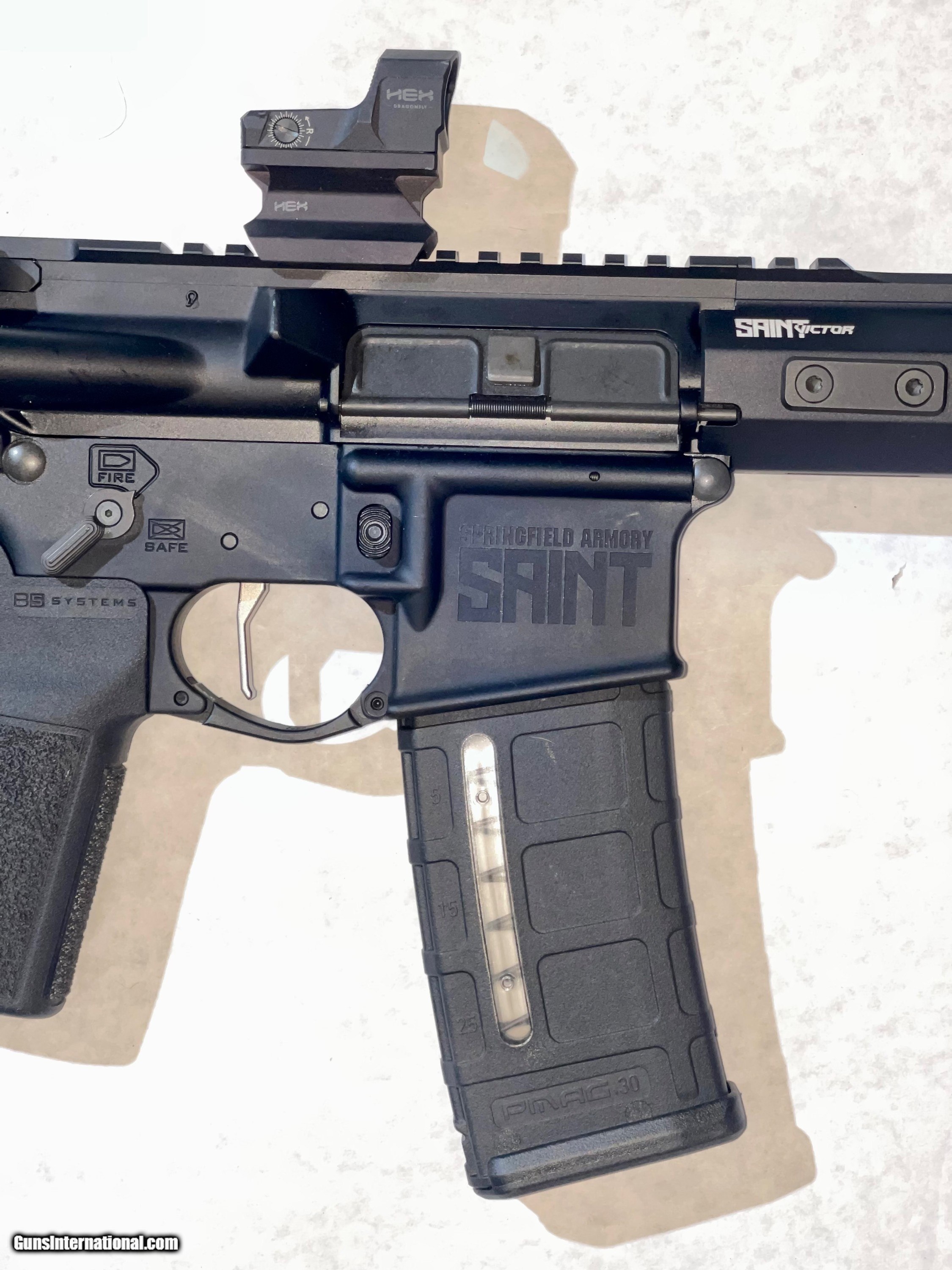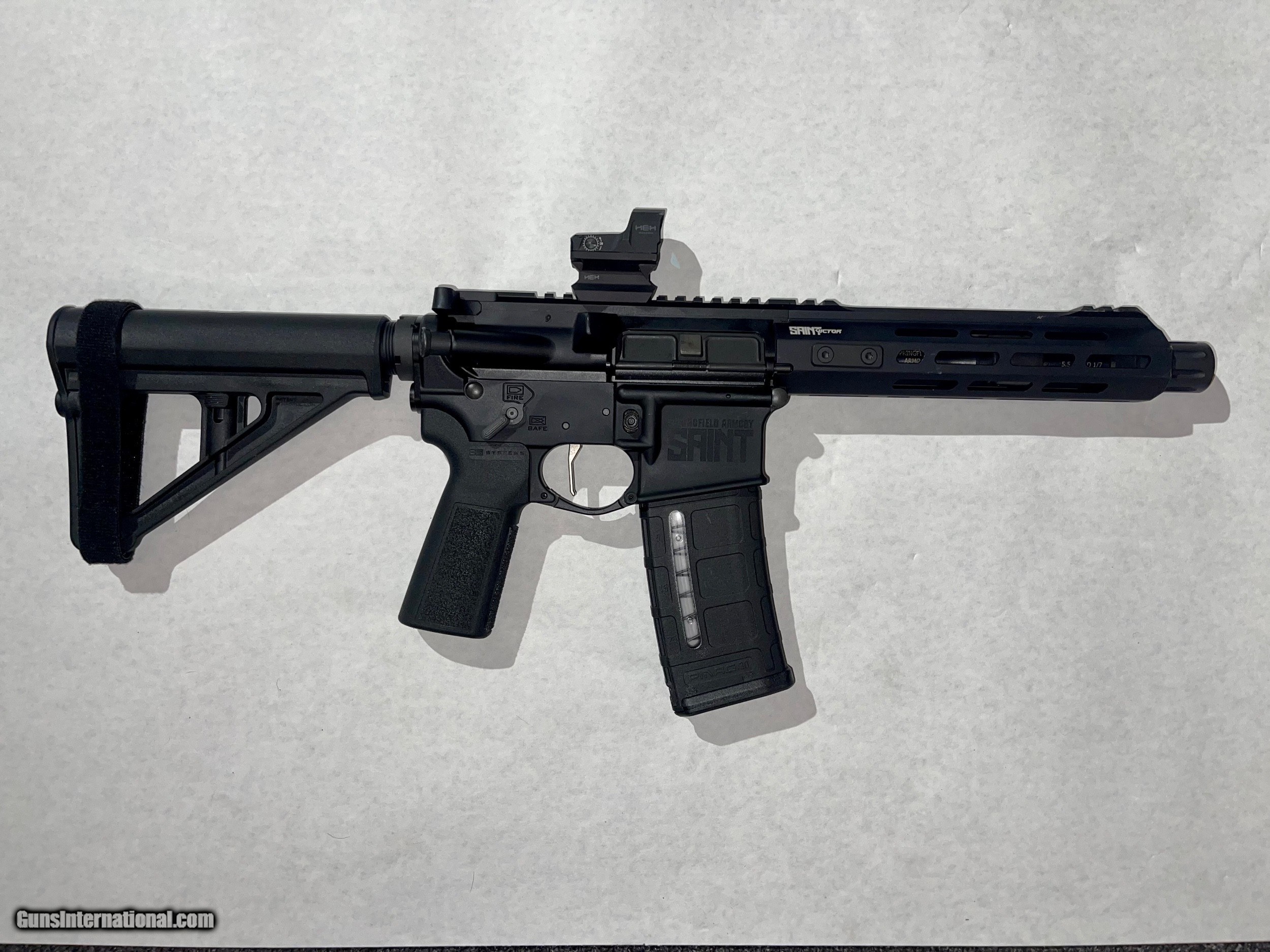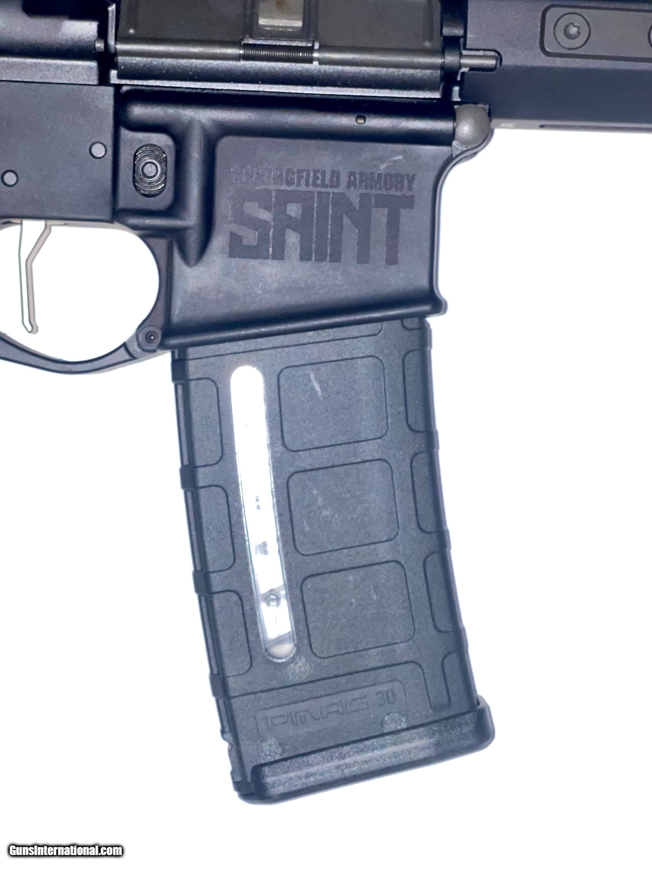 Description: Springfield Armory Saint Victor .556 When you think of the Springfield Armory® Saint M-Lok® AR-15 Rifle with B5 Stock, think unflinching reliability from a modern classic. The lightweight mid-length direct gas impingement system keeps this dependable shot maker on beat like a heart. Top-end B5 Systems furniture includes steep-angled, extended-tang Type-23 P-Grip with palm-filling ergonomics and enhanced SOPMOD Stock with ergonomic cheekweld, integrated QD sling mounts and no-slip cushioned buttpad. The full-length 15" aluminum handguard features ample M-Lok® real estate for accessories. A 16" chrome moly vanadium Melonite®-coated barrel with 1:8" rate-of-twist rifling offers rugged, easy-handling performance. Low-profile adjustable flip-up sights promote fast, on-target aiming. Forged 7075 T6 Aluminum upper and lower receiver features type-III hardcoat-anodized finish with forward assist and M4 feed ramps on upper and Accu-Tite™ tension system on lower. Other details include M16 bolt carrier group with 9310 steel bolt, nickel-boron-coated GI trigger, carbine "H" heavy tungsten buffer, GI-style charging handle, ambidextrous safety switch, and SA muzzle brake. Springfield Armory Saint M-Lok B-5 Stock AR-15 Rifle includes one 30-round Magpul® PMAG® Gen M3™ magazine.