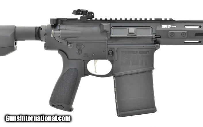 Springfield Saint Victor .308 caliber rifle. Springfield Saint Victor chambered in .308 with 16” barrel, full rifle length hand guard flip-up sights, and muzzle brake. Comes with bag and one magazine. New.