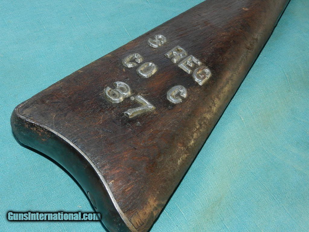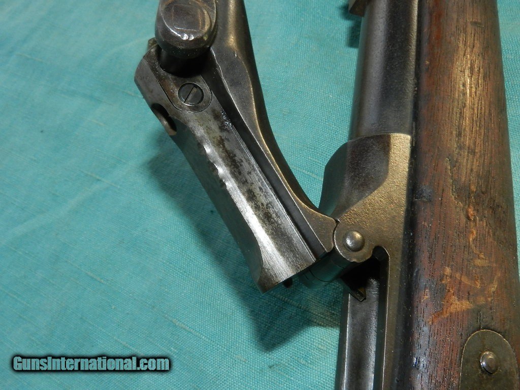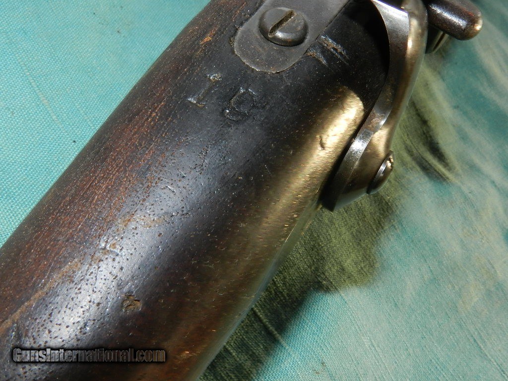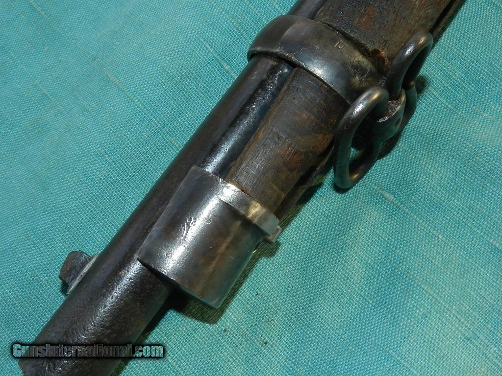 Description: SOLD Intriguing guns seem to come my way often and this gun is no exception with an 1873 lockplate and 1884 breech. This carbine may have hung in a GAR hall as the raised butt-stock letters are common for display purposes. The barrel is 24" long and the bore is clean, shiny, and rifled. Much armory blue on the lock and lesser on the action, and the action works well. The walnut stock has dryness and several field handling dings. Has an 1884 rear sight base but the ladder is missing, and the rear barrel band has the 1884 sight groove. Looks like the nose cao got dinged as it's off center slightly and the sliver of wood is missing on the left side behind the nose cap. The buttplate at the top has rust pitting where the buttplate had sit someplace with dampness. Front barrel band is the 1884 stacking type. Overall a very colorful trapdoor. When buying a gun always have it examined by a competent gunsmith before shooting. To buy a gun from me you must get a direct email for me, with details, and shipping cost. We don’t have a web site .I prefer money orders or a check. Item ships when funds come in. I try to keep guns affordable, which means I make less money than most dealers. You won’t get altitude sickness, or nose bleed, with my prices! I consistently have the best selection of older guns If you attempt to buy, you must still contact us for details . Best to email to buy. Sometimes a local person can stop buy and purchase before the gun is removed. Sometimes not home to get calls. Some guns are required shipment to a gun dealer near you for a transfer to you when it arrives. Otherwise many older or black powder guns ship to your door. With the widest selection of older guns at great prices, We don’t have a store, and sell on the internet only. I’m easy to get along with. Thank You[JB1] [JB1] SOLD Antique: Yes |