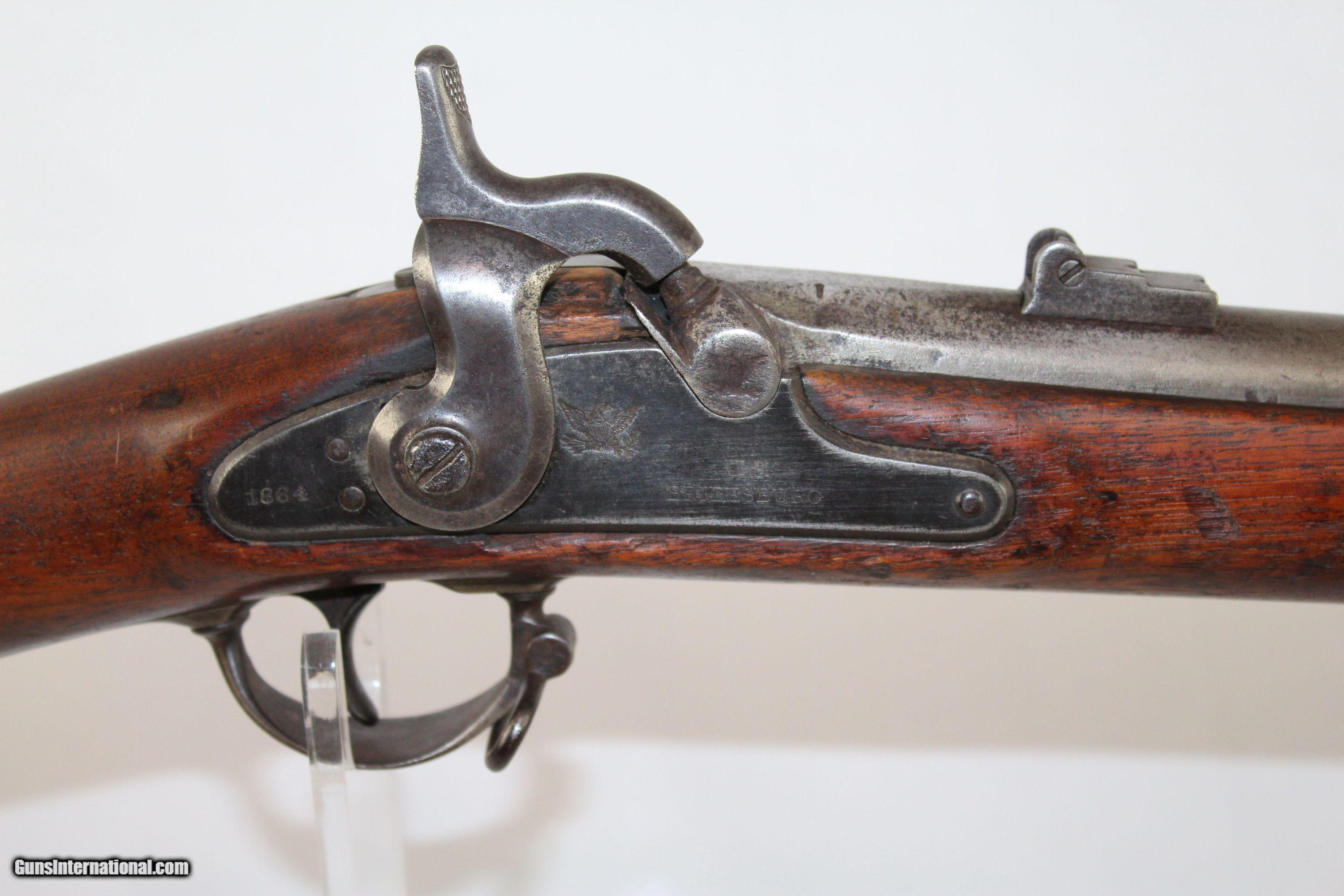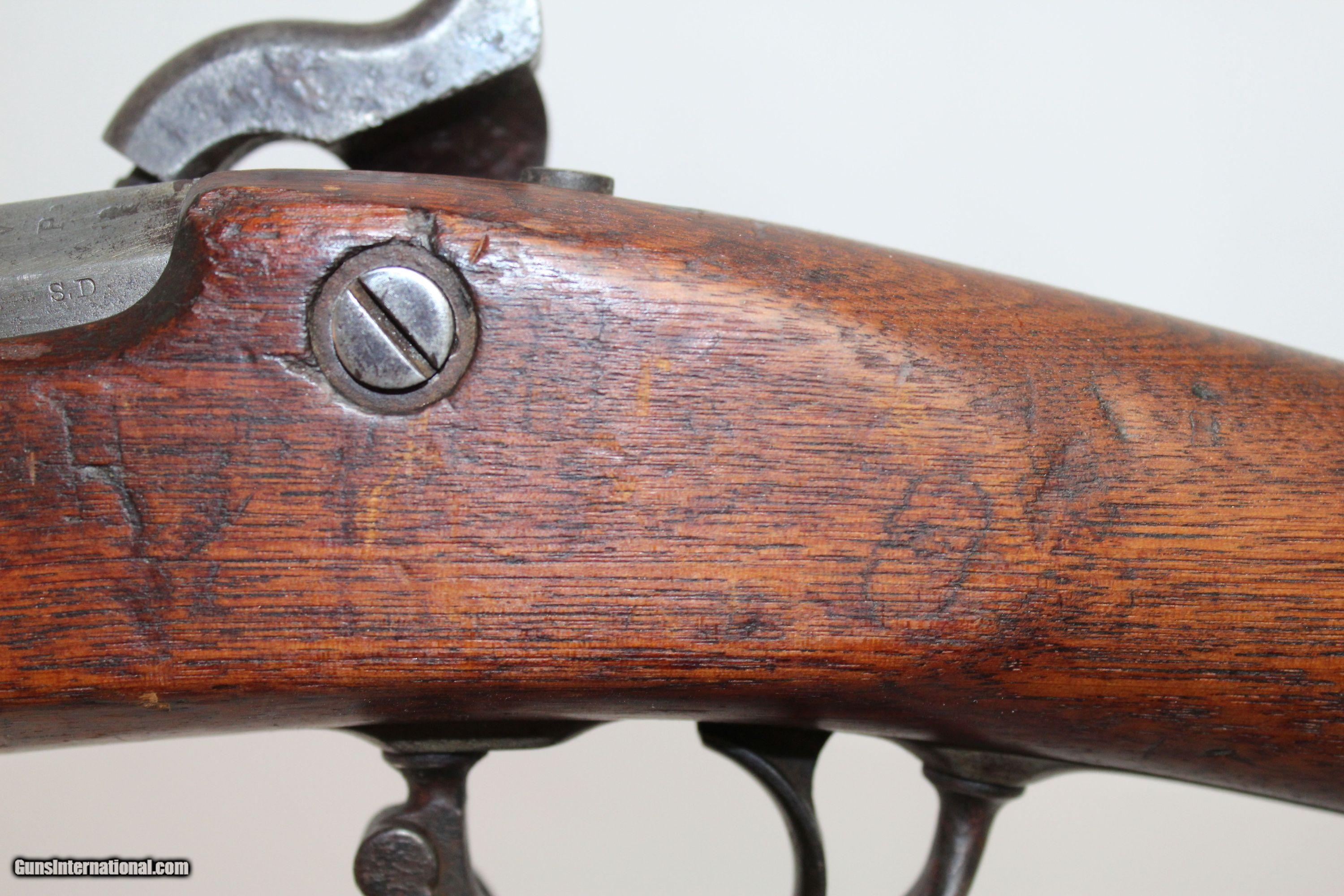 Description: CIVIL WAR Antique M1863 Percussion Rifle-Musket With Bridesburg Lock Dated “1864” Here we present an antique U.S. Model 1863 Rifle-Musket, made in 1864. The M1863 is representative of the “everyman’s” rifle during the American Civil War. About 1.5 million rifle-muskets were made in the U.S., over 800,000 of which were made by the Springfield Armory. This was the last hurrah of the rifle-musket as arms development and tactics rapidly advanced during the short period of the American Civil War. Nevertheless, this rifle musket represented new technology as it was made for use with the Minié ball, a hollow based, conical projectile that was small enough to quickly push down the muzzle of a rifled barrel, and expanded to create a good gas seal unlike solid, round ball. This is an example of the Model 1863 Type I. It bears a lock from the Alfred Jenks & Son contract that is dated “1864”. The lock reads “U.S. BRIDESBURG”. Outlines of both government inspector cartouches remain on the left side of the stock, opposite the lock. Proof marks are located on the left side of the barrel. The overall condition is good. The metal is dark with age. The markings are clear and legible. The walnut stock shows good honest wear and is solid. The bore is in good shape, with clear rifling. The action is strong. Own the original! This is a legitimate antique and not a reproduction. Barrel is 40 inches. Caliber: .58 Percussion Overall condition as seen in photos. Very Fast. Very Safe. FREE SHIPPING WORLDWIDE. Delivered directly to your door by express mail! Guaranteed AUTHENTIC & Includes CERTIFICATE OF AUTHENTICITY. ancestryguns $1500 #5177 SOLD Antique: Yes |