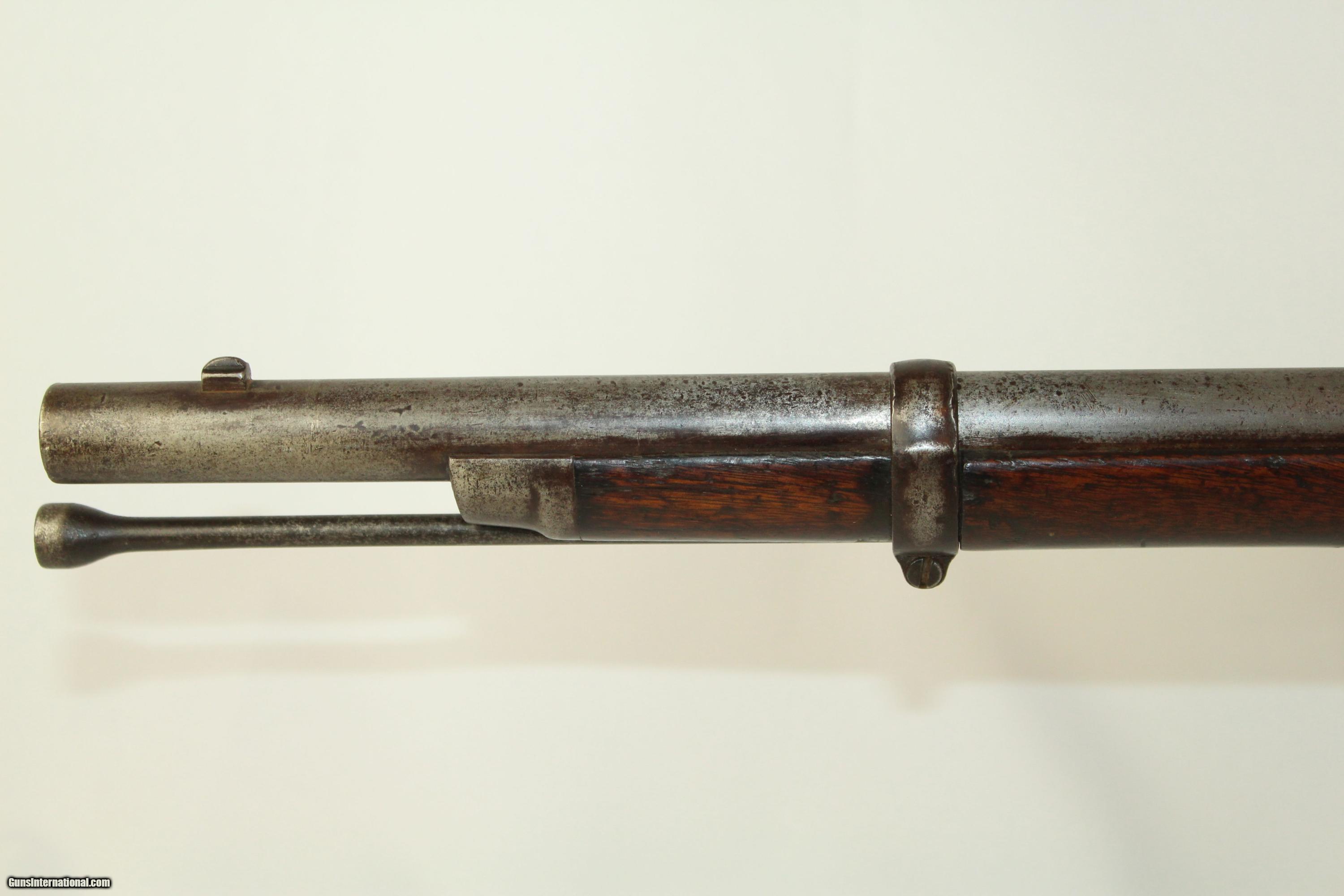 Description: CIVIL WAR Antique US SPRINGFIELD 1861 Rifle-Musket Primary Infantry Weapon of the American Civil War Here we present an antique U.S. Model 1861 Rifle-Musket, made at Springfield Armory in Springfield, Massachusetts, in 1863. The M1861 is representative of the “everyman’s” rifle during the American Civil War. About 1.5 million rifle-muskets were made in the U.S., over 800,000 of which were made by the Springfield Armory. This was the last hurrah of the rifle-musket as arms development and tactics rapidly advanced during the short period of the American Civil War. Nevertheless, the 1863 represented new technology as it was made for use with the Minié ball, a hollow based, conical projectile that was small enough to quickly push down the muzzle of a rifled barrel, and expanded to create a good gas seal unlike solid round ball. This .58 caliber rifle’s lock is marked “1863” and “U.S./SPRINGFIELD”. The top of the butt plate is also marked “US”. Two government inspector cartouches are visible on the left side of the rifle, the more clear of which bears the initials “ESA”. “ESA” is for Erskine S. Allin (the Master Armorer soon to be inventor of the trapdoor conversion of these muskets). The overall condition is very good. The metal surfaces have a dark patina. The markings are legible. The walnut stock is battle-worn, and solid. The front barrel band screw has sheared in half, making the band loose. The bore is in good condition. The action is strong. Own the original! This is a legitimate antique and not a reproduction. Barrel is 40 inches in length. Caliber: .58 percussion Overall condition as seen in photos. Very Fast. Very Safe. FREE SHIPPING WORLDWIDE. Delivered directly to your door by express mail! Guaranteed AUTHENTIC & Includes CERTIFICATE OF AUTHENTICITY. ancestryguns $1600 #10453 SOLD Antique: Yes |