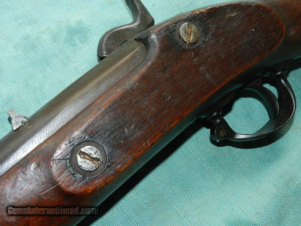 Description: Very interesting Springfield 1865 dated forager with a a rifled bore and a small bead front sight. Exterior metal is aged brown patina, and the 24" barrel has strong rifling and shallow surface oxidation.CAliber .58, and has a rear slotted/dovetail sight.Action is atrong, and has an simple iron ram-rod. The walnut shortened walnut stock is dark with age, and still has the U.S. marked butt-plate where as the trigger guard looks like it was re-blued at some time, but fits tight. The left side of the stock still has two oval U.S. Gov't proof marks. An interesting multi-putpose musket/forager. Possible Confederate calbvary altered musket? When buying a gun always have it examined by a competent gunsmith before shooting. To buy a gun from me you must get a direct email for me, with details, and shipping cost. We don’t have a web site .I prefer money orders or a check. Item ships when funds come in. I try to keep guns affordable, which means I make less money than most dealers. You won’t get altitude sickness, or nose bleed, with my prices! I consistently have the best selection of older guns If you attempt to buy, you must still contact us for details . Best to email to buy. Sometimes a local person can stop buy and purchase before the gun is removed. Sometimes not home to get calls. Some guns are required shipment to a gun dealer near you for a transfer to you when it arrives. Otherwise many older or black powder guns ship to your door. With the widest selection of older guns at great prices, We don’t have a store, and sell on the internet only. I’m easy to get along with. Thank You SOLD Antique: Yes |