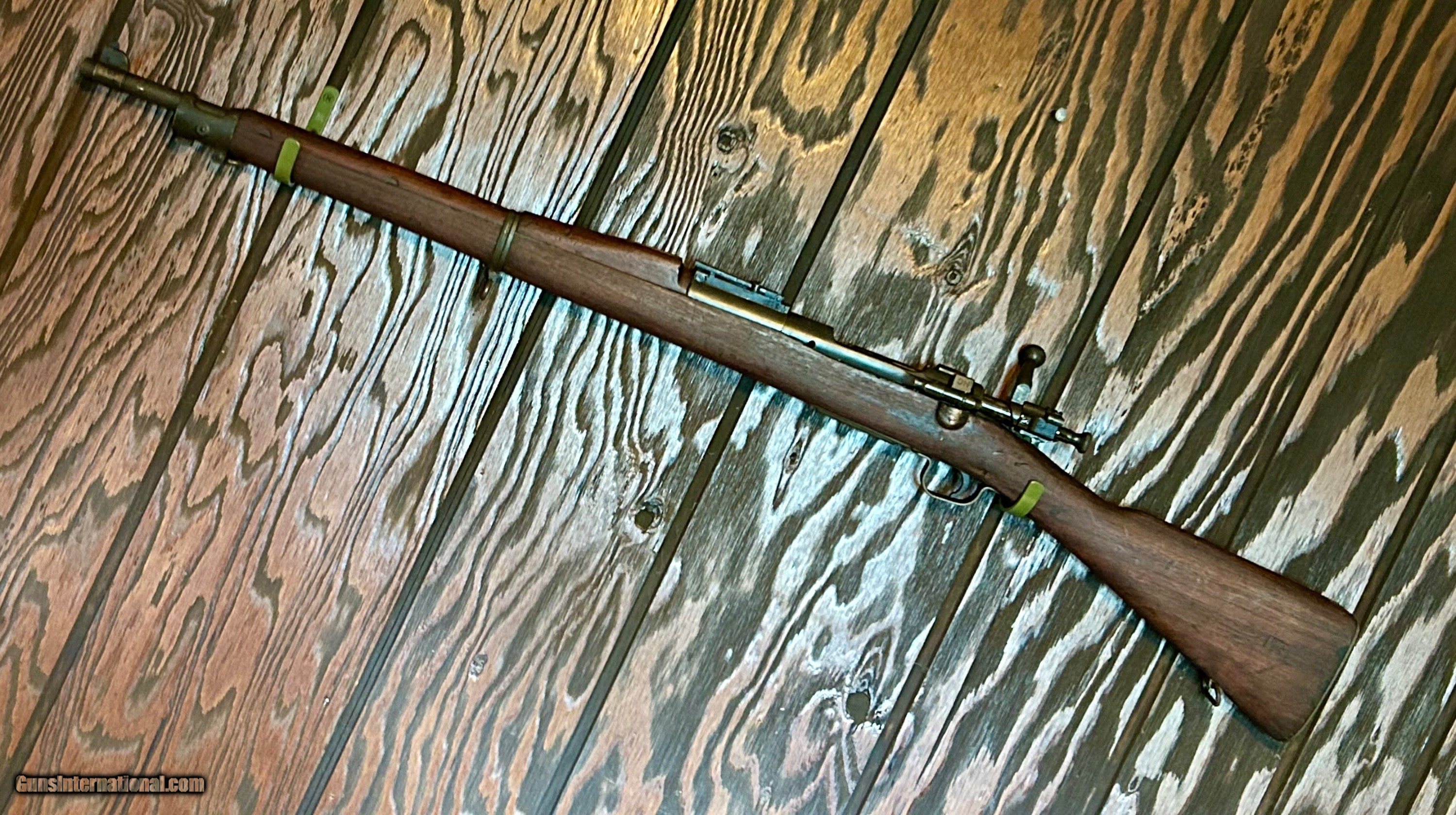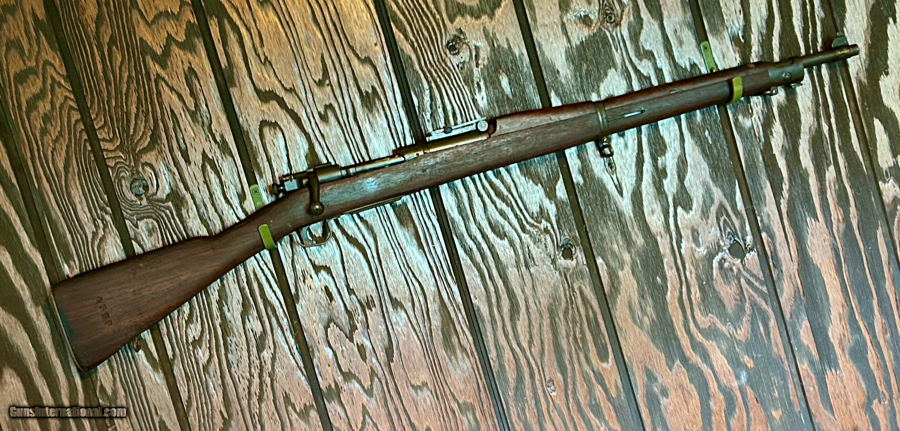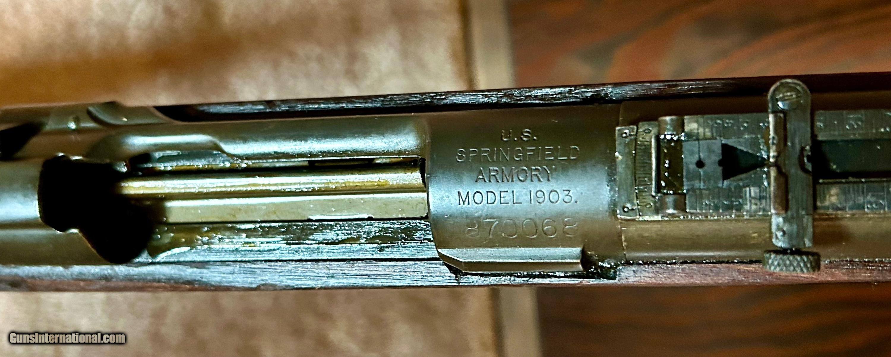 Description: Springfield Model 1903 rifle. Full military configuration. Excellent condition. Serial number dates the manufacture date to 1918. Improved heat treating began with serial 800,000, this rifle is number 870,068. numbers below 800,000 are considered low so this is fairly early. The metal is all military phosphate finish and has acquired the green patina from decades of exposure to military cleaning fluid and oil. Bore is bright with strong rifling. Military stock is walnut with no cracks, splits and only a few slight dings from storage. SOLD Curio/Relic: Yes Rifle Caliber: .30-06 Springfield Manufacturer: Springfield Model: 1903 Serial Number: 870068 Condition: Very Good Metal Condition: Very Good Wood Condition: Very Good Bore Condition: Very Good Action: Bolt Sights: Standard military Manufacture Date: 1918 Item Location: Oklahoma Proof:Nitro: Yes |