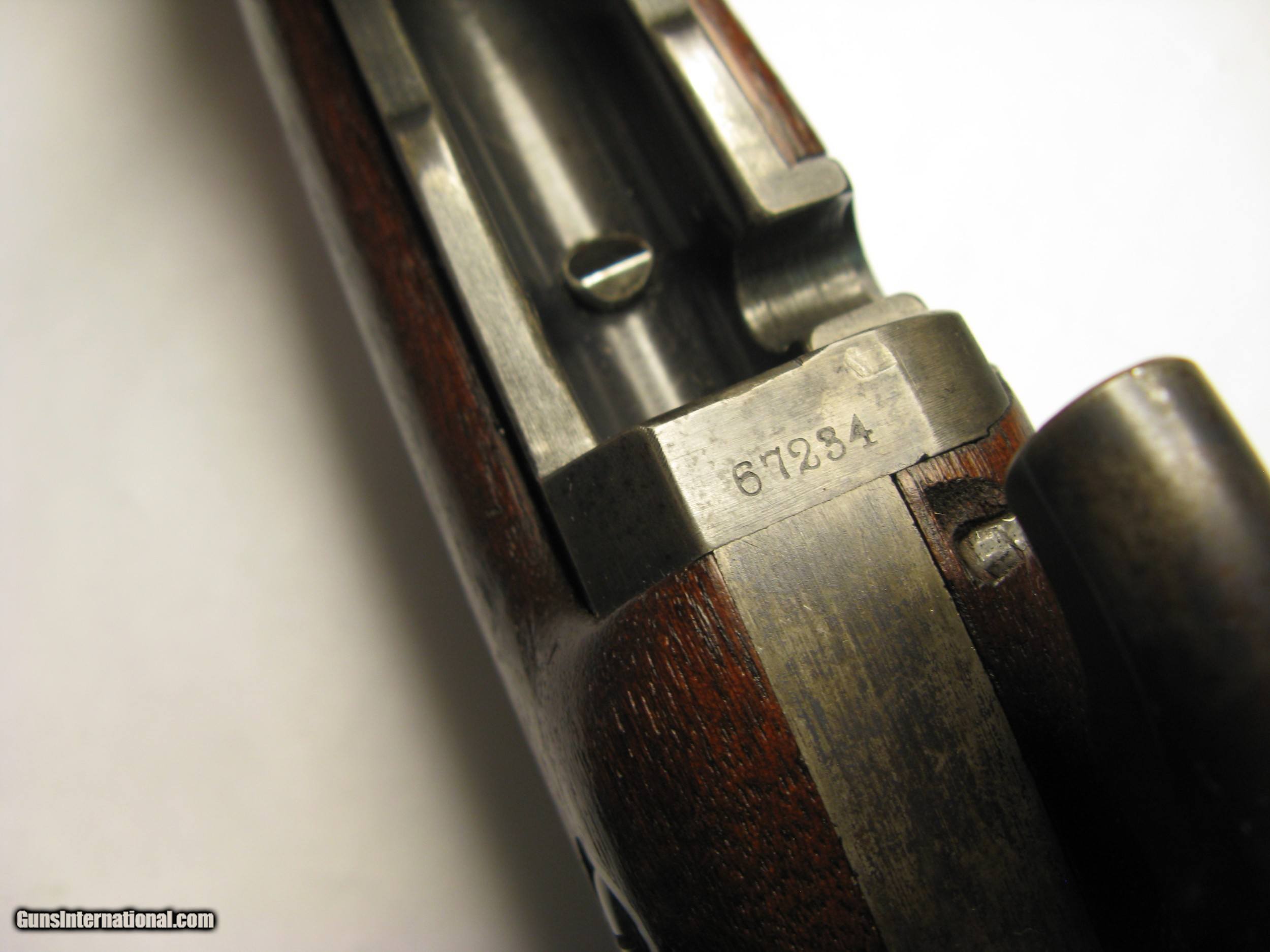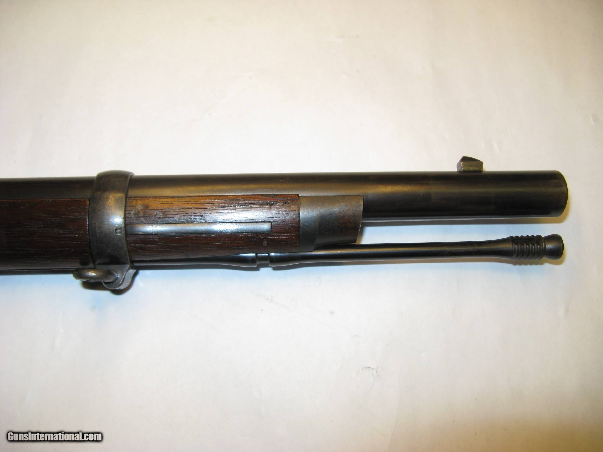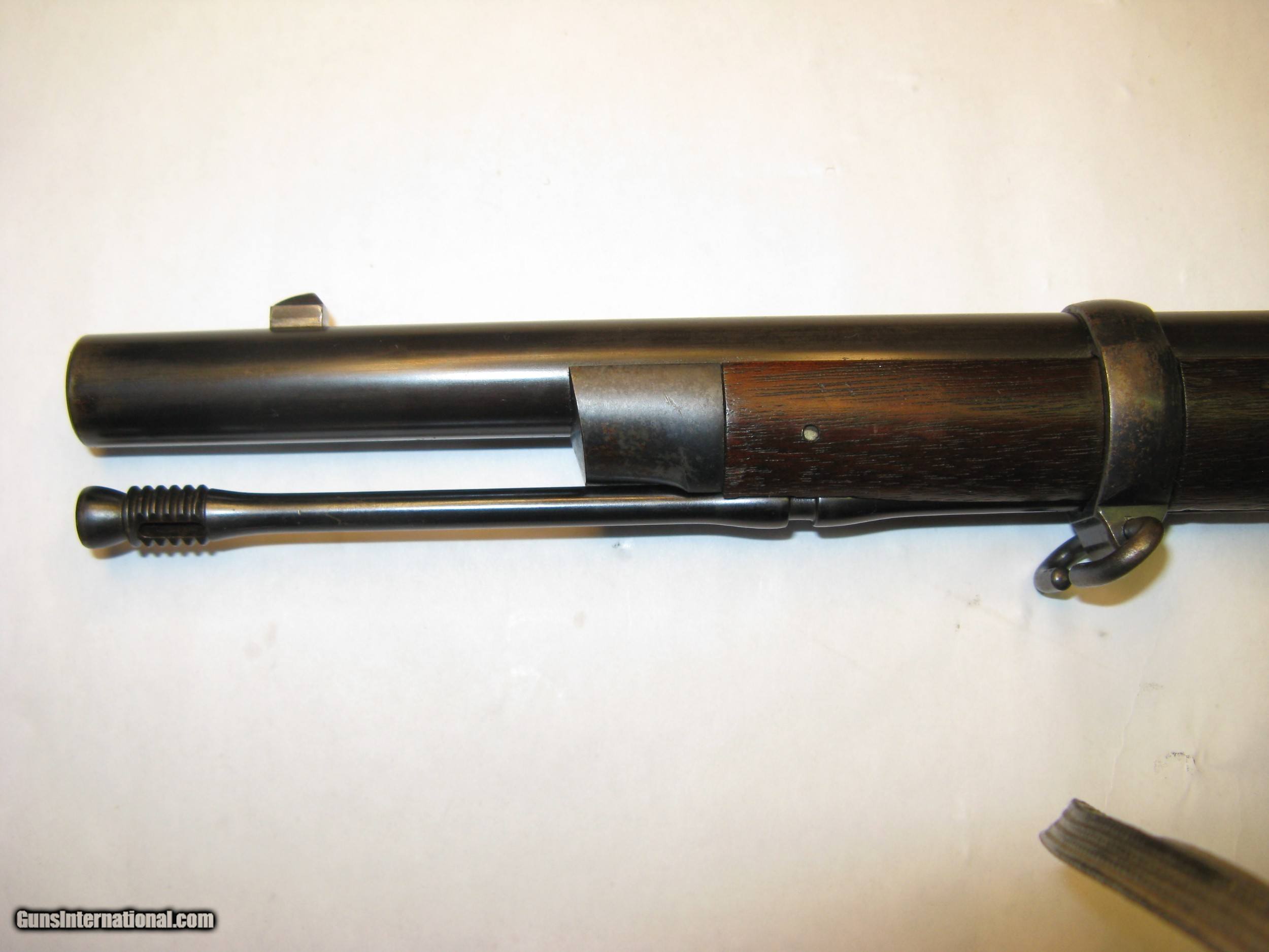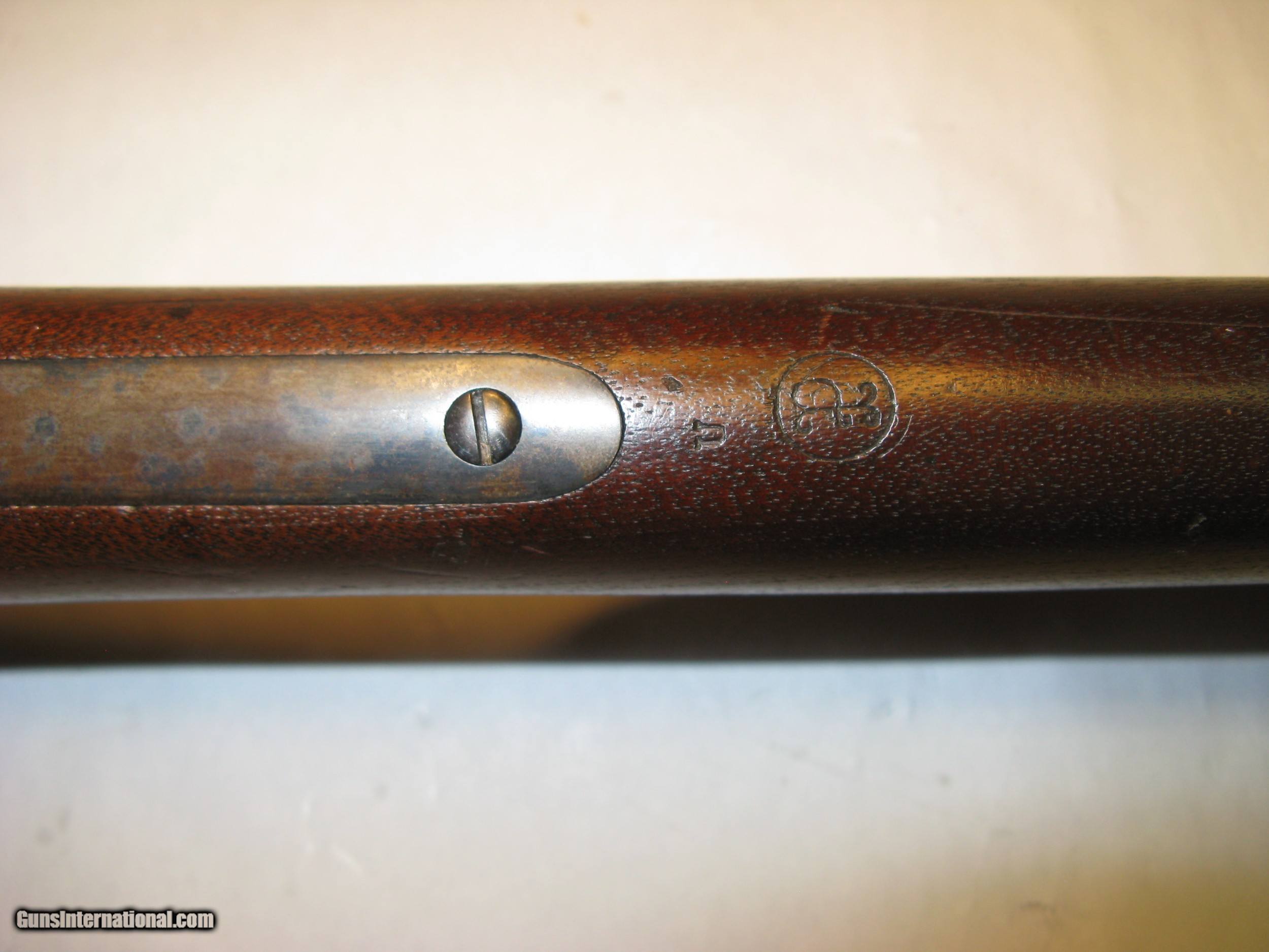 Description: Springfield Armory Allin (Trapdoor) 1873 Cadet Rifle Ser. # 67234 .45 / 55 Gov’t. After careful inspection I believe this rifle has been partially refinished, probably just the barrel. The question is, was it rebuilt at Springfield Armory at some point in its history or was it refinished by someone other than Springfield. It is correct in all respects and appears to be assembled from its original parts. See note below about a finished scrape on the barrel. This Cadet rifle was made in the second quarter of 1876 between April and June at the Springfield National Armory. Serial number 67234 is marked across the top rear of the receiver. The lock plate is marked with the spread eagle motif and U.S. SPRINGFIELD over 1873. The lock tumbler has two notches. The plate and hammer show almost 100% oil case hardening colors. The hammer has a fine stamped oval shaped knurl on the thumb spur and the small clipped lower face edge. The breach block is marked with MODEL / 1873 / eagle head / crossed arrows / U.S. It is a high arch configuration. The block and latch retain 100% color on internal surfaces and has thinned too about 80% on exposed surfaces. The receiver retains 100% color on internal surfaces and has thinned to about 80% on exposed surfaces. The forward edge of the receiver is .130” above the barrel. It has short and shallow gas ports. The barrel has a V (viewing proof, .065" high), P (firing proof, .065" high), eagle head (.218" tall) and P (final firing proof, .065" high). These are marked just forward of the receiver on the left side. There are 2 P’s (burst proofs) stamped on the bottom of the barrel and show that the rifle was proofed twice. One is 15/16” forward of the receiver and the second is 1 1/4” forward of the receiver. The barrel / receiver index marks are in perfect alignment. The barrel retains 90% blue with thinning for the first 2” at the muzzle due to use with a bayonet. There is a scratch or scrape about 1” long 12” back from the muzzle on the upper right side. When this damage was done it extended out and made a small nick in the right side of the stocks barrel channel. This scratch is not white, or bare metal, but is the same finish as the rest of the barrel showing that the barrel was refinished after the scratch was made. The stock has an excellent ESA (Erskine S. Allin) cartouche. There is a stock fitters letter U 1/4” rear of the trigger plate and a large script P in a 7/16” dia. circle (firing proof) 1/2” rear of the plate. There is a 1/8” tall number 19 (school rack number?) stamped in the top of the wrist 7/8” rear of the breach screw tang an another 3/8” forward of the butt plate tang. The butt plate shows a mottled blue of about 70%. It is marked US forward of the top screw. It has the reinforcement across the lower screw hole on the back. There are very few dents and scratches. No chips or cracks. The cleaning rod stop is marked PAT. AUG. 6 1870. The rod head is round with a flat non-cupped tip with six cannelures. The upper and lower barrel bands are marked with a small U and retain about 80% blue. The stacking swivel is marked on the left leg with PAT.M and the right leg with 31,74. The trigger plate, bow, and nose cap retain about 80% blue. The trigger plate has the square pads of the M1864 style. The trigger bow is the latter 1873 long leg version. The straight leg is properly positioned to the rear. Rear sight base is marked 1 through 4 and the leaf is marked 5 through 11. It is mounted with slotless screws. Specifications Published This rifle Overall length 49” 49” Cleaning rod length 32 9/16” 32 9/16” Rod cannelures 3 1/8” 3 1/8” Stock dims. Length 45.75” 45.87” Width at butt 1.50” 1.547 Wrist circumference 5 3/8” 5 3/8” Comb length 9” 9” Barrel dims. Published This rifle Length 29.60” 29.625” Dia. at breach 1.044” 1.040” Dia. at muzzle .730” .728” Front sight length 5/16” (.312) .348” Sight stud from muzzle 1 1/4” 1.243” Blade height from C/L .595” .595” Receiver width 1.076” 1.067” Trigger bow 1” max. width .995” Head space Go = .070 No Go = .075” .075” SOLD Antique: Yes Manufacturer: Springfield Armory Model: Cadet |