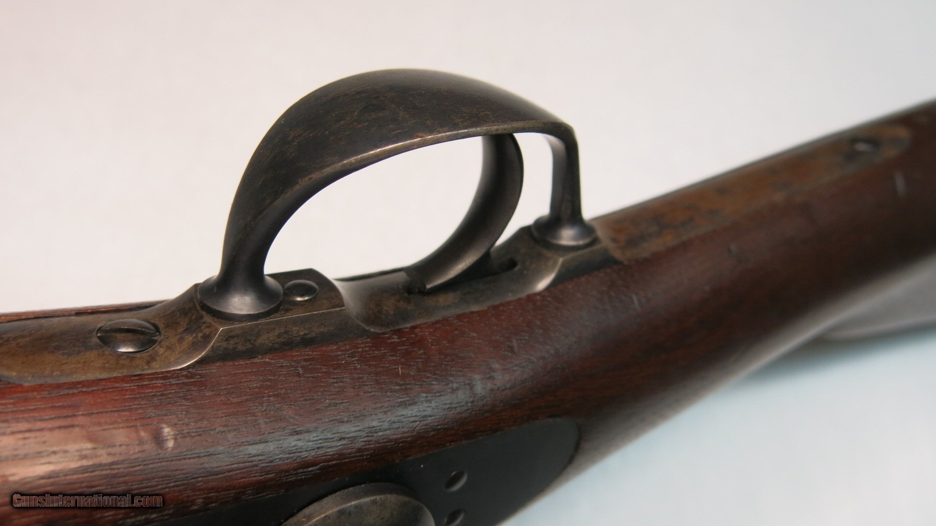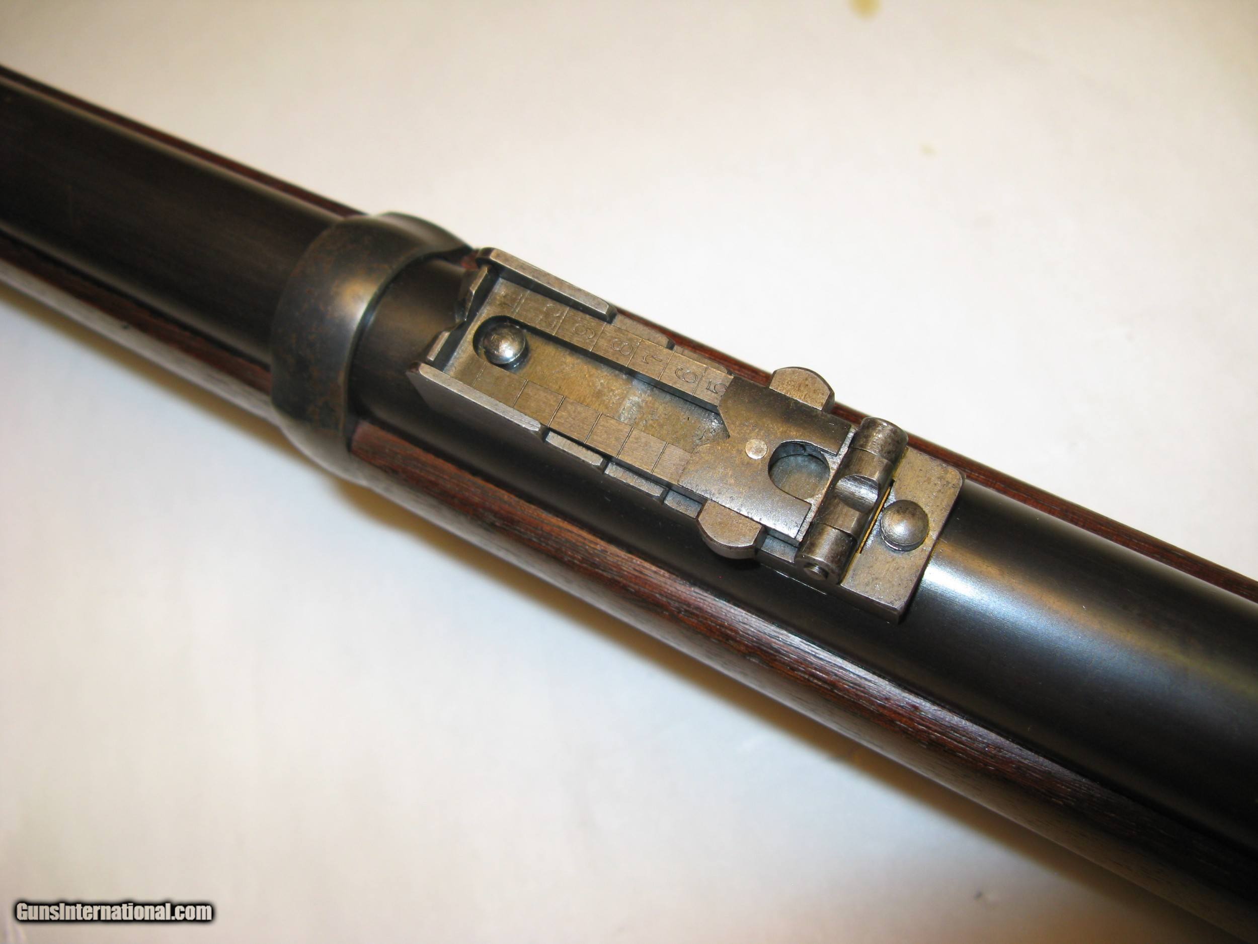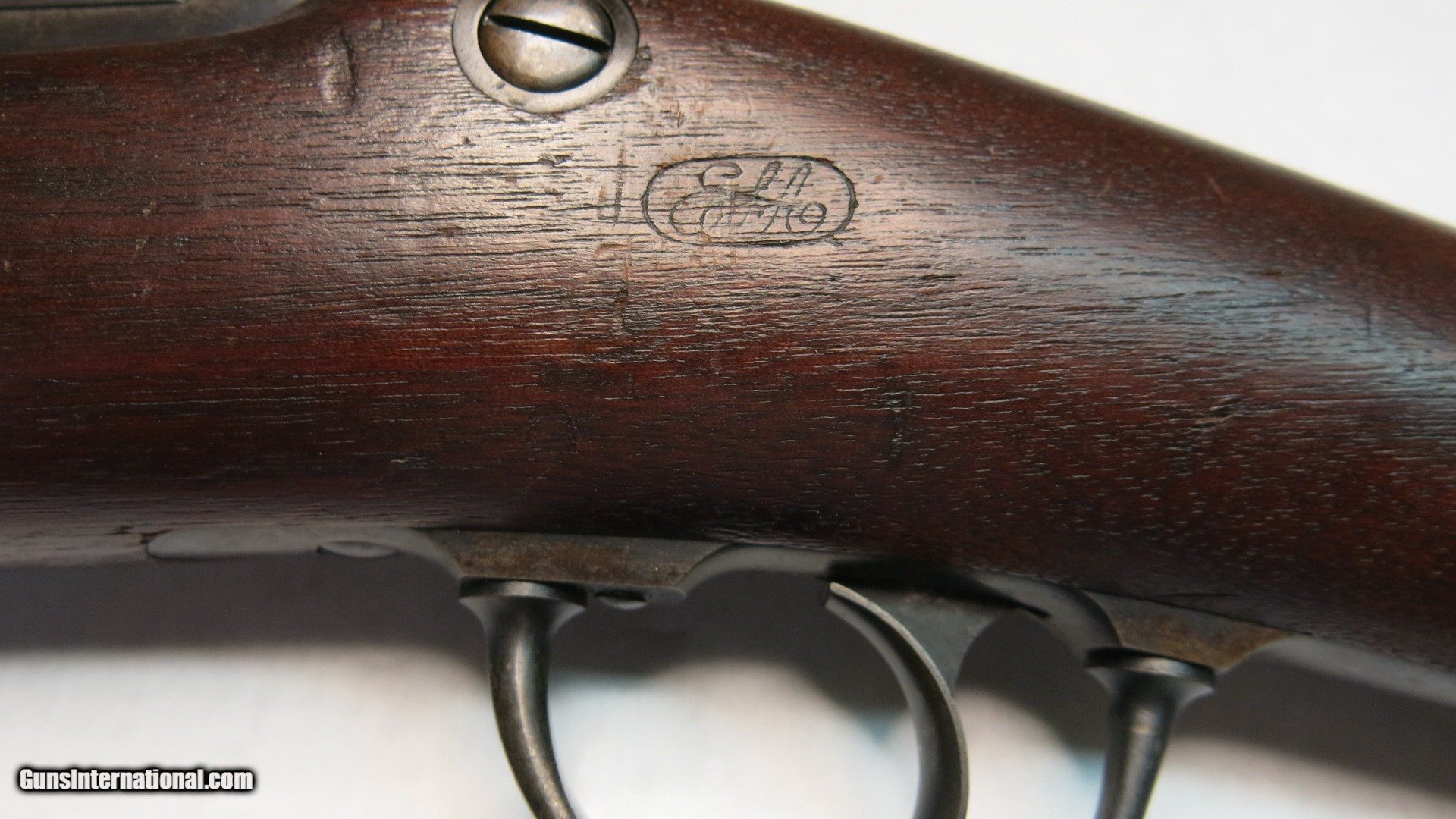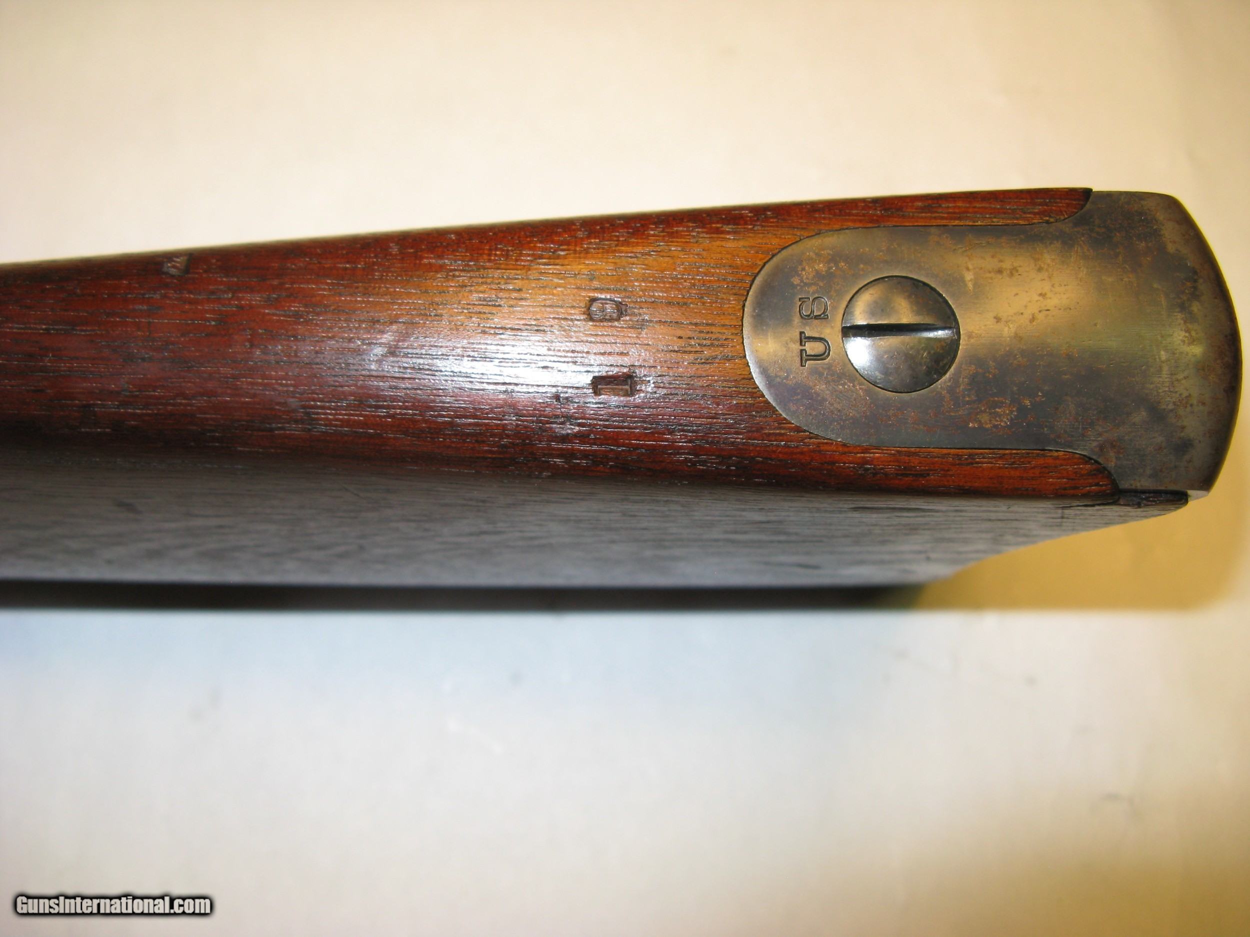 Description: Springfield Armory Allin (Trapdoor) 1873 Cadet Rifle Ser. # 67234 .45 / 55 Gov’t. After careful inspection I believe this rifle has been partially refinished, probably just the barrel. The question is, was it rebuilt at Springfield Armory at some point in its history or was it refinished by someone other than Springfield. It is correct in all respects and appears to be assembled from its original parts. See note below about a finished scrape on the barrel. This Cadet rifle was made in the second quarter of 1876 between April and June at the Springfield National Armory. Serial number 67234 is marked across the top rear of the receiver. The lock plate is marked with the spread eagle motif and U.S. SPRINGFIELD over 1873. The lock tumbler has two notches. The plate and hammer show almost 100% oil case hardening colors. The hammer has a fine stamped oval shaped knurl on the thumb spur and the small clipped lower face edge. The breach block is marked with MODEL / 1873 / eagle head / crossed arrows / U.S. It is a high arch configuration. The block and latch retain 100% color on internal surfaces and has thinned too about 80% on exposed surfaces. The receiver retains 100% color on internal surfaces and has thinned to about 80% on exposed surfaces. The forward edge of the receiver is .130” above the barrel. It has short and shallow gas ports. The barrel has a V (viewing proof, .065" high), P (firing proof, .065" high), eagle head (.218" tall) and P (final firing proof, .065" high). These are marked just forward of the receiver on the left side. There are 2 P’s (burst proofs) stamped on the bottom of the barrel and show that the rifle was proofed twice. One is 15/16” forward of the receiver and the second is 1 1/4” forward of the receiver. The barrel / receiver index marks are in perfect alignment. The barrel retains 90% blue with thinning for the first 2” at the muzzle due to use with a bayonet. There is a scratch or scrape about 1” long 12” back from the muzzle on the upper right side. When this damage was done it extended out and made a small nick in the right side of the stocks barrel channel. This scratch is not white, or bare metal, but is the same finish as the rest of the barrel showing that the barrel was refinished after the scratch was made. The stock has an excellent ESA (Erskine S. Allin) cartouche. There is a stock fitters letter U 1/4” rear of the trigger plate and a large script P in a 7/16” dia. circle (firing proof) 1/2” rear of the plate. There is a 1/8” tall number 19 (school rack number?) stamped in the top of the wrist 7/8” rear of the breach screw tang an another 3/8” forward of the butt plate tang. The butt plate shows a mottled blue of about 70%. It is marked US forward of the top screw. It has the reinforcement across the lower screw hole on the back. There are very few dents and scratches. No chips or cracks. The cleaning rod stop is marked PAT. AUG. 6 1870. The rod head is round with a flat non-cupped tip with six cannelures. The upper and lower barrel bands are marked with a small U and retain about 80% blue. The stacking swivel is marked on the left leg with PAT.M and the right leg with 31,74. The trigger plate, bow, and nose cap retain about 80% blue. The trigger plate has the square pads of the M1864 style. The trigger bow is the latter 1873 long leg version. The straight leg is properly positioned to the rear. Rear sight base is marked 1 through 4 and the leaf is marked 5 through 11. It is mounted with slotless screws. Specifications Published This rifle Overall length 49” 49” Cleaning rod length 32 9/16” 32 9/16” Rod cannelures 3 1/8” 3 1/8” Stock dims. Length 45.75” 45.87” Width at butt 1.50” 1.547 Wrist circumference 5 3/8” 5 3/8” Comb length 9” 9” Barrel dims. Published This rifle Length 29.60” 29.625” Dia. at breach 1.044” 1.040” Dia. at muzzle .730” .728” Front sight length 5/16” (.312) .348” Sight stud from muzzle 1 1/4” 1.243” Blade height from C/L .595” .595” Receiver width 1.076” 1.067” Trigger bow 1” max. width .995” Head space Go = .070 No Go = .075” .075” SOLD Antique: Yes Manufacturer: Springfield Armory Model: Cadet |