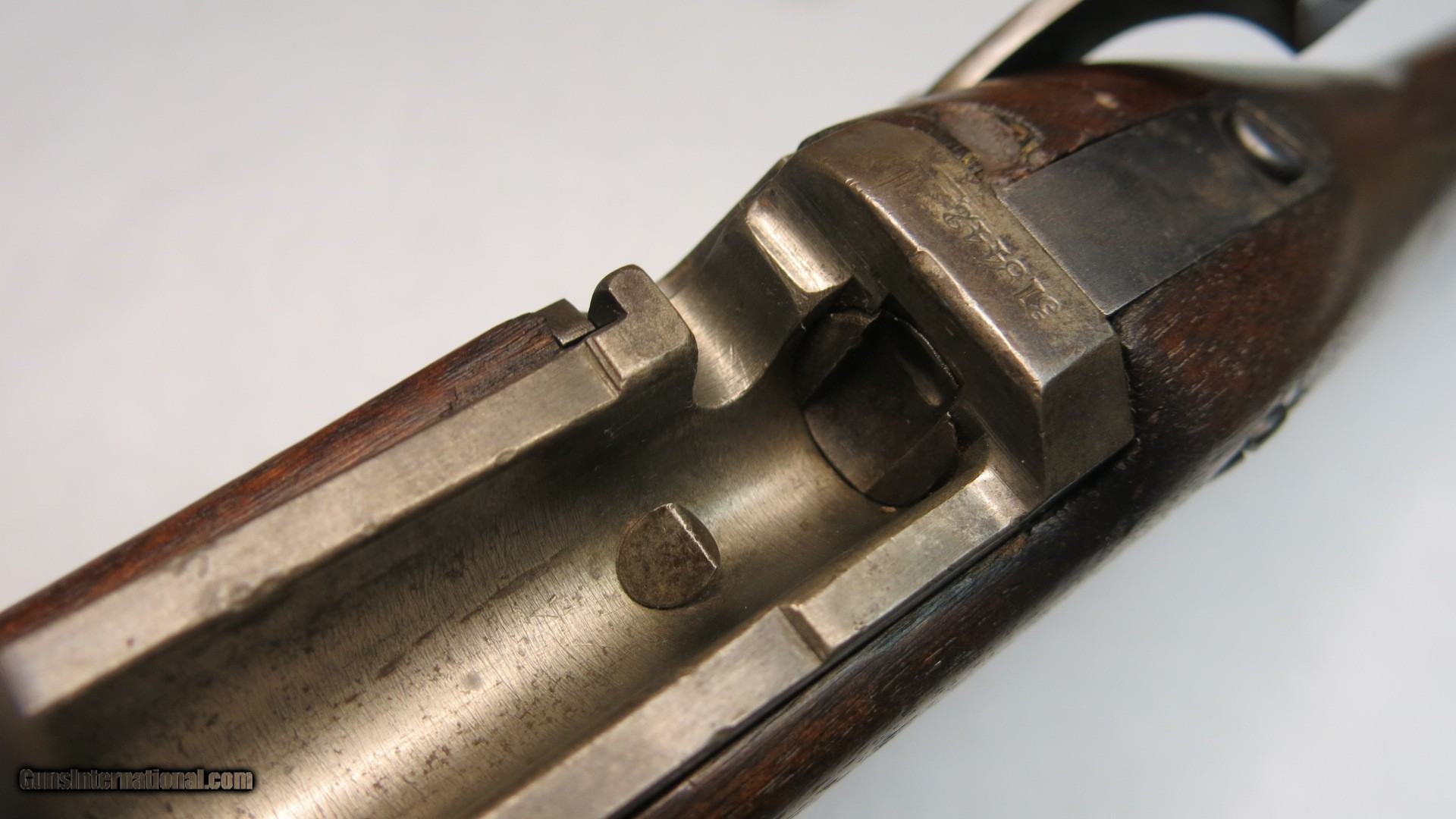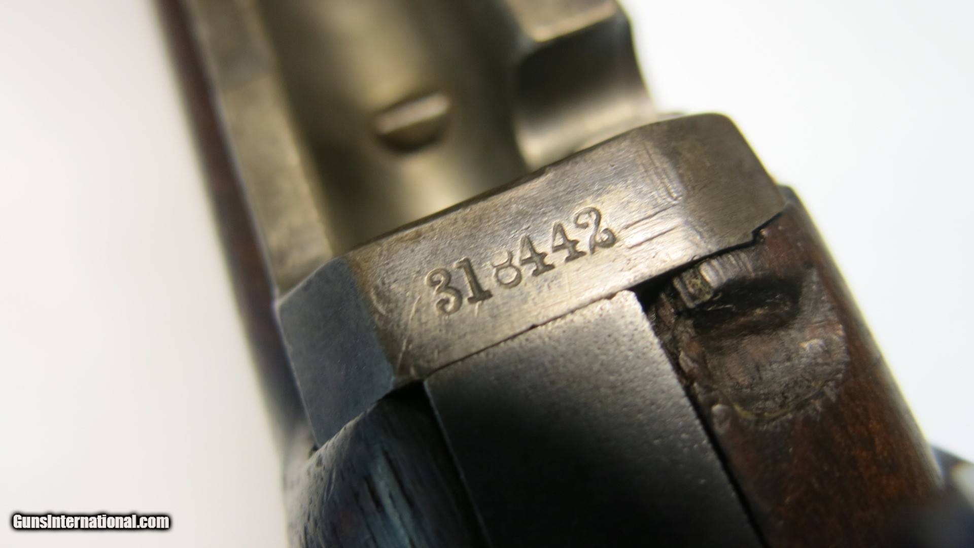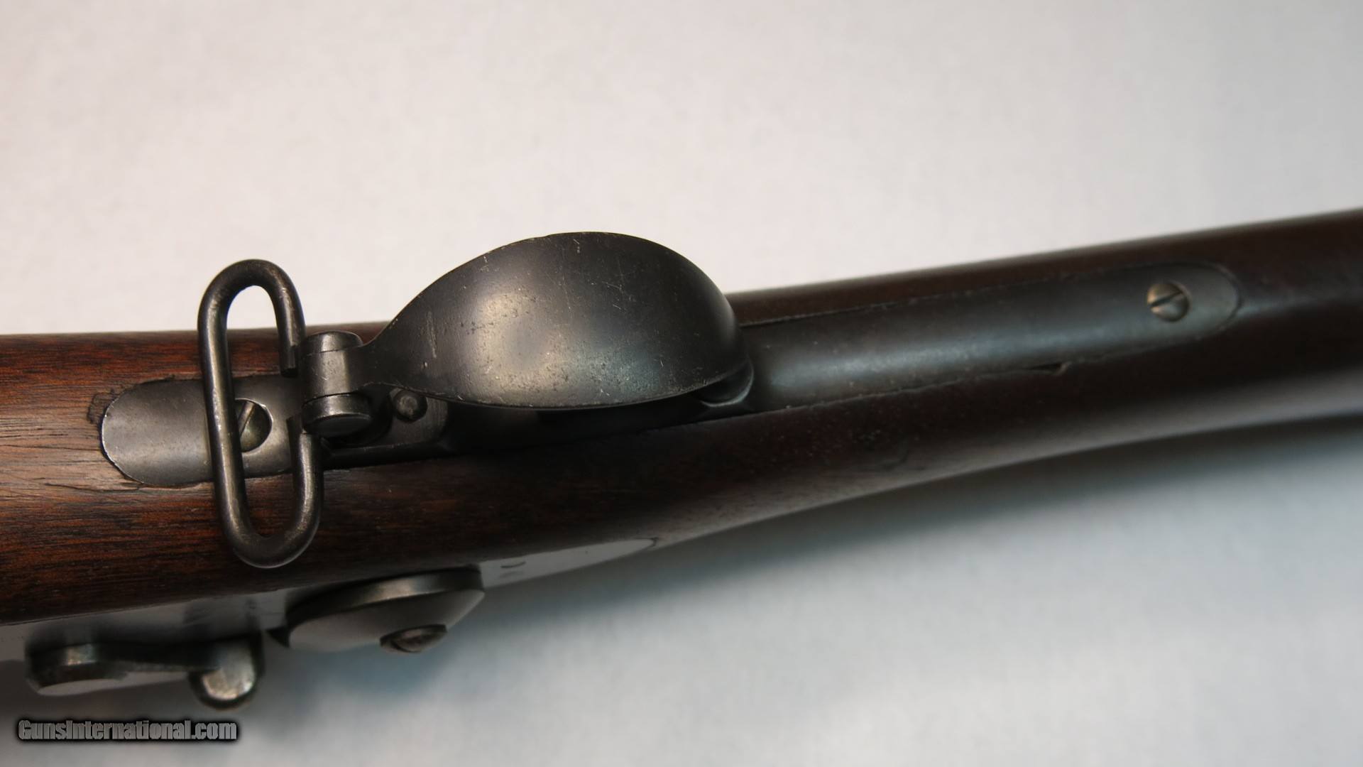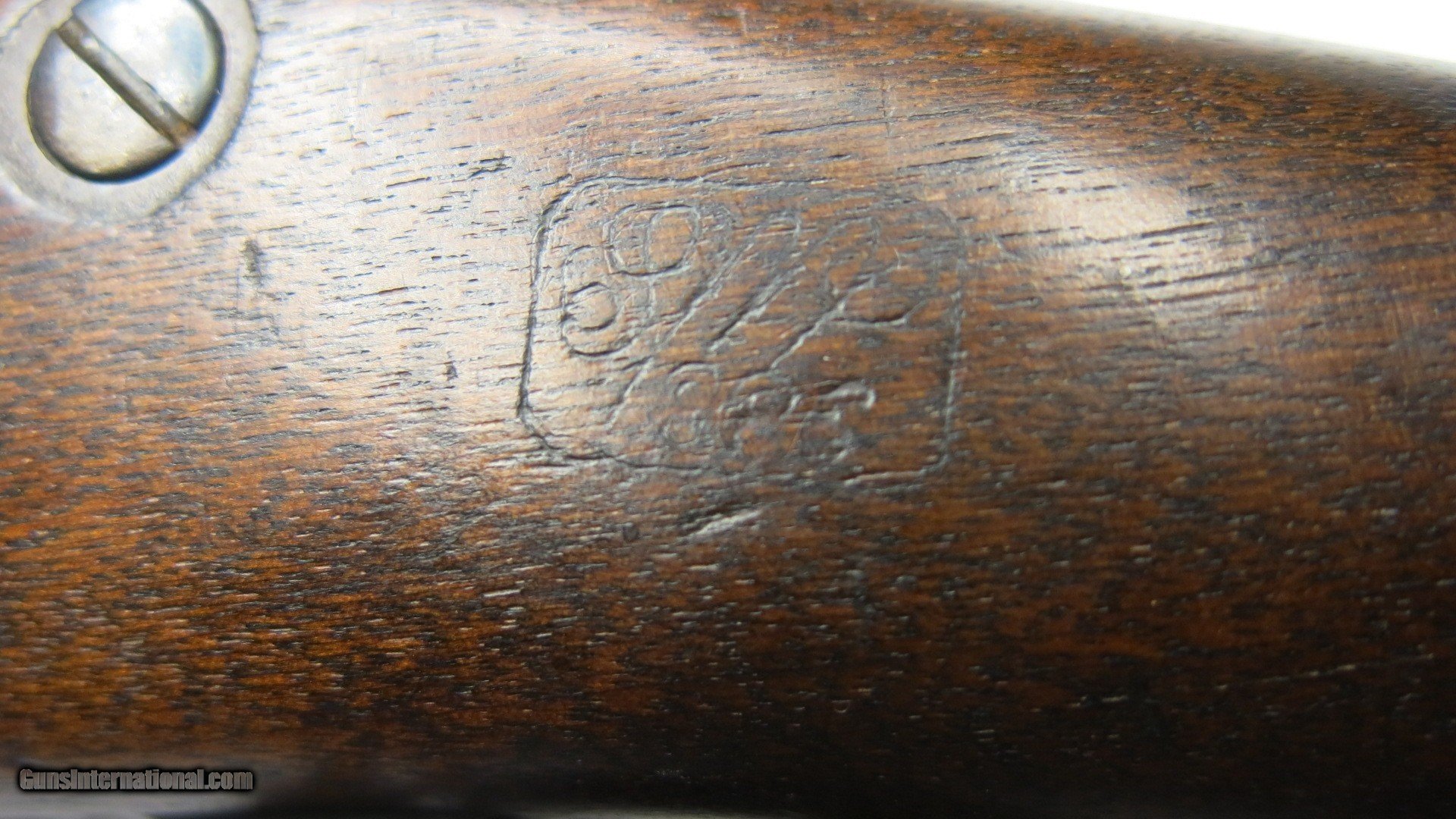 Description: Springfield Armory Experimental Model 1884 Round Rod Bayonet Rifle Serial number 318442 .45 - 70 - 500 This rifle was once owned by Al Frasca, a noted expert on Trapdoor Rifles. His write up for the sale of the rifle is: "This is one of the 1000 Exp. RRB Rifles produced (500 in Dec. 1885 and 500 in Jan 1886). The rifle has two unique characteristics: (1) The first round rod bayonet mechanism and, (2) the adjustable front sight is in the sight cover and not attached to the barrel. More than likely, the new ones that were not field testing, were the ones used in the assembly of some of the later M88 RRB rifles (some Exp. M88 RRB rifles made in 1889 and M88 RRB rifles assembled in 1891 have M84 RRB receivers). From the large number of M84 RRB front sight hoods available in the 1970's, it is assumed that many of these guns were disassembled. Thus, even though about 1000 were produced, not too many remain. This rifle was produced in 1886 as confirmed by the cartouche. It has not been sanded or refinished. Mallory's SRS books list this rifle as returned from the 10th infantry on July 12, 1892. Since it was a used rifle, its receiver was not a candidate for use on M88 RRB rifles. Combining the fact that it is a used rifle, along with the late return date probably justifies why it was never disassembled. The rifling in the bore is very bright with deep rifling and a few very small patches of damage." An addition to the above is that it was issued to Company G of the 10th Infantry. The 10th was organized at Carlisle Barracks, Penn. on March 3, 1855. There were 1,013 produced. 504 in 1885 and 509 in 1886. The widely accepted serial number range is from 314,000 to 321,000. They were given a nickname of "flatlatch" because the rods locking fingers are not clearly visible. These 1884 RRB rifles were Springfield's third attempt at making a ram rod bayonet. The first was 1,014 M1880's with a triangular rod and the second was in 1882 when 26 were experimentally made also with triangular rods. Their fourth and final rod bayonet rifle was the M1888 RRB. These rifles were originally thought to have used the first version of the Buffington rear sight that utilized a rack and pinion elevation adjustment. There was no marking on the upper right corner of the leaf that would normally designate R (rifle), C (carbine) or XC (exp. carbine). New research has proven this fact to be wrong. In fact, they used the second type Buffington rear sight that does have the R on the upper right corner of the leaf. This rifle came with a first type sight that has been changed to the second type. The front sight two position blade is fixed within the sight cover with a slotted screw and not attached to the barrel. This is the only model where the front sight is not attached directly to the barrel. "...the sight is adjustable for use of a coarse and fine sight, turning 45 degrees forward and back around the spring screw pin which holds it in place. The rifles are issued with the coarse point up. To change to the fine point: with the uncut end of a lead pencil or any piece of wood of like dimensions, insert under the sight cover, from the front, and, resting on the top of the sight, push it so as to turn it around the aforesaid pin until fully down on the bottom of the mortise in the sight cover in which the sight is located. This can be seen by looking under it." The receiver / barrel reference marks are in perfect alignment. The bottom of the barrel has a 7/8" long deep longitudinal gouge centered 3" from the receiver and is similar to pipe wrench tooth marks. There are other circumferential marks that appear to be from the barrel slipping in the jaws of a vise. These are most visible to the left side of the rear sight. This leads me to believe the barrel has been off some time in the past or is not original to the receiver. Head space is perfect at .070". The top left rear has the V P eagle head P. There is a change in finish of the barrel 6 inches from the muzzle. It appears that there is a change in taper because of the rod latch assembly. The lock plate has the standard eagle motif and U.S. / SPRINGFIELD. The breech block is marked with U.S. / MODEL / 1873. This marking was used from serial number 205,000 to 360,000. The stock does have the short wrist and long comb. The stocks boxed cartouche on the left wrist is SWP over 1886 for Samuel W. Porter. There is what appears to be a D stock inspectors mark just rear of the trigger plate and the final firing proof is present rear of the D. The butt plate, with swiveling cover has the storage compartment behind it that contains the 1882 headless shell extractor, 1879 combination tool and wiper head. There is no cleaning rod channel clean out hole under the front of the trigger plate. There is a sliver of wood missing in the lock assembly mortise along the upper front area that extends into the receiver channel. The forend just rear of the bayonet locking assembly shows a little wood wear and some splinters missing on the edges of the rod channel that have been smoothed out and appear to be original to the rifles assembly. Various markings 8, II, Y, 15 bottom of receiver ~, 2, R bottom of barrel A top rear of barrel S rear of barrel N tumbler Y sear H sear spring 4 main spring hook end O, 3 trigger V, B, O, | trigger plate N trigger bow SOLD Antique: Yes Rifle Caliber: .45-70 Government Manufacturer: Springfield Armory |