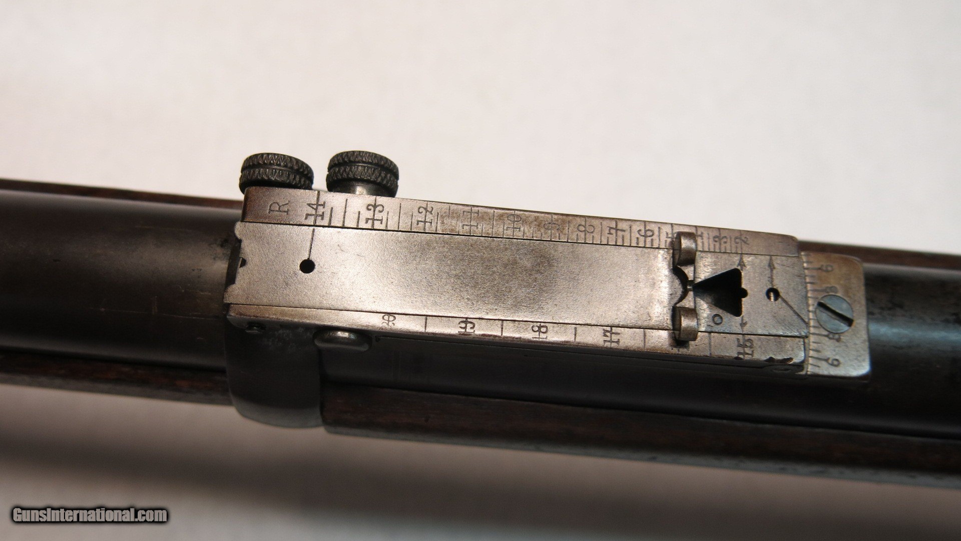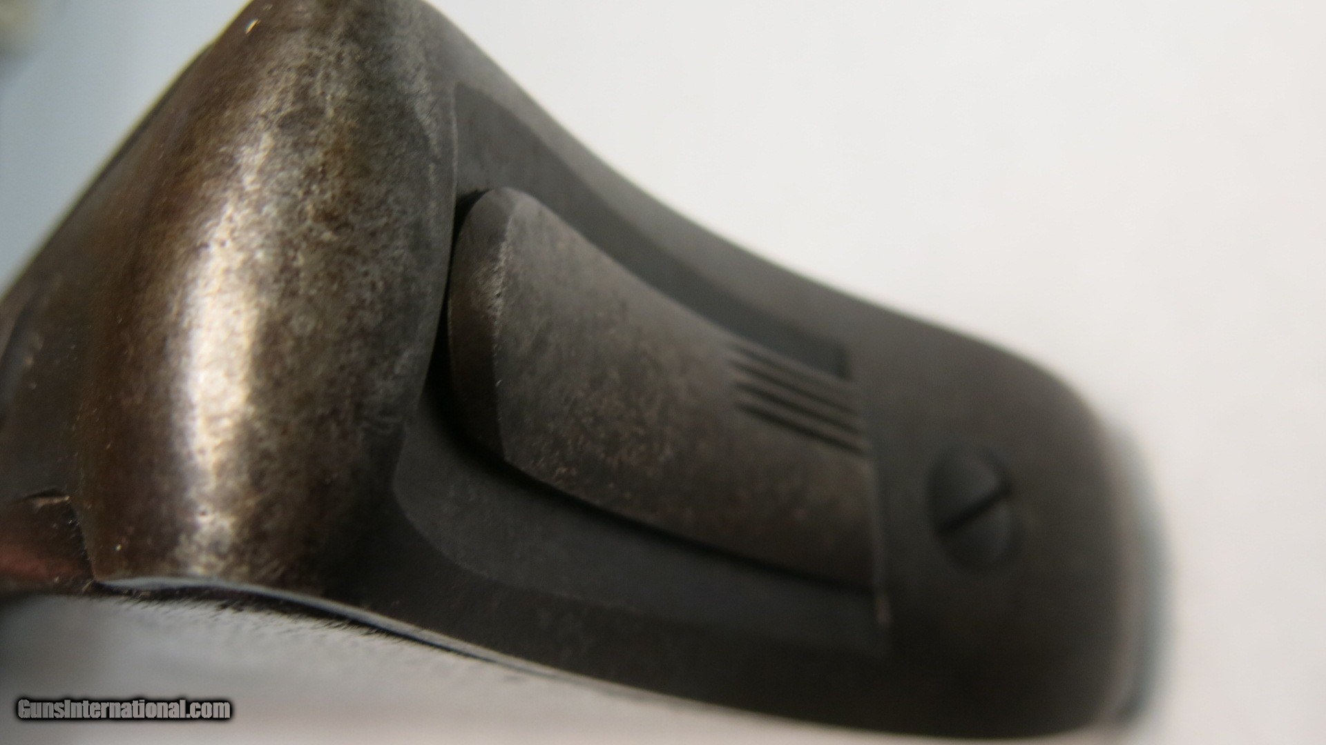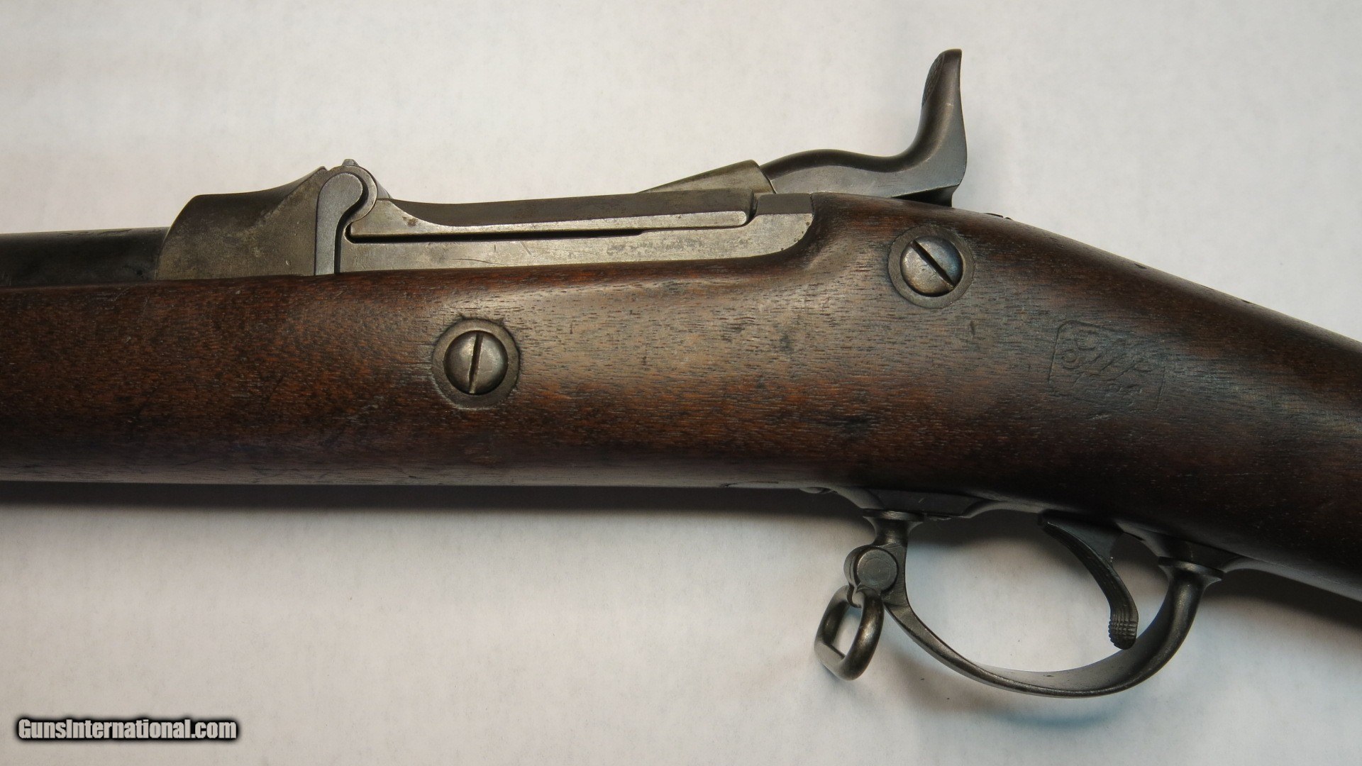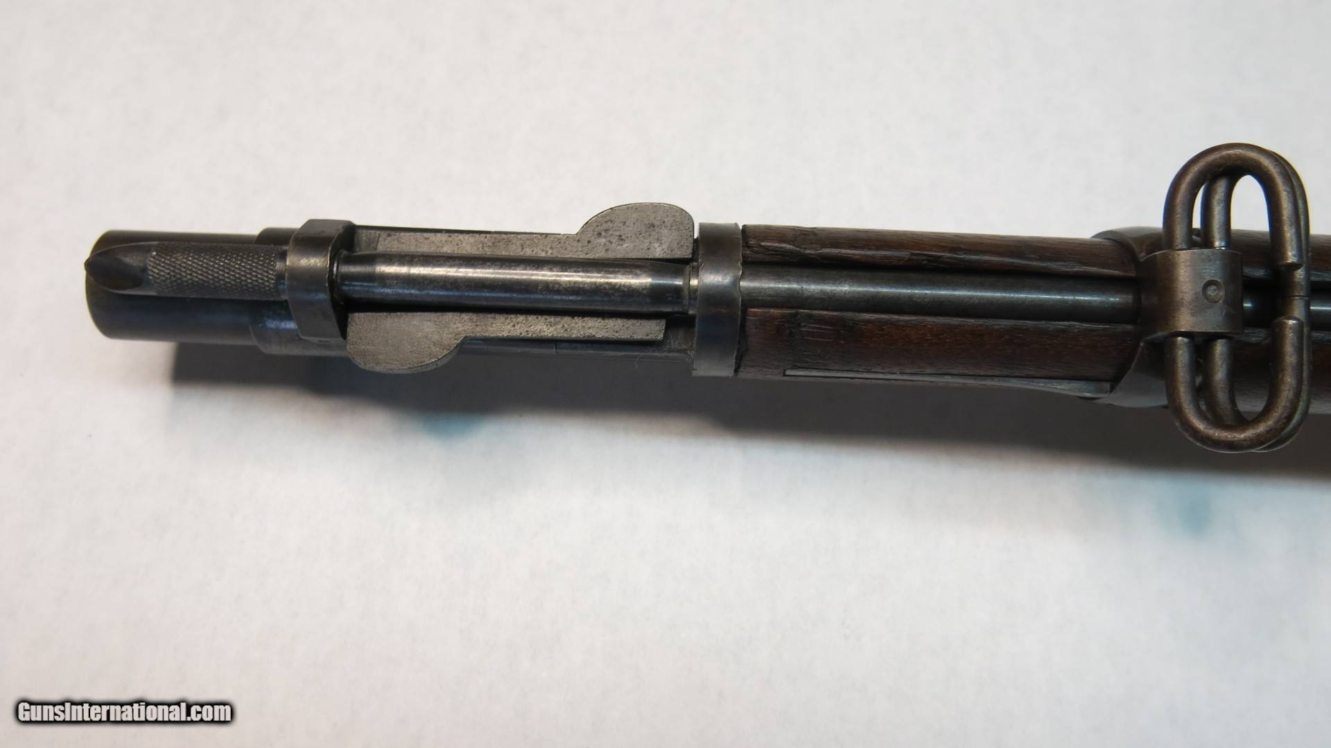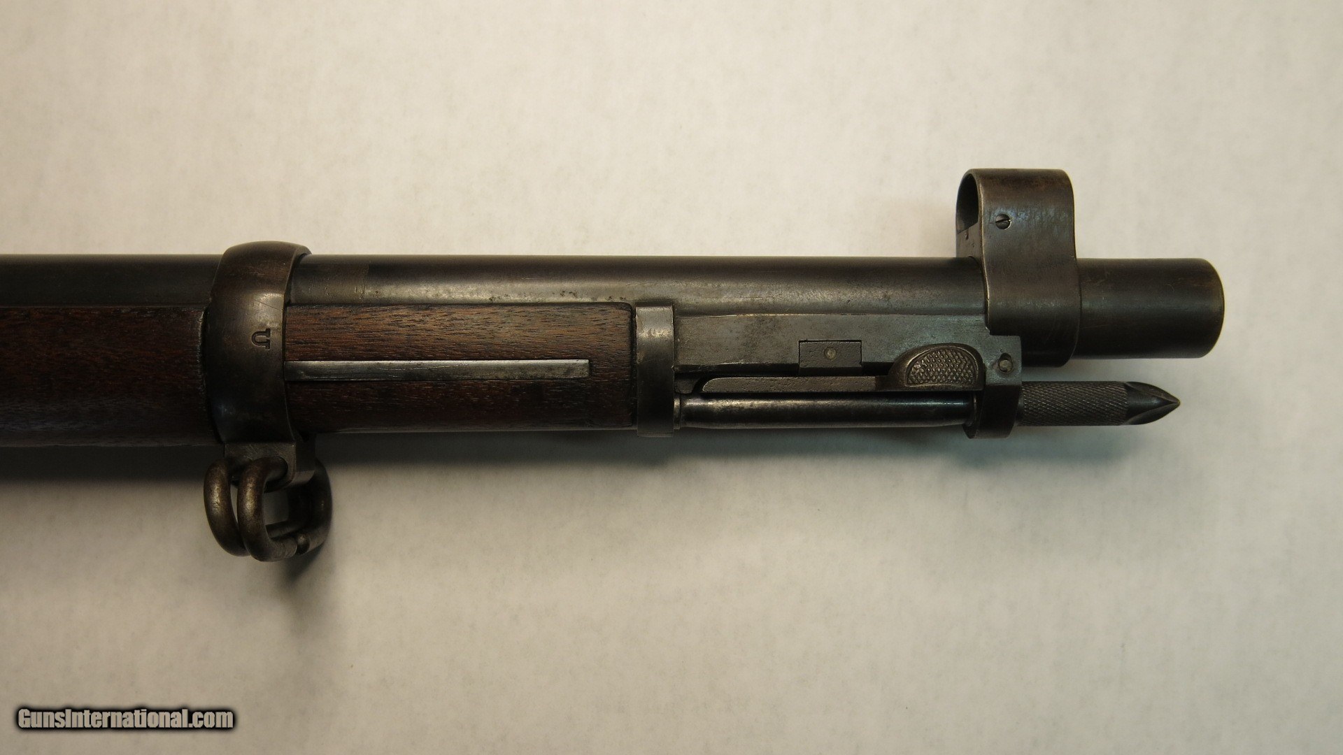 Description: Springfield Armory Experimental Model 1884 Round Rod Bayonet Rifle Serial number 318442 .45 - 70 - 500 This rifle was once owned by Al Frasca, a noted expert on Trapdoor Rifles. His write up for the sale of the rifle is: "This is one of the 1000 Exp. RRB Rifles produced (500 in Dec. 1885 and 500 in Jan 1886). The rifle has two unique characteristics: (1) The first round rod bayonet mechanism and, (2) the adjustable front sight is in the sight cover and not attached to the barrel. More than likely, the new ones that were not field testing, were the ones used in the assembly of some of the later M88 RRB rifles (some Exp. M88 RRB rifles made in 1889 and M88 RRB rifles assembled in 1891 have M84 RRB receivers). From the large number of M84 RRB front sight hoods available in the 1970's, it is assumed that many of these guns were disassembled. Thus, even though about 1000 were produced, not too many remain. This rifle was produced in 1886 as confirmed by the cartouche. It has not been sanded or refinished. Mallory's SRS books list this rifle as returned from the 10th infantry on July 12, 1892. Since it was a used rifle, its receiver was not a candidate for use on M88 RRB rifles. Combining the fact that it is a used rifle, along with the late return date probably justifies why it was never disassembled. The rifling in the bore is very bright with deep rifling and a few very small patches of damage." An addition to the above is that it was issued to Company G of the 10th Infantry. The 10th was organized at Carlisle Barracks, Penn. on March 3, 1855. There were 1,013 produced. 504 in 1885 and 509 in 1886. The widely accepted serial number range is from 314,000 to 321,000. They were given a nickname of "flatlatch" because the rods locking fingers are not clearly visible. These 1884 RRB rifles were Springfield's third attempt at making a ram rod bayonet. The first was 1,014 M1880's with a triangular rod and the second was in 1882 when 26 were experimentally made also with triangular rods. Their fourth and final rod bayonet rifle was the M1888 RRB. These rifles were originally thought to have used the first version of the Buffington rear sight that utilized a rack and pinion elevation adjustment. There was no marking on the upper right corner of the leaf that would normally designate R (rifle), C (carbine) or XC (exp. carbine). New research has proven this fact to be wrong. In fact, they used the second type Buffington rear sight that does have the R on the upper right corner of the leaf. This rifle came with a first type sight that has been changed to the second type. The front sight two position blade is fixed within the sight cover with a slotted screw and not attached to the barrel. This is the only model where the front sight is not attached directly to the barrel. "...the sight is adjustable for use of a coarse and fine sight, turning 45 degrees forward and back around the spring screw pin which holds it in place. The rifles are issued with the coarse point up. To change to the fine point: with the uncut end of a lead pencil or any piece of wood of like dimensions, insert under the sight cover, from the front, and, resting on the top of the sight, push it so as to turn it around the aforesaid pin until fully down on the bottom of the mortise in the sight cover in which the sight is located. This can be seen by looking under it." The receiver / barrel reference marks are in perfect alignment. The bottom of the barrel has a 7/8" long deep longitudinal gouge centered 3" from the receiver and is similar to pipe wrench tooth marks. There are other circumferential marks that appear to be from the barrel slipping in the jaws of a vise. These are most visible to the left side of the rear sight. This leads me to believe the barrel has been off some time in the past or is not original to the receiver. Head space is perfect at .070". The top left rear has the V P eagle head P. There is a change in finish of the barrel 6 inches from the muzzle. It appears that there is a change in taper because of the rod latch assembly. The lock plate has the standard eagle motif and U.S. / SPRINGFIELD. The breech block is marked with U.S. / MODEL / 1873. This marking was used from serial number 205,000 to 360,000. The stock does have the short wrist and long comb. The stocks boxed cartouche on the left wrist is SWP over 1886 for Samuel W. Porter. There is what appears to be a D stock inspectors mark just rear of the trigger plate and the final firing proof is present rear of the D. The butt plate, with swiveling cover has the storage compartment behind it that contains the 1882 headless shell extractor, 1879 combination tool and wiper head. There is no cleaning rod channel clean out hole under the front of the trigger plate. There is a sliver of wood missing in the lock assembly mortise along the upper front area that extends into the receiver channel. The forend just rear of the bayonet locking assembly shows a little wood wear and some splinters missing on the edges of the rod channel that have been smoothed out and appear to be original to the rifles assembly. Various markings 8, II, Y, 15 bottom of receiver ~, 2, R bottom of barrel A top rear of barrel S rear of barrel N tumbler Y sear H sear spring 4 main spring hook end O, 3 trigger V, B, O, | trigger plate N trigger bow SOLD Antique: Yes Rifle Caliber: .45-70 Government Manufacturer: Springfield Armory |