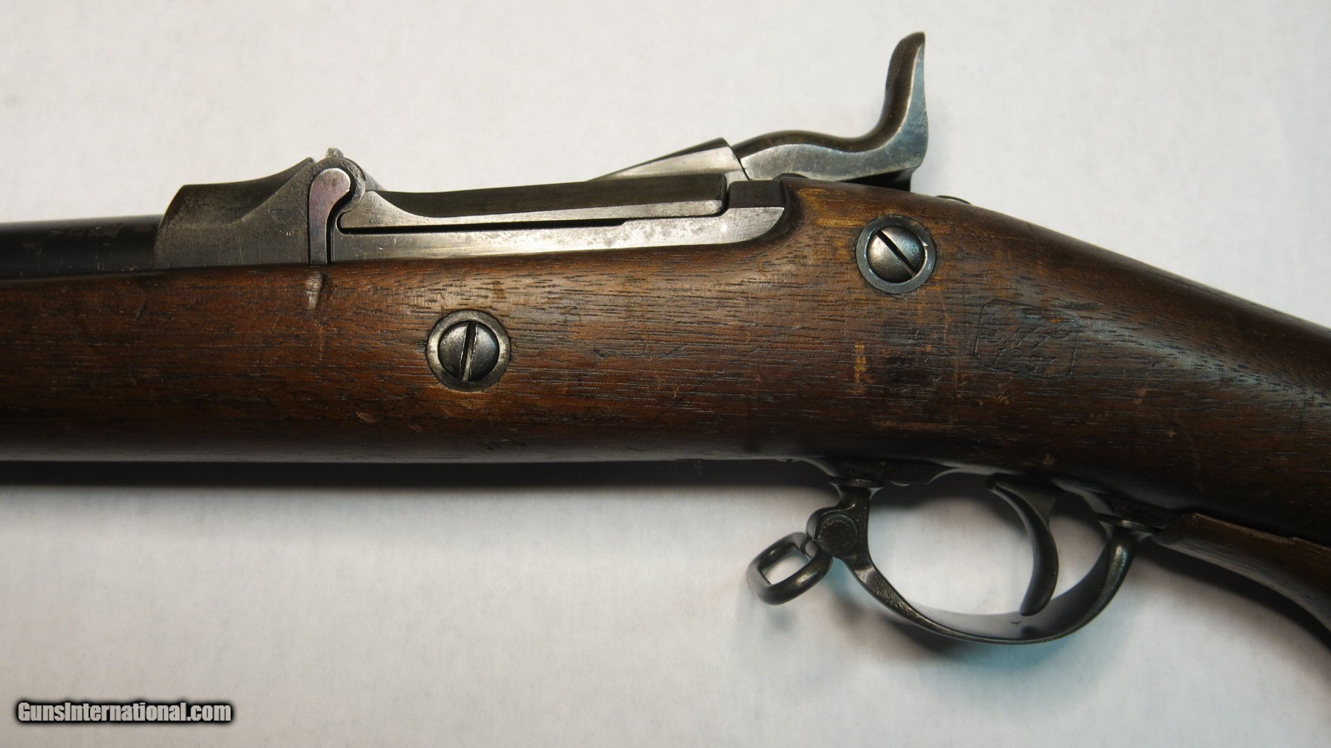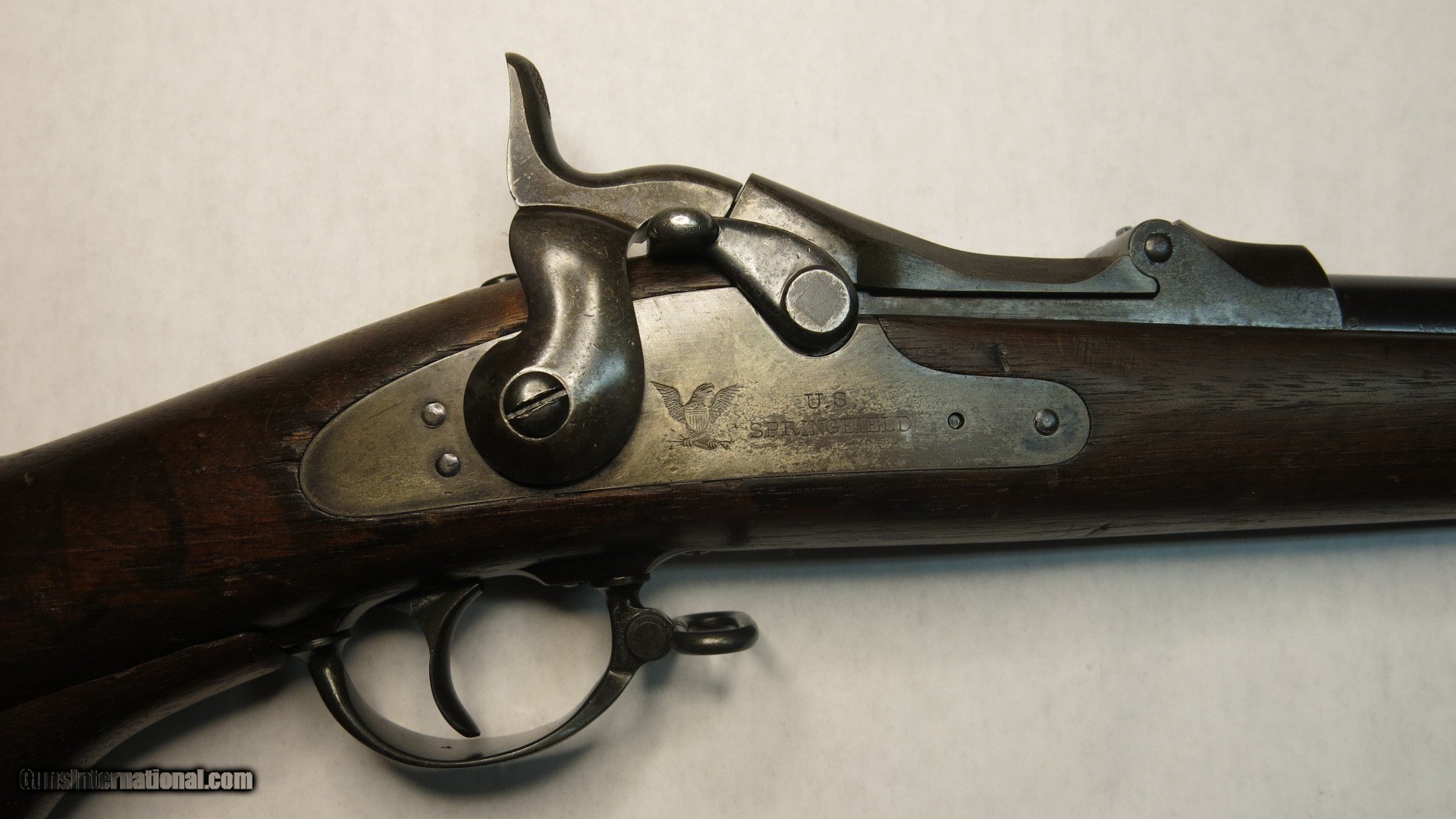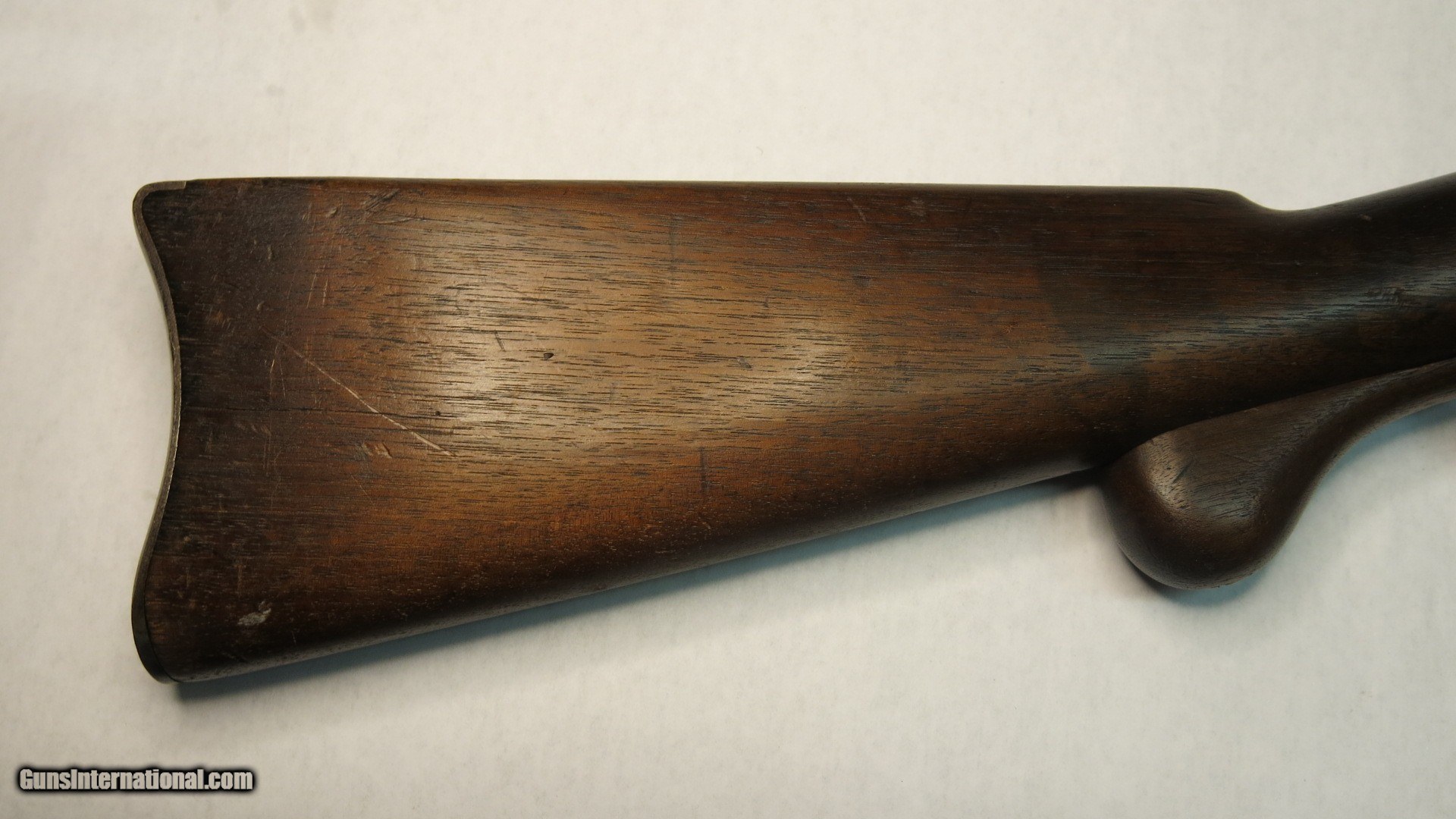 Description: Springfield Armory Long Range Experimental Rifle Serial number 161921 .45-80-500 This quote is from Al Frasca’s book “The .45-70 Springfield” on page 94. “The development of the long-range rifle is very confusing and almost impossible to follow. It appears that army marksmen were very interested in participating in national and international rifle competitions. However, the army was not willing to fund the venture or to make a special competition arm. Somewhere in the negotiations and manipulations, it was decided that a “sniper rifle,” needed to be perfected and tested by the marksmen in the army. Thus, under the pretext of producing the “sniper rifle,” the army acquired what is referred to as long range rifles. Since the arms were made at different times and for different groups, there are quite significant variations.” This quote is from Al Frasca’s Springfield Trapdoor Rifle Information Centersite. “Long range rifles were made over several years (1879-1882). They were originally made for soldiers in the marksmanship program. Therefore, trainers in charge of each team wanted their own designs incorporated into the team's rifles. Some requests were for special Bull rear sights, several varieties of pistol grips, various trigger shapes and serrations, thumb rests in the wrist of the stock and Hotchkiss rather than standard butt stocks. An article in the March, 1959 issue of “The Gun Report” by Robert M. McDonald states “Two experimental arms were made with three and six lands and grooves, and an 18-inch twist. Another experimental intermediate type had nineteen and five-eighths inch twist with six lands and grooves.” This rifle does have a 19 5/8” twist with six lands and grooves. He also states this bore configuration was tested with a round of 80 grains of Hazard Fg and a 500 grain .453 / .466 paper patched bullet of 1 to 19 tin to lead alloy. Another quote in the article under the heading Conclusions states “Although the “Sharpshooter” arms were a failure from the performance standpoint, they taught us a great deal about the infant science of ballistics, which was a rather hit-and-miss proposition at the times.” The serial numbers for these guns range from 114,000 to 163,000, with the 160,000 numbers being most common. The barrels are stamped "H/G/R" or "H/G." Very few of these rifles were produced and they are now considered very valuable. The best estimates are that there were 150 to 170 Long Range rifles made. The problem is how to distinguish some long-range rifles from experimental or trial rifles. It is believed that there are only about 50 of these rifles currently documented and known to exist. Their rarity leads to confusion when considering what features should be expected to find on any one rifle relative to its components, serial number, date of manufacture, history, etc. This rifles receiver, with serial number 161921, was made between October and December of 1881. It is the later 1.20" wide version with the longer and deeper gas ports and came into use after December 1878. There is some confusion as to what variant of breech block this rifle has and when it was made. Font is 0.070" tall. Low arch and rounded shoulders. Thick wall firing pin housing. Width is 1.20". A feature of this block is that the letter L is missing its bottom leg and looks like an I. The U and S are not followed by periods. This leads one to believe it fits the description of a block made in early 1883. An identical breech block has been seen on another long-range rifle whose receivers serial number shows it was made in 1881 and is believed to be original to the rifle. Its serial number is 162359 and sold in October of 2015 by James D. Julia. It was from the Jonathan Peck collection. This block's firing pin is a fourth type and was used roughly between June of 1878 and January of 1881. The barrels rifling has six lands and grooves with a right hand 19 5/8” twist. The bore diameter is .4522” and the groove diameter is .4655”. Groove depth is .0066”. Lands are .075” wide and the grooves are .160” wide. Chamber length is 2.420". Throat length is approximately .060”. Head space measures .079”. The chamber, bore and crown are in excellent condition. The tenon is rounded that came into use after October 1878. The reference marks on the right side of the barrel and receiver are in perfect alignment. The bottom of the barrel has a few areas that show corrosion and pitting. There is damage to the barrels exterior and is located 3 1/2” forward of the receiver, under the rear sight, and completely incircles the barrel. A possible explanation is, if the barrel was set up in a lathe and a cutter was accidently run into the turning barrel the cutter would start shallow and dig in deeper as the barrel turned, especially if the cross feed was engaged. The cut is cosmetic and does not affect function in any way. There are file marks and missing original finish where the damage was smoothed out so the rear sight can set flat on the barrel. The area has been cold blued to make the damage less visible. There are also a few vise jaw marks. The stocks cartouche is SWP (Samuel W. Porter) over 1881. There is a final firing proof (circled P) rear of the trigger plate and pistol grip. There is a stock inspectors mark but it is partially obliterated and not legible. The butt is the standard Springfield service configuration and not the Hotchkiss butt that was used on some long-range rifles. There are nicks, dents and scratches showing significant usage. There are drying cracks in the butt with the most significant one on the left side. Dark oil stains are visible around most metal to wood contact surfaces. The rear trigger plate / pistol grip screw hole was stripped out and has been repaired. The screw is a standard wood screw and is not correct. The stock has been cleaned, oiled and waxed. Some of these rifles were mounted with a Freeman Bull rear sight 