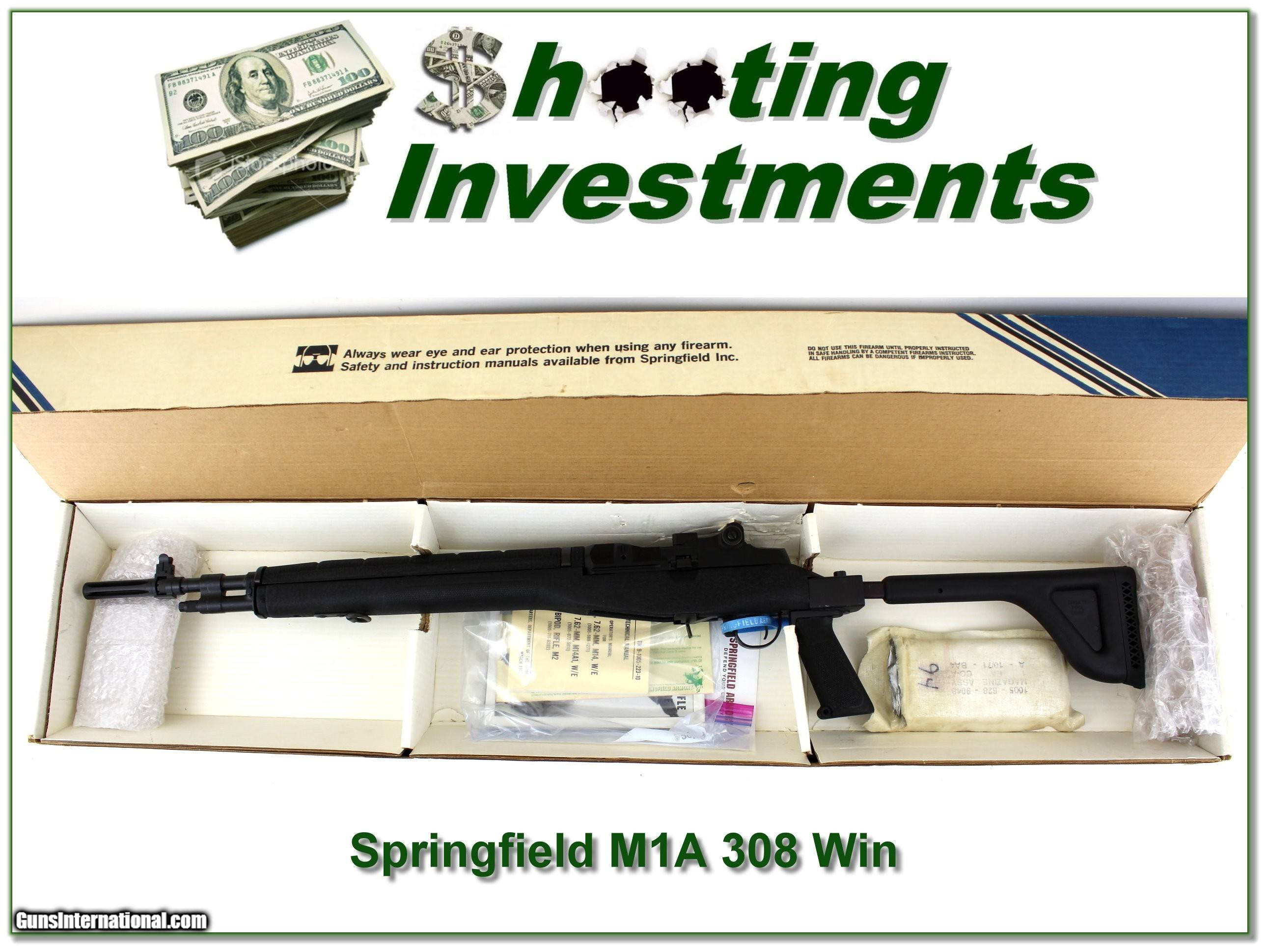 Description: Collectors this is a rare Springfield Armory M1A-A1 Bush Rifle with an 18-inch barrel and rare Choate folding stock. It is unfired in its original box with all factory papers and its GI magazine. You will look hard to find another one. I am selling this one on consignment and as such lay-a-way can’t be used. It does of course have the standard 3-day inspection. Shipping and insurance is $59. Please email me with any questions or larger pictures. (Consign your quality firearms with Shooting Investments for only 12%! Let me know if you have any you would like to sell!) 23-0504 Payment:Payment is by Money Order, Cashier’s Check or Personal Check. I can now also accept Credit Cards (MasterCard, Visa, Discover & American Express) with a 3% convenience fee. Shipping: The shipping charge will be listed in each description. It is $49 for most firearms. Some heavy guns or those insured for over $2000 will be higher. Shipments to Alaska and Hawaii are higher because air shipment is required. Most firearms are shipped on Tuesday and Thursday and usually in 5 days of receipt of payment. We package all shipments carefully and insure them. Optics are shipped Priority Mail and most other non-firearm shipments are shipped First Class. Returns: Our return policy is simple. If for any reason you are not pleased with your purchase, you may return your item for a full refund of purchase price. Ammunition cannot be returned. It is important to us that you are happy. Guns cannot be fired or dissembled before returning them and they must be returned in the same condition as received. Notification of a return must occur within 3 days of receipt at your dealer. Shipping, convenience and dealer fees are not refundable and are the responsibility of the buyer. Lay-a-way: If needed, we offer a 60 day lay-a-way option on most firearms. It is 1/3 now, 1/3 in 30 days and 1/3 in 60 days. Lay-a-way firearm sales are final and cannot be returned. If a lay-a-way is not completed the first payment cannot be refunded. Consigning your firearms with Shooting Investments: We will help you get top dollar for your firearms. While most local guns shops charge 20% or more, our fee is only 12% with a minimum of $75. At your local gun shop it might take months to sell. Selling on-line provides instant access to thousands of interested buyers. You won’t find any other on-line dealer willing to sell your firearms for only 12% or listing every gun on 3 separate s. Selling through an House typically costs the seller 15% and the buyer an addition 15% (so 30%) and you have to wait several months to sell and longer to receive funds. If properly priced, we will sell your firearms within a few weeks. Send us an email or give us a call and we’ll explain how easy it is for you to get top dollar. Trading: Trading for us is really just buying your gun to re-sell. If you have a gun you want to trade, please email a picture and we will let you know what we can give for it. You will always get more if we sell it for you on consignment. SOLD