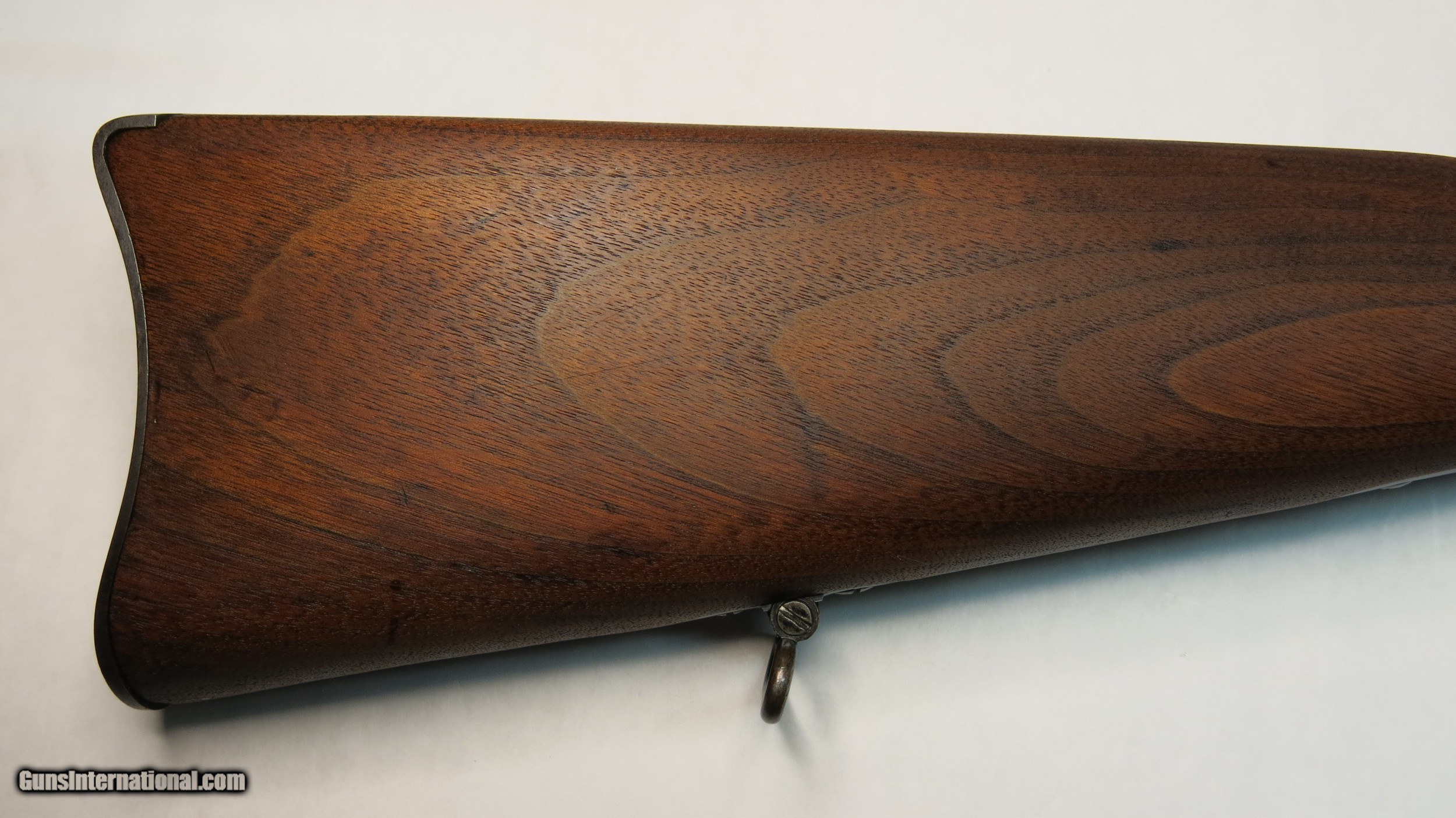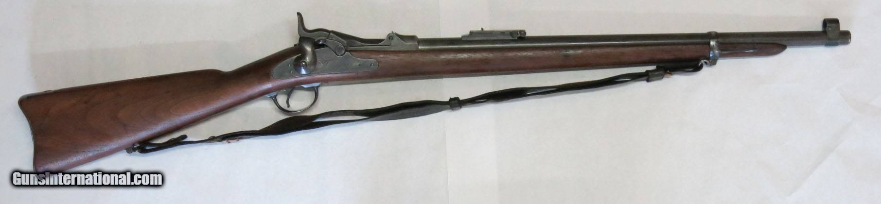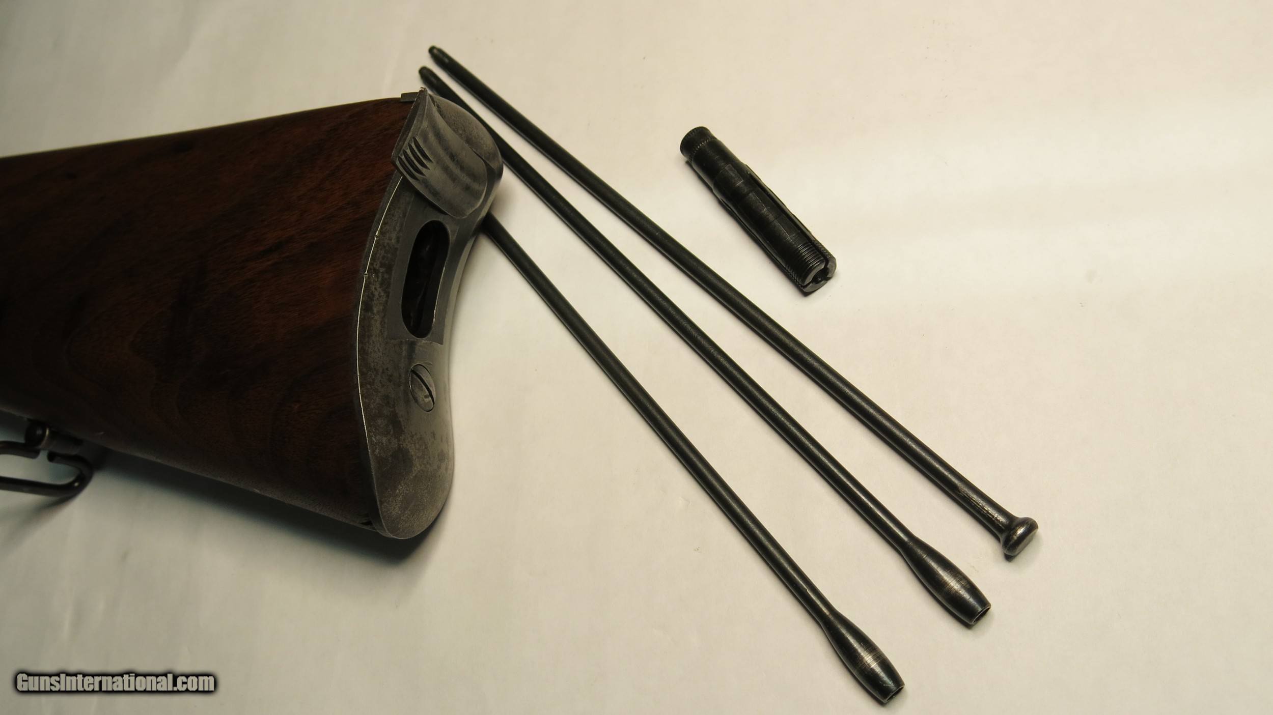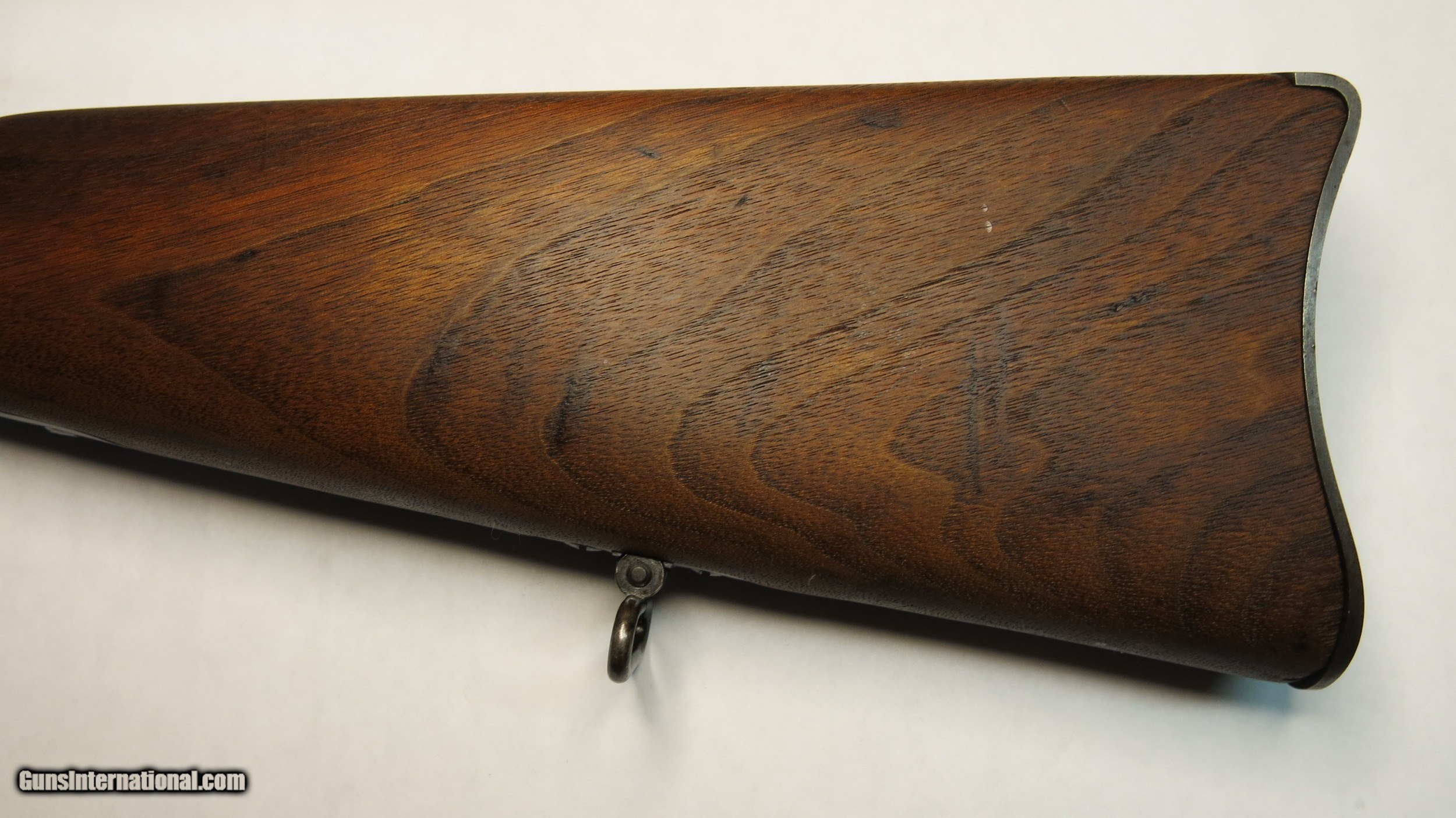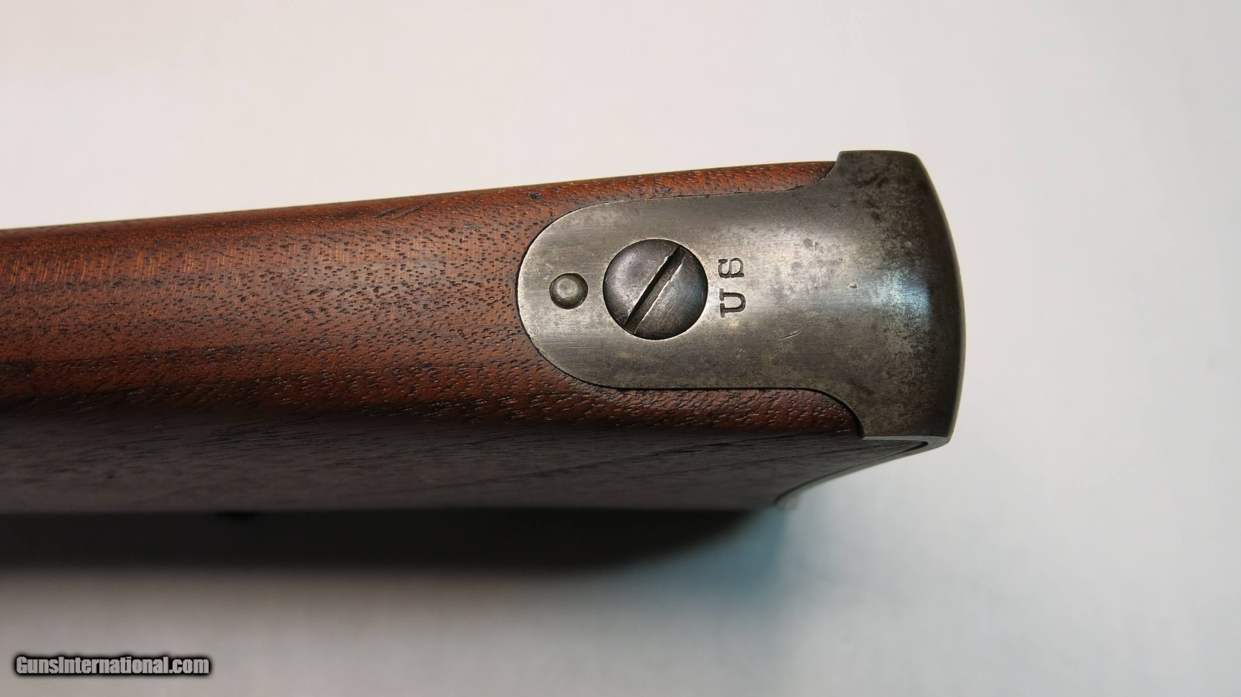 Description: Springfield Armory Model 1886 Experimental Long Carbine, Caliber .45-70, 24 inch Barrel Serial number 340757 These experimental carbines were never officially given a model number, although the unofficial designation of Model 1886 was given by today’s collectors and authors because of the year they were made. It is the second attempt at developing an arm that could be used universally by infantry, artillery and cavalry and use .45-70 rifle ammunition. Some sources state that they were meant to use the .45-70-405 and others say the .45-70-500. The first attempt at a universal arm was in 1882 with a 28” barreled short rifle using the .45-70-405. Approval for the manufacture of the M1886 carbine was given by the Board on Cavalry Equipment on June 14, 1885. There were 1,013 of these carbines made in a two week period in April of 1886 for trial purposes. The receivers used were of the wide 1878 style and have serial numbers between 330,000 and 354,000. A few more were made in the fiscal years of 1887 (one) and 1888 (two). There were 315 issued for use on August 13 of 1886 and the remainder on August 16 and 17 by Order for Supply #1202. They were sent to Forts Lincoln and Cheyenne as well to arsenals at Fort Leavenworth, San Antonio, Vancouver Barracks and Benicia. They were eventually pulled from service in 1888 and returned to Springfield Armory where they were refurbished. In the 1890’s they were distributed to various guard units throughout the U.S. During their lengthy service many parts were replaced, repaired, refinished or salvaged for parts. The survivability of and as issued original piece is very low. The 24” barrels were specifically made for this model. It was previously thought that they were shortened rifle barrels but recent research has proven this theory wrong. They are thicker than rifle barrels at any comparative point. The thoughts about this are that they were intended to use the rifle round instead of the carbine round. The extra weight would help with control of the added recoil. They were not thinned forward because they were not intended to be used with a bayonet. The crowns are very distinctive in that they show a very pronounced ring at the outside edge. The crowns are believed to have been cut with the standard rifle and carbine crowning tool that was designed for a smaller diameter muzzle. The left rear of the barrels are marked with the standard viewing and proof marks of V, P, eagle head and P. The rifling is of three equally spaced lands and grooves with a 1 in 22” twist. The bore of this carbine is in very good condition with a few scattered pits. The crown shows moderate cleaning rod wear and some frost for the first 1/4”. The rear sight is a specially made 1884 Buffington with the letters of XC (experimental carbine) stamped on the upper right corner of the leaf. The sight was positioned the same distance from the receiver as the rifle. The graduations are different than the standard Buffington rifle and carbine sights. Due to the different barrel contours between this carbine and the standard carbine and rifle, the sights are not interchangeable. The front sight is the standard carbine sight with the replaceable pinned in blade. These carbines front sight blade does appear to be a replacement. Front sight hoods were available and issued by request. The hood on this carbine is proper and authentic. The breach blocks have the low arch and are marked with U.S. over MODEL over 1873. This breach block fits the description of the ones made between December of 1878 and February 1883. The lock plates are marked with the Eagle motif and then U.S. over SPRINGFIELD. The locks have a three notch tumbler. The hammer has the stamped knurl in an oval on the thumb spur and the nose has a flat face without the angled lower lip. The lock plate fits the description of plates used between serial numbers 80,000 and 380,000. The trigger bows are of the carbine design without provisions for a sling swivel. The triggers are the M1883 corrugated style. The stocks for these carbines were specifically produced for this carbine and are 40” long. They may or may not have the SWP / 1886 inspectors’ cartouche and P firing proof rear of the trigger plate. The inspector’s cartouche and firing proof P are not visible on this carbine. They do not have a nose cap. They have a short wrist and a long comb. The barrel band and sling swivel are a modified M1873 marked with a small letter U. The front sling swivel is curved to conform to the curvature of the stock so the carbine can be easily inserted and withdrawn from the saddle boot. The rear sling swivel is attached to the underside of the stocks butt with screws and is centered 4” forward of the butt plate. These carbines also have the standard carbine sling ring and bar on the left side. The stocks butt has a storage compartment and butt plate with a swiveled closure intended for three cleaning rod sections and 1882 ruptured shell extractor. The butt plates can be found with the older M1877 keyhole design or the later M1880 oval design. It is believed the keyhole design is most proper because the M1879 combination tool was not intended to be part of the butt kit. This butt plate has the M1880 oval hole and is marked US on the upper tang. This carbines stock has been sanded and this is most evident around the butt plate and lock plate. Under the butt plate, there are remnants of a coat of varnish that has been removed at some time. A chip of wood is missing rear of the thumb latch recess at the right side of the receiver tang. An insignificant crack is visible at the back top of the lock recess and extends up into the receiver inletting. The three cleaning rod sections are 9.25” long with a body diameter of 0.189”. The end sections head is 0.375” in diameter and the other two are 0.311” in diameter. The sections are threaded with the Whitworth Standard 26 threads per inch. The sling is authentic and pr