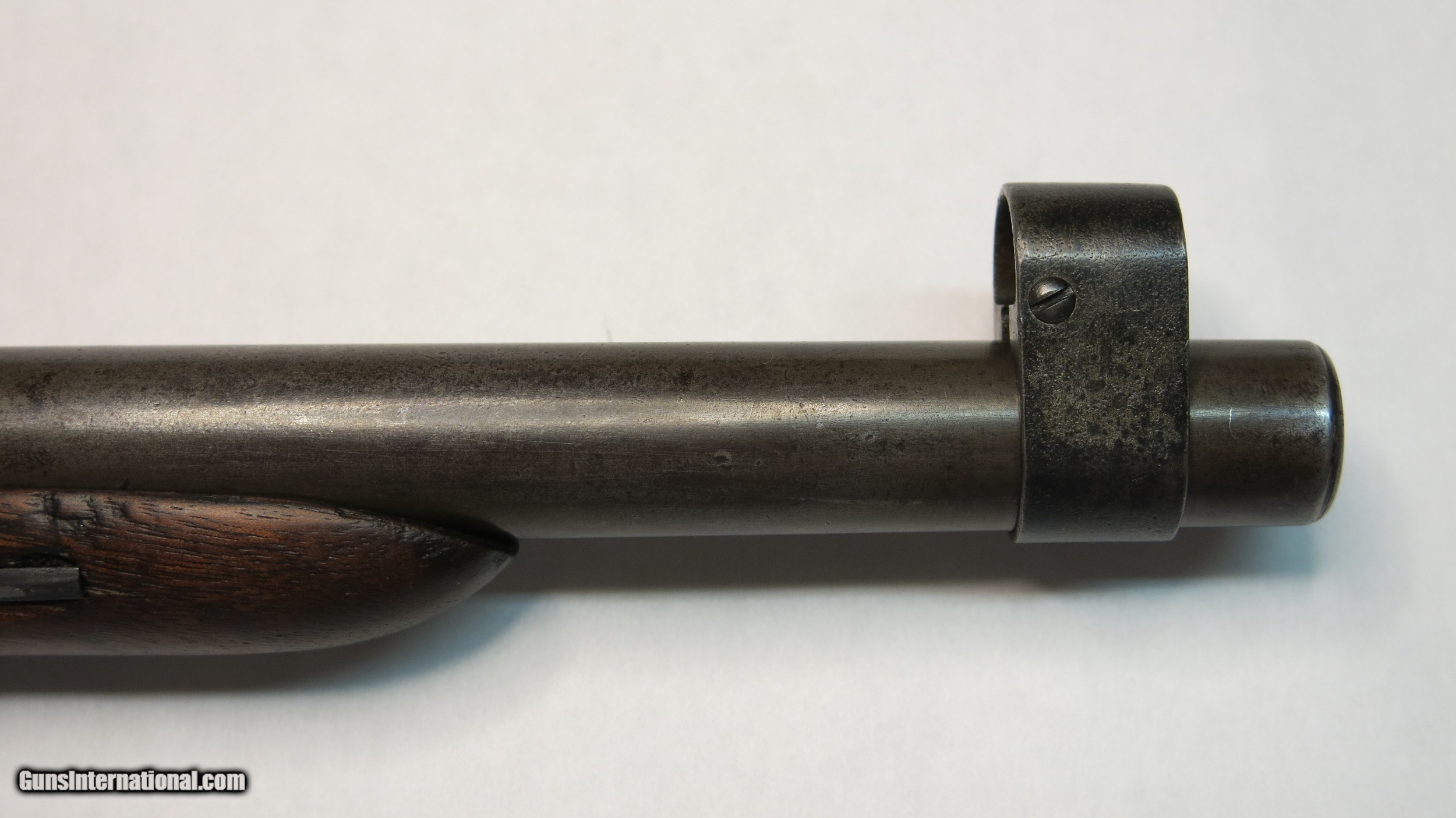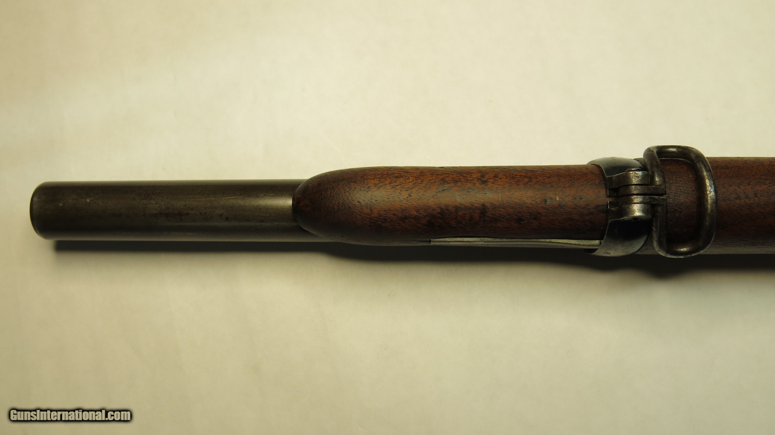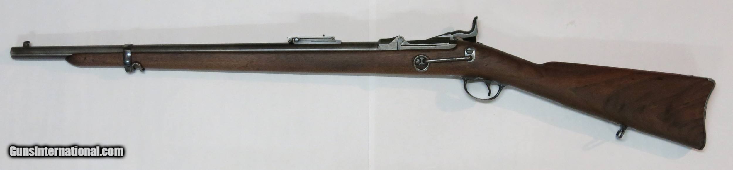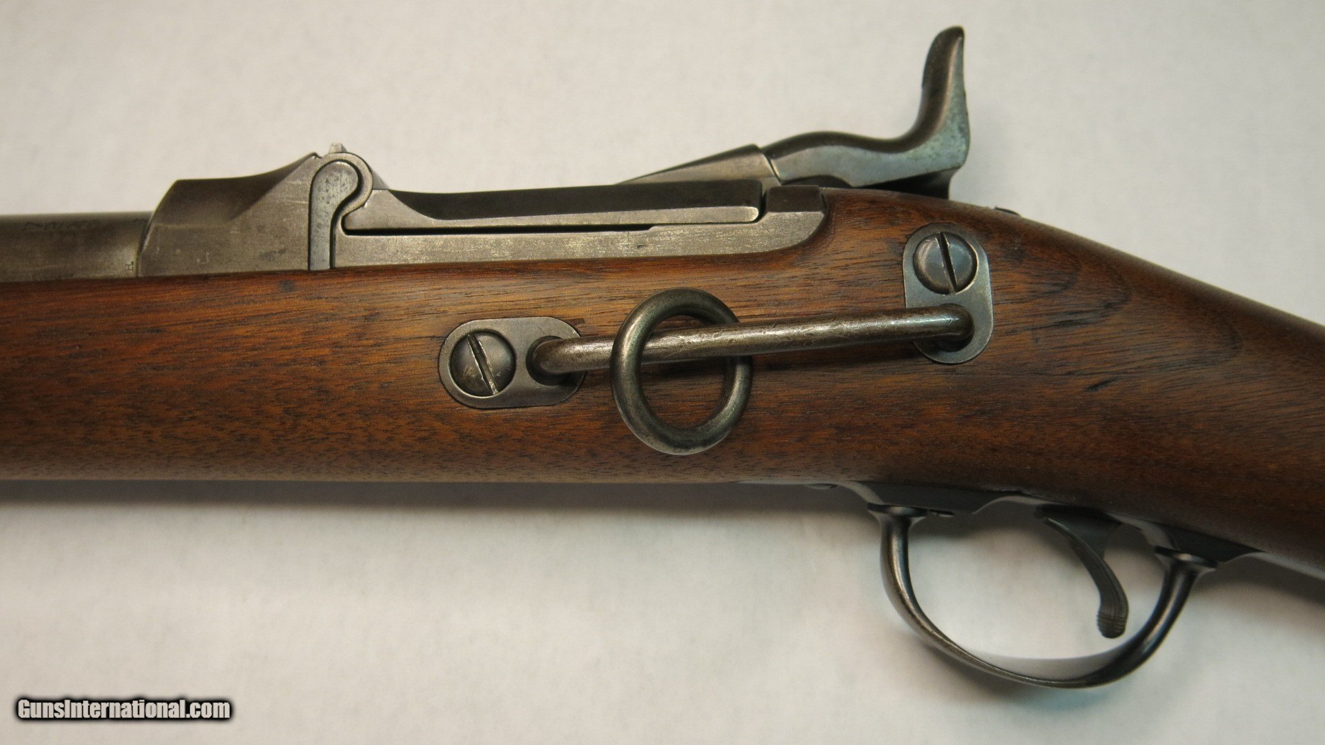 Description: Springfield Armory Model 1886 Experimental Long Carbine, Caliber .45-70, 24 inch Barrel Serial number 340757 These experimental carbines were never officially given a model number, although the unofficial designation of Model 1886 was given by today’s collectors and authors because of the year they were made. It is the second attempt at developing an arm that could be used universally by infantry, artillery and cavalry and use .45-70 rifle ammunition. Some sources state that they were meant to use the .45-70-405 and others say the .45-70-500. The first attempt at a universal arm was in 1882 with a 28” barreled short rifle using the .45-70-405. Approval for the manufacture of the M1886 carbine was given by the Board on Cavalry Equipment on June 14, 1885. There were 1,013 of these carbines made in a two week period in April of 1886 for trial purposes. The receivers used were of the wide 1878 style and have serial numbers between 330,000 and 354,000. A few more were made in the fiscal years of 1887 (one) and 1888 (two). There were 315 issued for use on August 13 of 1886 and the remainder on August 16 and 17 by Order for Supply #1202. They were sent to Forts Lincoln and Cheyenne as well to arsenals at Fort Leavenworth, San Antonio, Vancouver Barracks and Benicia. They were eventually pulled from service in 1888 and returned to Springfield Armory where they were refurbished. In the 1890’s they were distributed to various guard units throughout the U.S. During their lengthy service many parts were replaced, repaired, refinished or salvaged for parts. The survivability of and as issued original piece is very low. The 24” barrels were specifically made for this model. It was previously thought that they were shortened rifle barrels but recent research has proven this theory wrong. They are thicker than rifle barrels at any comparative point. The thoughts about this are that they were intended to use the rifle round instead of the carbine round. The extra weight would help with control of the added recoil. They were not thinned forward because they were not intended to be used with a bayonet. The crowns are very distinctive in that they show a very pronounced ring at the outside edge. The crowns are believed to have been cut with the standard rifle and carbine crowning tool that was designed for a smaller diameter muzzle. The left rear of the barrels are marked with the standard viewing and proof marks of V, P, eagle head and P. The rifling is of three equally spaced lands and grooves with a 1 in 22” twist. The bore of this carbine is in very good condition with a few scattered pits. The crown shows moderate cleaning rod wear and some frost for the first 1/4”. The rear sight is a specially made 1884 Buffington with the letters of XC (experimental carbine) stamped on the upper right corner of the leaf. The sight was positioned the same distance from the receiver as the rifle. The graduations are different than the standard Buffington rifle and carbine sights. Due to the different barrel contours between this carbine and the standard carbine and rifle, the sights are not interchangeable. The front sight is the standard carbine sight with the replaceable pinned in blade. These carbines front sight blade does appear to be a replacement. Front sight hoods were available and issued by request. The hood on this carbine is proper and authentic. The breach blocks have the low arch and are marked with U.S. over MODEL over 1873. This breach block fits the description of the ones made between December of 1878 and February 1883. The lock plates are marked with the Eagle motif and then U.S. over SPRINGFIELD. The locks have a three notch tumbler. The hammer has the stamped knurl in an oval on the thumb spur and the nose has a flat face without the angled lower lip. The lock plate fits the description of plates used between serial numbers 80,000 and 380,000. The trigger bows are of the carbine design without provisions for a sling swivel. The triggers are the M1883 corrugated style. The stocks for these carbines were specifically produced for this carbine and are 40” long. They may or may not have the SWP / 1886 inspectors’ cartouche and P firing proof rear of the trigger plate. The inspector’s cartouche and firing proof P are not visible on this carbine. They do not have a nose cap. They have a short wrist and a long comb. The barrel band and sling swivel are a modified M1873 marked with a small letter U. The front sling swivel is curved to conform to the curvature of the stock so the carbine can be easily inserted and withdrawn from the saddle boot. The rear sling swivel is attached to the underside of the stocks butt with screws and is centered 4” forward of the butt plate. These carbines also have the standard carbine sling ring and bar on the left side. The stocks butt has a storage compartment and butt plate with a swiveled closure intended for three cleaning rod sections and 1882 ruptured shell extractor. The butt plates can be found with the older M1877 keyhole design or the later M1880 oval design. It is believed the keyhole design is most proper because the M1879 combination tool was not intended to be part of the butt kit. This butt plate has the M1880 oval hole and is marked US on the upper tang. This carbines stock has been sanded and this is most evident around the butt plate and lock plate. Under the butt plate, there are remnants of a coat of varnish that has been removed at some time. A chip of wood is missing rear of the thumb latch recess at the right side of the receiver tang. An insignificant crack is visible at the back top of the lock recess and extends up into the receiver inletting. The three cleaning rod sections are 9.25” long with a body diameter of 0.189”. The end sections head is 0.375” in diameter and the other two are 0.311” in diameter. The sections are threaded with the Whitworth Standard 26 threads per inch. The sling is authentic and pr