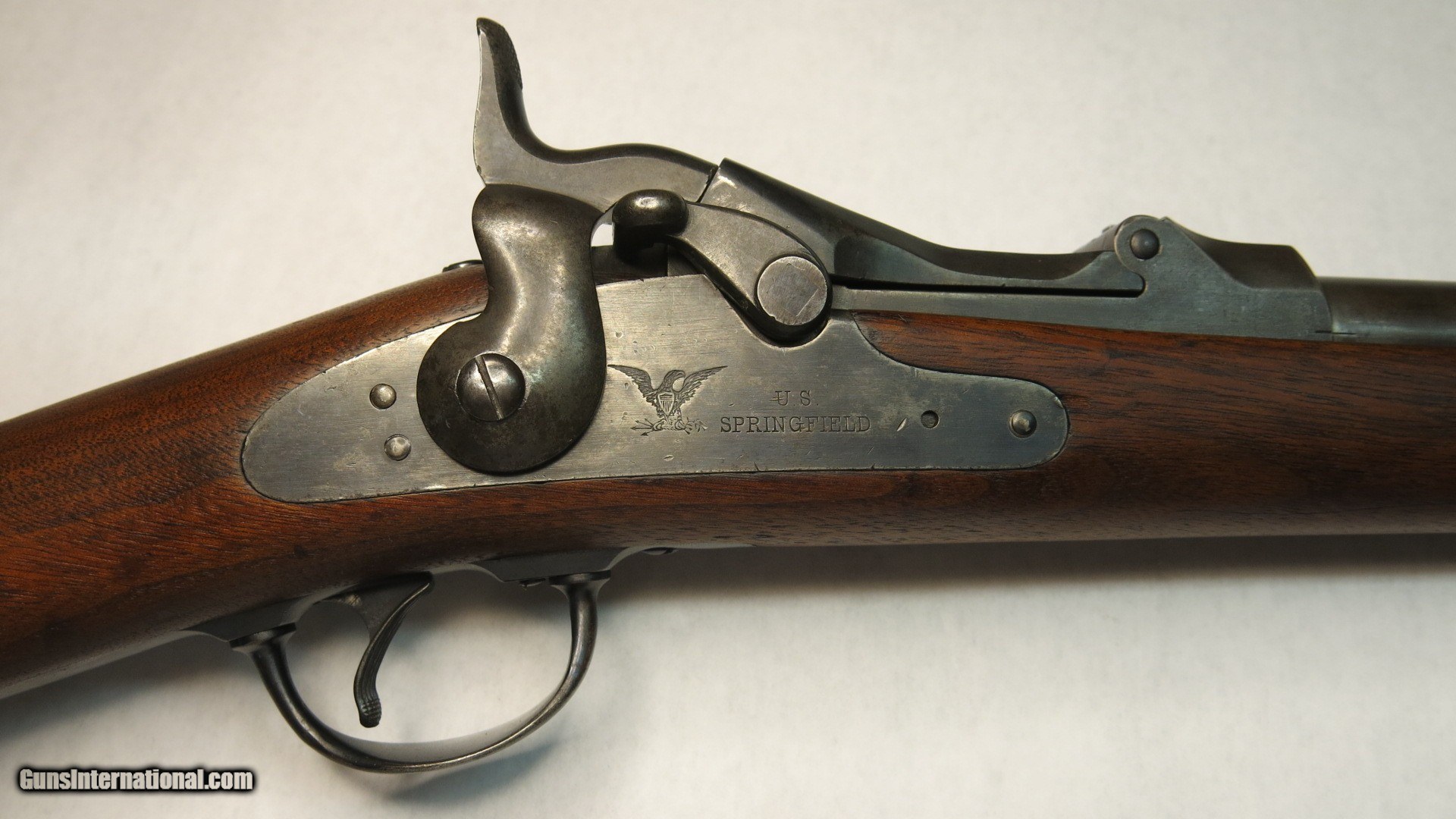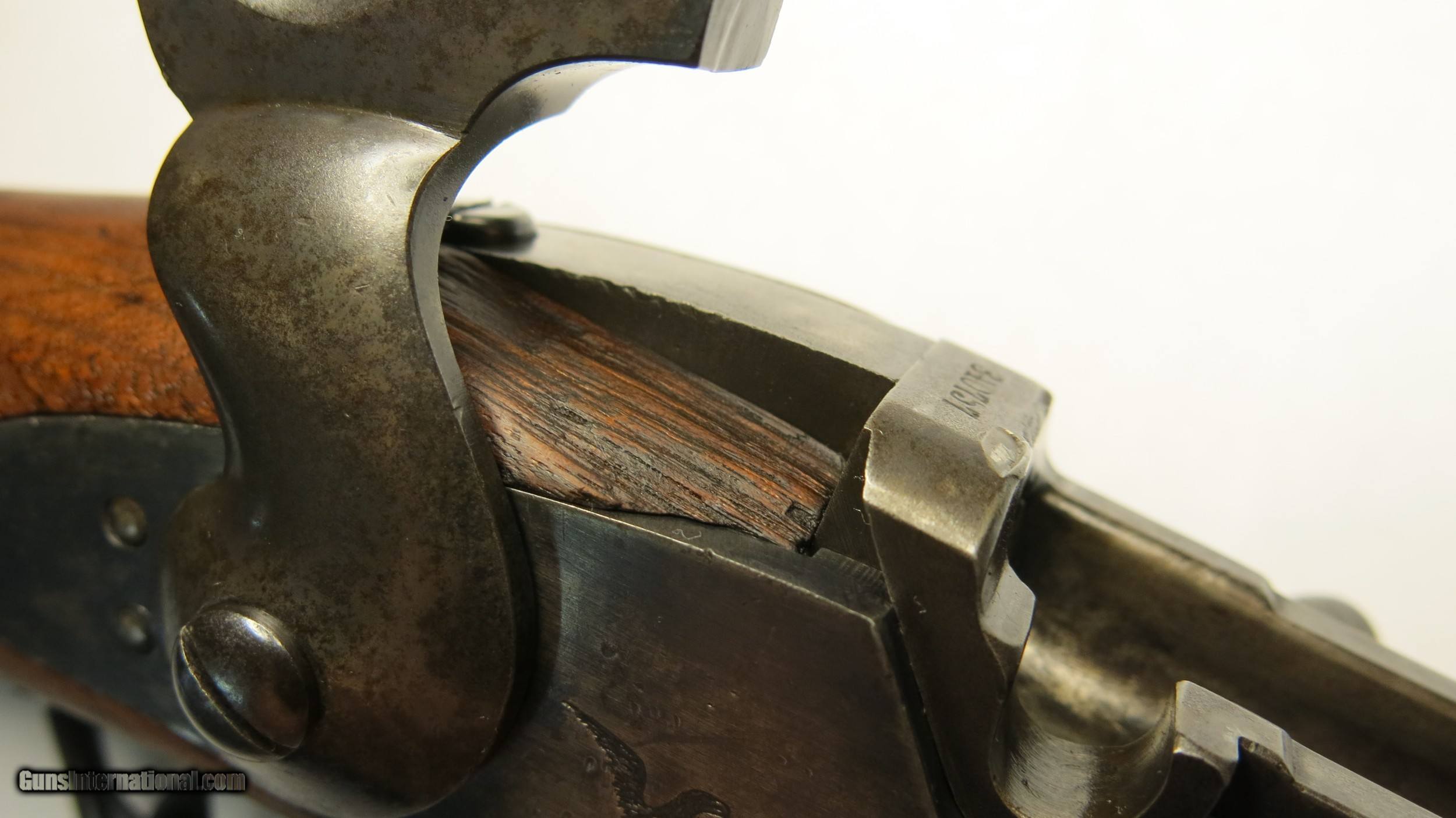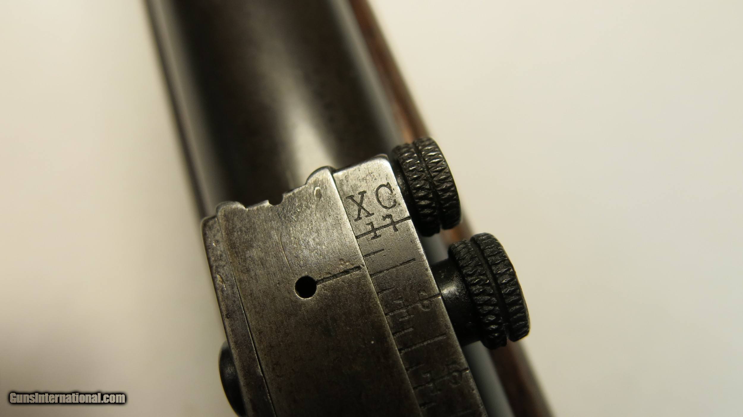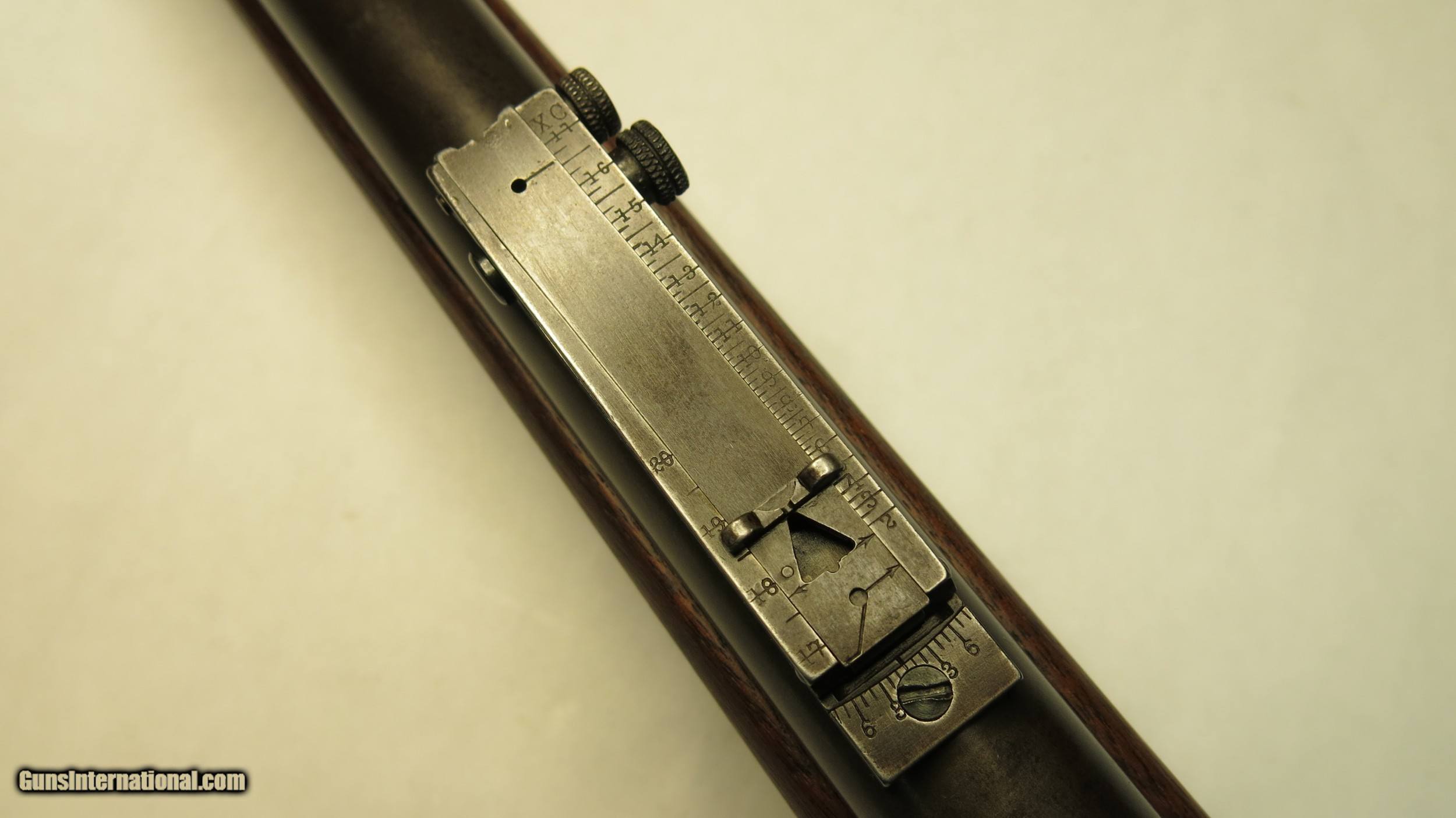 Description: Springfield Armory Model 1886 Experimental Long Carbine, Caliber .45-70, 24 inch Barrel Serial number 340757 These experimental carbines were never officially given a model number, although the unofficial designation of Model 1886 was given by today’s collectors and authors because of the year they were made. It is the second attempt at developing an arm that could be used universally by infantry, artillery and cavalry and use .45-70 rifle ammunition. Some sources state that they were meant to use the .45-70-405 and others say the .45-70-500. The first attempt at a universal arm was in 1882 with a 28” barreled short rifle using the .45-70-405. Approval for the manufacture of the M1886 carbine was given by the Board on Cavalry Equipment on June 14, 1885. There were 1,013 of these carbines made in a two week period in April of 1886 for trial purposes. The receivers used were of the wide 1878 style and have serial numbers between 330,000 and 354,000. A few more were made in the fiscal years of 1887 (one) and 1888 (two). There were 315 issued for use on August 13 of 1886 and the remainder on August 16 and 17 by Order for Supply #1202. They were sent to Forts Lincoln and Cheyenne as well to arsenals at Fort Leavenworth, San Antonio, Vancouver Barracks and Benicia. They were eventually pulled from service in 1888 and returned to Springfield Armory where they were refurbished. In the 1890’s they were distributed to various guard units throughout the U.S. During their lengthy service many parts were replaced, repaired, refinished or salvaged for parts. The survivability of and as issued original piece is very low. The 24” barrels were specifically made for this model. It was previously thought that they were shortened rifle barrels but recent research has proven this theory wrong. They are thicker than rifle barrels at any comparative point. The thoughts about this are that they were intended to use the rifle round instead of the carbine round. The extra weight would help with control of the added recoil. They were not thinned forward because they were not intended to be used with a bayonet. The crowns are very distinctive in that they show a very pronounced ring at the outside edge. The crowns are believed to have been cut with the standard rifle and carbine crowning tool that was designed for a smaller diameter muzzle. The left rear of the barrels are marked with the standard viewing and proof marks of V, P, eagle head and P. The rifling is of three equally spaced lands and grooves with a 1 in 22” twist. The bore of this carbine is in very good condition with a few scattered pits. The crown shows moderate cleaning rod wear and some frost for the first 1/4”. The rear sight is a specially made 1884 Buffington with the letters of XC (experimental carbine) stamped on the upper right corner of the leaf. The sight was positioned the same distance from the receiver as the rifle. The graduations are different than the standard Buffington rifle and carbine sights. Due to the different barrel contours between this carbine and the standard carbine and rifle, the sights are not interchangeable. The front sight is the standard carbine sight with the replaceable pinned in blade. These carbines front sight blade does appear to be a replacement. Front sight hoods were available and issued by request. The hood on this carbine is proper and authentic. The breach blocks have the low arch and are marked with U.S. over MODEL over 1873. This breach block fits the description of the ones made between December of 1878 and February 1883. The lock plates are marked with the Eagle motif and then U.S. over SPRINGFIELD. The locks have a three notch tumbler. The hammer has the stamped knurl in an oval on the thumb spur and the nose has a flat face without the angled lower lip. The lock plate fits the description of plates used between serial numbers 80,000 and 380,000. The trigger bows are of the carbine design without provisions for a sling swivel. The triggers are the M1883 corrugated style. The stocks for these carbines were specifically produced for this carbine and are 40” long. They may or may not have the SWP / 1886 inspectors’ cartouche and P firing proof rear of the trigger plate. The inspector’s cartouche and firing proof P are not visible on this carbine. They do not have a nose cap. They have a short wrist and a long comb. The barrel band and sling swivel are a modified M1873 marked with a small letter U. The front sling swivel is curved to conform to the curvature of the stock so the carbine can be easily inserted and withdrawn from the saddle boot. The rear sling swivel is attached to the underside of the stocks butt with screws and is centered 4” forward of the butt plate. These carbines also have the standard carbine sling ring and bar on the left side. The stocks butt has a storage compartment and butt plate with a swiveled closure intended for three cleaning rod sections and 1882 ruptured shell extractor. The butt plates can be found with the older M1877 keyhole design or the later M1880 oval design. It is believed the keyhole design is most proper because the M1879 combination tool was not intended to be part of the butt kit. This butt plate has the M1880 oval hole and is marked US on the upper tang. This carbines stock has been sanded and this is most evident around the butt plate and lock plate. Under the butt plate, there are remnants of a coat of varnish that has been removed at some time. A chip of wood is missing rear of the thumb latch recess at the right side of the receiver tang. An insignificant crack is visible at the back top of the lock recess and extends up into the receiver inletting. The three cleaning rod sections are 9.25” long with a body diameter of 0.189”. The end sections head is 0.375” in diameter and the other two are 0.311” in diameter. The sections are threaded with the Whitworth Standard 26 threads per inch. The sling is authentic and pr