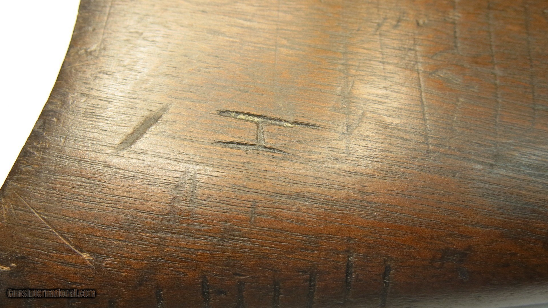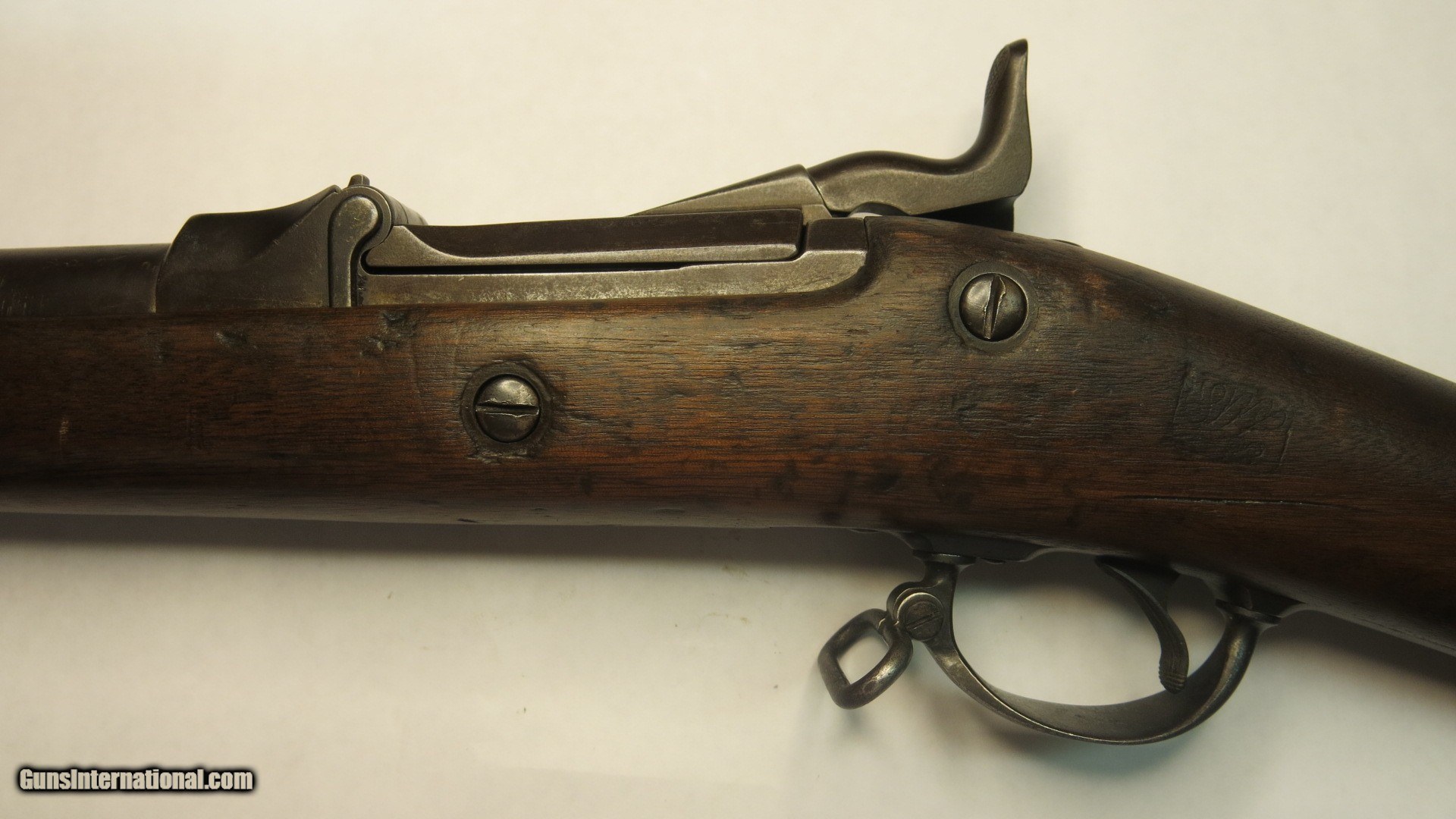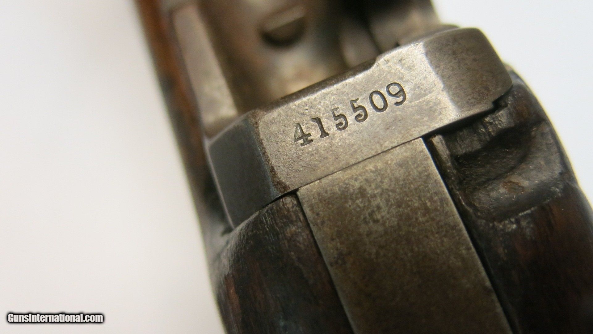 Description: Springfield Armory Model 1888 Positive Cam Rifle Serial Number 415509 .45/70/500 Springfield Armory received field reports of instances when trapdoor Springfield breech blocks stuck shut or blew open when the rifle discharged while loading. The first examination of the problems was a result of Springfield Armory Post Order No. 17, dated April 19, 1883. Lieutenant Colonel A. R. Buffington set up a board of three officers and the Master Armorer to investigate. No recommendations were made at that time. On November 5, 1886, another board with Colonel Buffington was set up and the result was “Board did not feel justified in recommending such changes until the insecurity or other possible defects of the present mechanism become more evident”. The results of Colonel Buffington’s recommendation resulted in no locking cam systems being made at that time. The issue of the breech block sticking in the closed position was attributed to the expansion of the breech parts when heated up during rapid fire. The locking cam breech was the result of the research into the problem. The theory was that by lifting the thumb piece the stuck cam would be moved left off of its seat freeing up the breech block so it could be opened. This feature also made the lock up of the breech stronger and capable of higher pressures. The system was used in the experimental trapdoors during the development of the smokeless .30 caliber round (.30/40) that would be used in the Krag Model 1892. The issue of the rifle discharging while loading was attributed to either a firing pin stuck in the forward position or a broken firing pin with the tip stuck in the breach face. There was experimentation with different alloys to make the firing pins more durable and less prone to corrosion. An alloy of aluminum, copper and tin proved to be more durable and was approved for use in December of 1886. Springfield referred to the alloy as aluminum bronze. These positive cam rifles were developed experimentally and about 100 were produced during the fiscal year of 1888. Most serial numbers are in the 415,000 range and are mostly sequential. Some knowledgeable sources think the serial numbers ranged from 415502 to 415615 consecutively with the exception of a few rejects during production. There are also a few known with close serial numbers that may be partially real, prototypes or proven fakes. This rifles receiver was produced between July and September of 1888. There are records stating that the rifles were sent to San Antonio Arsenal for testing. Some sources believe they were not tested while other sources believe they were and saw service in Texas, New Mexico and Arizona. These rifles are virtually identical to the Model 1884 except for the receiver, breech screw, breech block, firing pin and screw, and cam latch components. The shaft of the cam latch has coarse thread which fit a like female thread cut into the breech block cap. The receivers are recessed on the right rear inside to accept the breech block caps shoulders that are larger than on standard caps. When viewing the breech block from the rear, lifting the thumb latch will move the cam to the left, freeing it from its positive locking position, and lowering the thumb latch will move the cam to the right to its locked position. The firing pin retaining screw hole is on the right side of the breech block instead of the bottom. This rifles inspector’s cartouche of Samuel W. Porter, SWP over 1888, is in a box on the left wrist of the stock. The firing proof script P in a circle is rear of the trigger plate. The stock has multiple nicks, dents and scratches. There is an insignificant drying crack rear of the lock plate. There are ten notches cut into the lower right rear of the butt forward of the butt plate. Above the notches is what may be a carved letter H. About 1 1/2” forward of the butt plate on the left side are the lightly scratched initials of W.T.R. or W.T.P. There is a chip missing at the bottom of the butt plate as well as forward of the cam latch at the receiver. The forend from the rear band forward has been replaced. The joint is under the rear band. The rod channel was obstructed from this repair and may explain why there was no cleaning rod with the rifle. I opened up the rod channel and installed a proper rod. During the cleaning process it was evident that this repair was made a long time ago. There is a steel reinforcement detected with a magnet. The stock was cleaned with lemon oil and coated with Renaissance wax. The breech block of this rifle is marked U.S. over MODEL over 1888. The 100 rifles produced are the only ones that Springfield made having the 1888 date on the breech blocks. It does have a proper aluminum bronze firing pin. The pin is retained with a screw on the right side of the breech block behind the thumb piece of the cam latch. The firing pins retaining screw notch is cut on the bottom of the pin at an angle and is not perpendicular to the shaft because of the compound angle that the pin has as it passes through the breech block. The head of the pins retaining screw was broken off. I removed the screw remnant and made a new screw from an old trapdoor firing pin. The diameter of the pin is the same as the head of the screw and the steel can be re-hardened. The barrel proof and inspection marks are on the left rear of the barrel. The V and P are 0.130” high. From the top of the V to the bottom of the eagle head is 0.560”. The head space is very generous at 0.082”. The bore has significant pitting mostly in the forward 10” to 12”. The barrel / receiver reference marks are in perfect alignment. The lock plate is the fourth variation and was known to be used after about serial number 490,000. This places it outside the accepted serial number range but is believed to be original to the rifle. The eagles shield is 0.190” high. The eagle is 0.440” high with a wing span of 0.810”. The word SPRINGFIELD is 1.0” long 