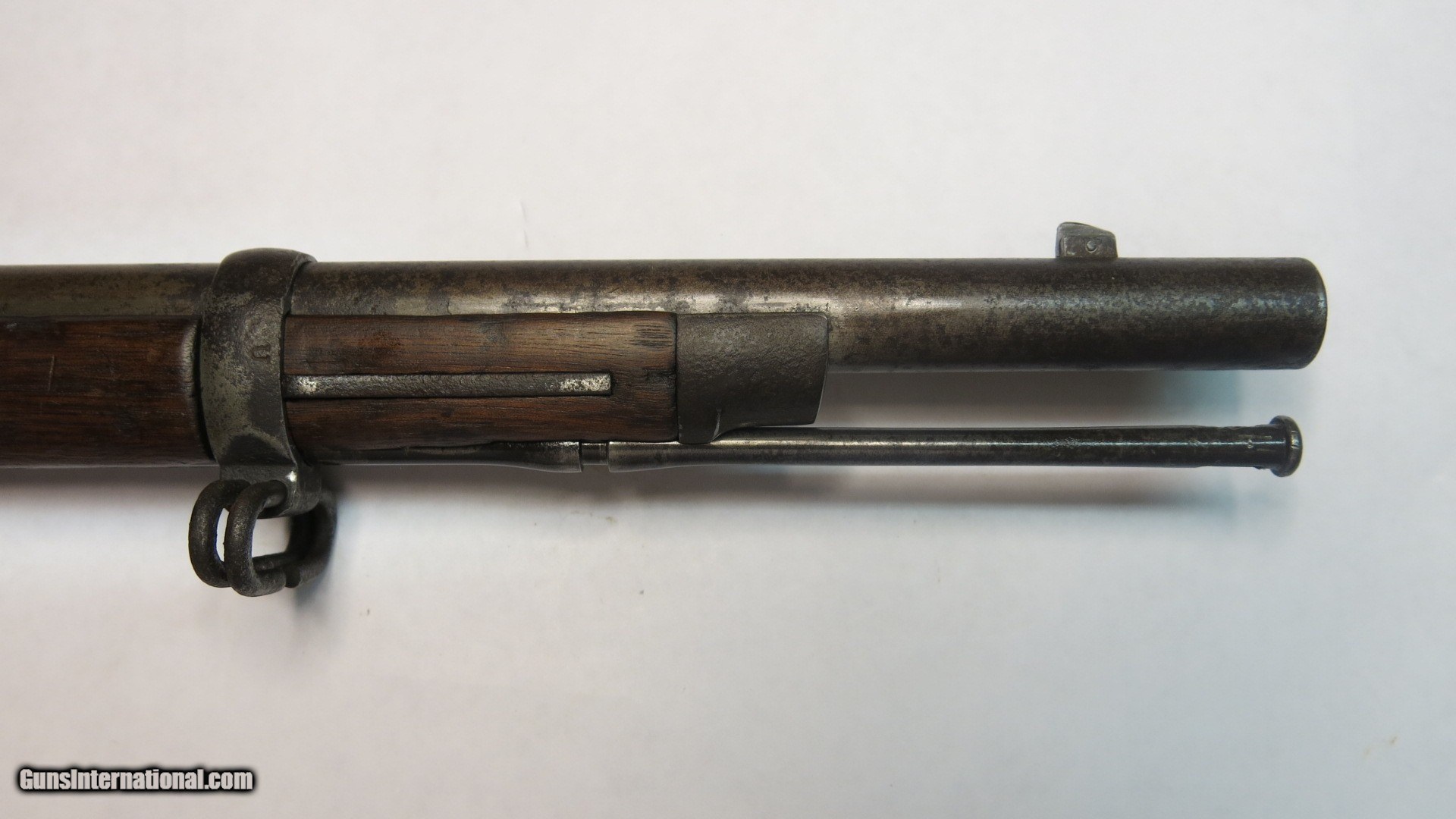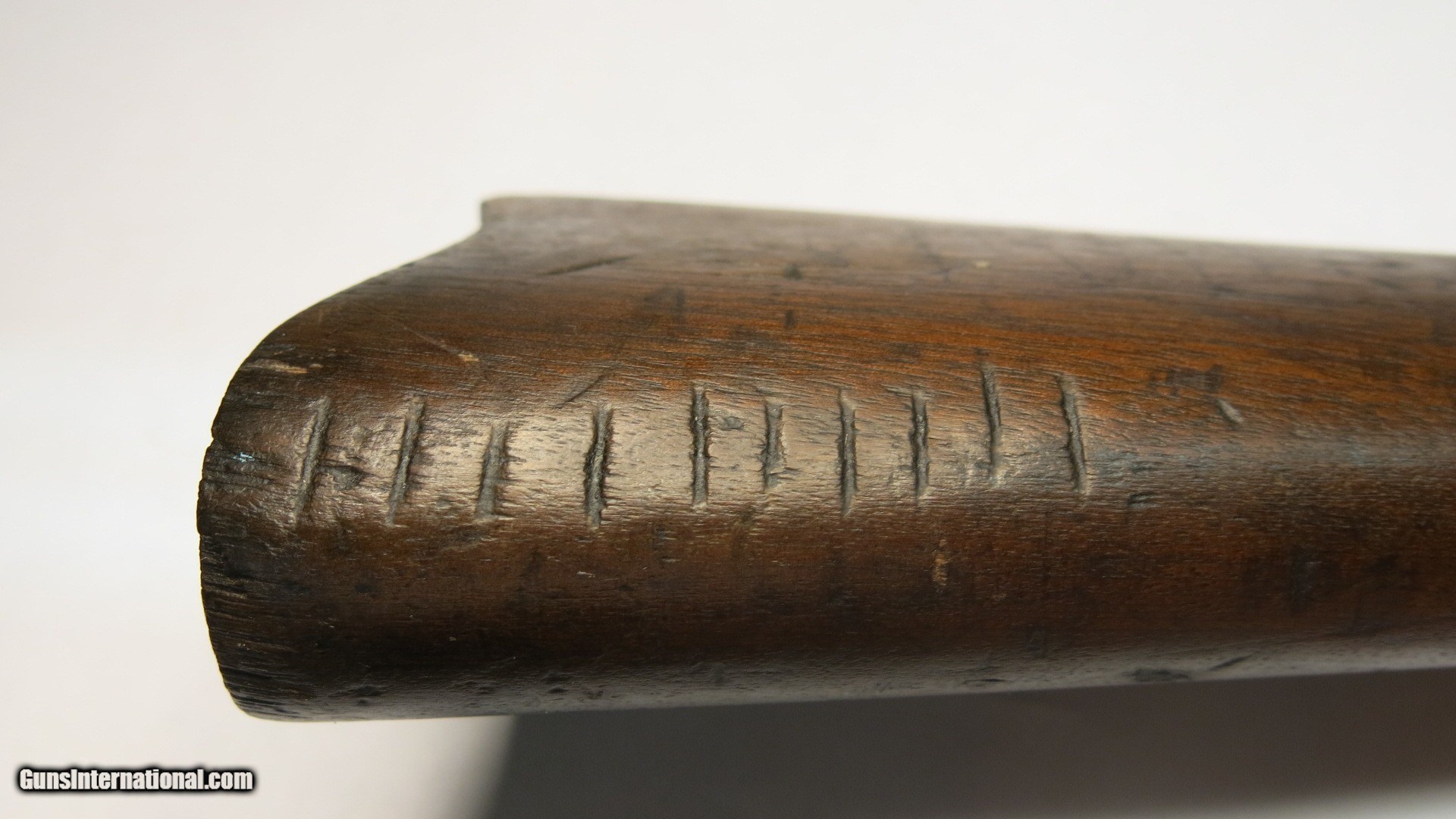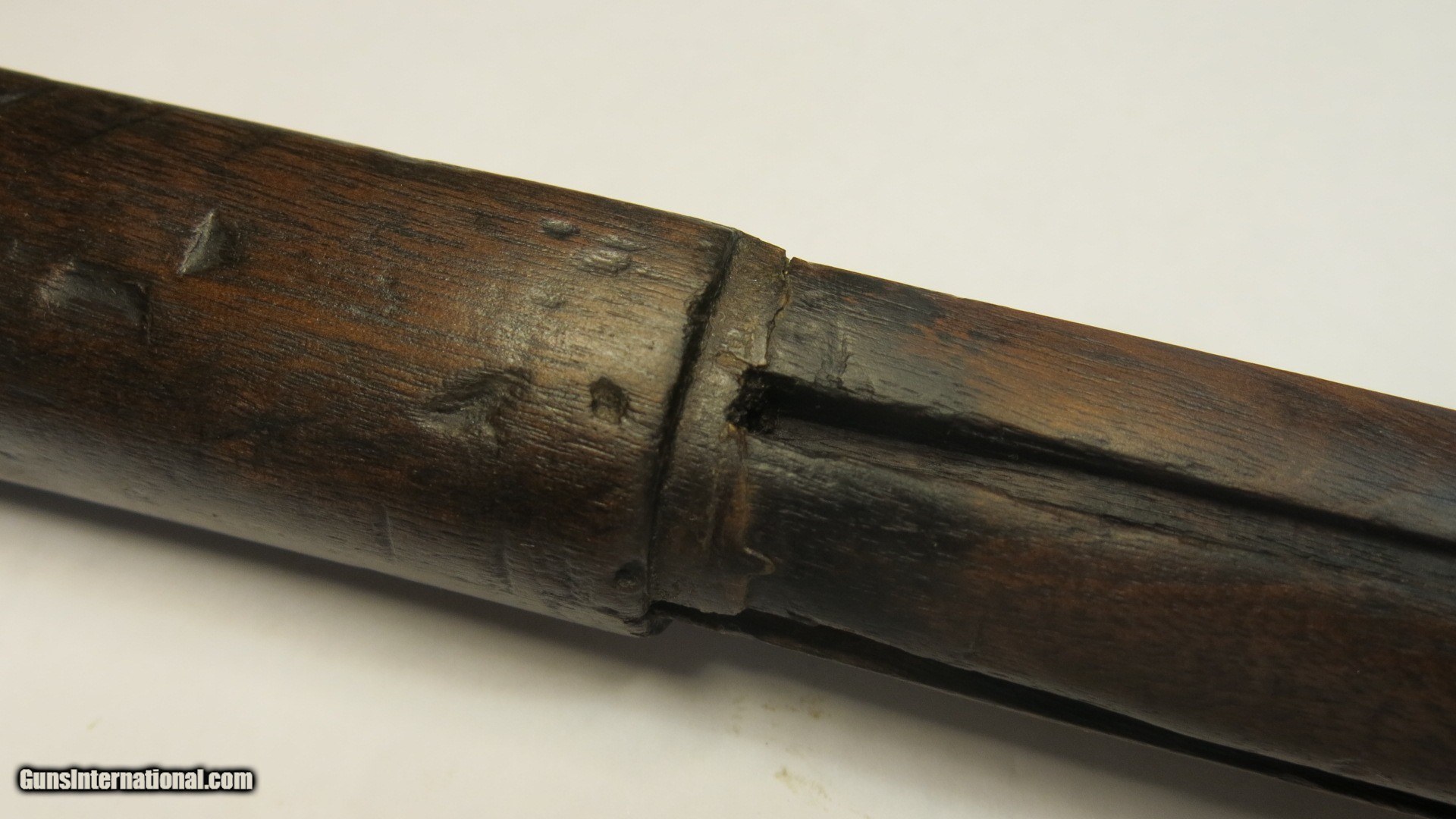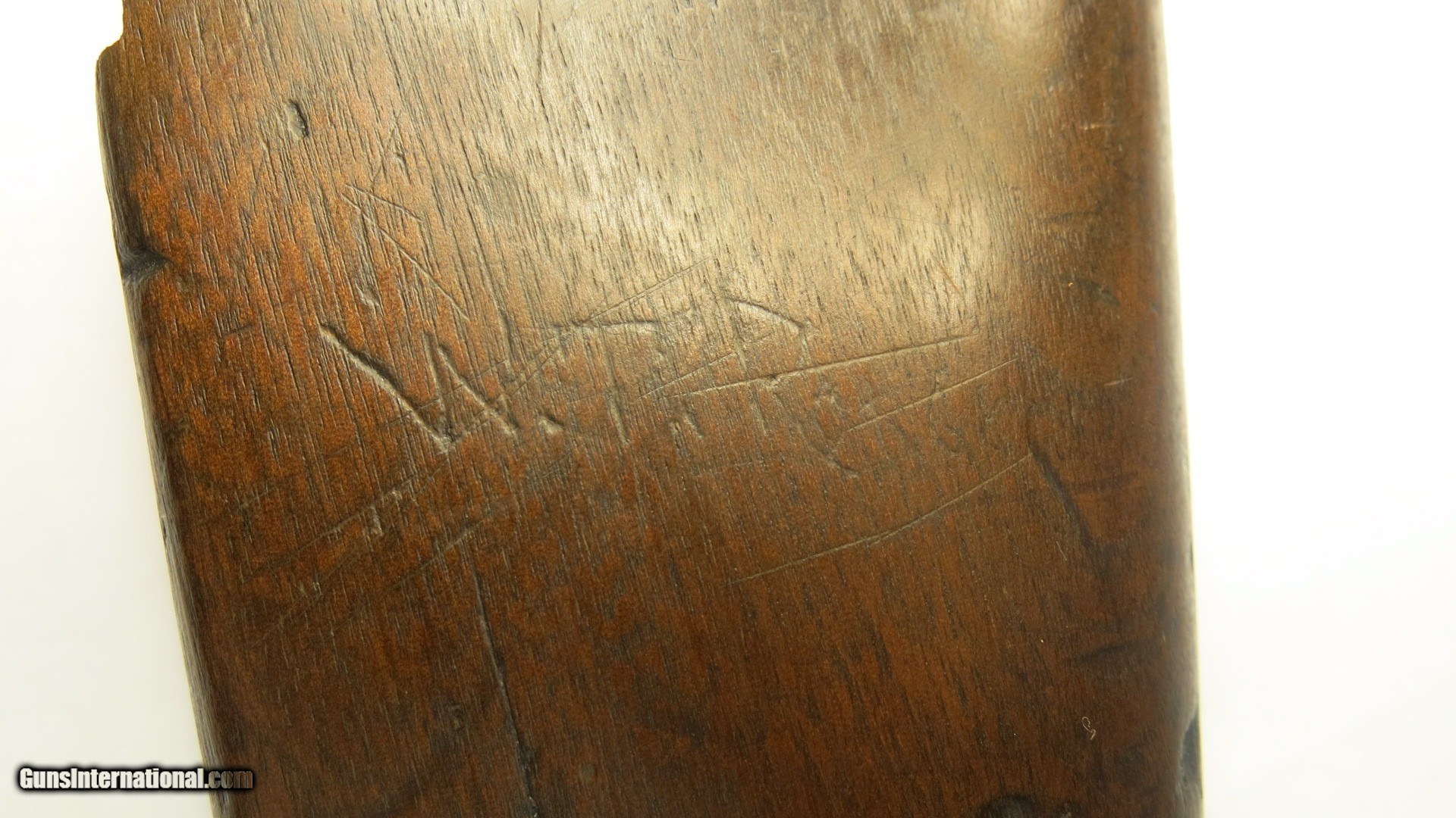Description: Springfield Armory Model 1888 Positive Cam Rifle Serial Number 415509 .45/70/500 Springfield Armory received field reports of instances when trapdoor Springfield breech blocks stuck shut or blew open when the rifle discharged while loading. The first examination of the problems was a result of Springfield Armory Post Order No. 17, dated April 19, 1883. Lieutenant Colonel A. R. Buffington set up a board of three officers and the Master Armorer to investigate. No recommendations were made at that time. On November 5, 1886, another board with Colonel Buffington was set up and the result was “Board did not feel justified in recommending such changes until the insecurity or other possible defects of the present mechanism become more evident”. The results of Colonel Buffington’s recommendation resulted in no locking cam systems being made at that time. The issue of the breech block sticking in the closed position was attributed to the expansion of the breech parts when heated up during rapid fire. The locking cam breech was the result of the research into the problem. The theory was that by lifting the thumb piece the stuck cam would be moved left off of its seat freeing up the breech block so it could be opened. This feature also made the lock up of the breech stronger and capable of higher pressures. The system was used in the experimental trapdoors during the development of the smokeless .30 caliber round (.30/40) that would be used in the Krag Model 1892. The issue of the rifle discharging while loading was attributed to either a firing pin stuck in the forward position or a broken firing pin with the tip stuck in the breach face. There was experimentation with different alloys to make the firing pins more durable and less prone to corrosion. An alloy of aluminum, copper and tin proved to be more durable and was approved for use in December of 1886. Springfield referred to the alloy as aluminum bronze. These positive cam rifles were developed experimentally and about 100 were produced during the fiscal year of 1888. Most serial numbers are in the 415,000 range and are mostly sequential. Some knowledgeable sources think the serial numbers ranged from 415502 to 415615 consecutively with the exception of a few rejects during production. There are also a few known with close serial numbers that may be partially real, prototypes or proven fakes. This rifles receiver was produced between July and September of 1888. There are records stating that the rifles were sent to San Antonio Arsenal for testing. Some sources believe they were not tested while other sources believe they were and saw service in Texas, New Mexico and Arizona. These rifles are virtually identical to the Model 1884 except for the receiver, breech screw, breech block, firing pin and screw, and cam latch components. The shaft of the cam latch has coarse thread which fit a like female thread cut into the breech block cap. The receivers are recessed on the right rear inside to accept the breech block caps shoulders that are larger than on standard caps. When viewing the breech block from the rear, lifting the thumb latch will move the cam to the left, freeing it from its positive locking position, and lowering the thumb latch will move the cam to the right to its locked position. The firing pin retaining screw hole is on the right side of the breech block instead of the bottom. This rifles inspector’s cartouche of Samuel W. Porter, SWP over 1888, is in a box on the left wrist of the stock. The firing proof script P in a circle is rear of the trigger plate. The stock has multiple nicks, dents and scratches. There is an insignificant drying crack rear of the lock plate. There are ten notches cut into the lower right rear of the butt forward of the butt plate. Above the notches is what may be a carved letter H. About 1 1/2” forward of the butt plate on the left side are the lightly scratched initials of W.T.R. or W.T.P. There is a chip missing at the bottom of the butt plate as well as forward of the cam latch at the receiver. The forend from the rear band forward has been replaced. The joint is under the rear band. The rod channel was obstructed from this repair and may explain why there was no cleaning rod with the rifle. I opened up the rod channel and installed a proper rod. During the cleaning process it was evident that this repair was made a long time ago. There is a steel reinforcement detected with a magnet. The stock was cleaned with lemon oil and coated with Renaissance wax. The breech block of this rifle is marked U.S. over MODEL over 1888. The 100 rifles produced are the only ones that Springfield made having the 1888 date on the breech blocks. It does have a proper aluminum bronze firing pin. The pin is retained with a screw on the right side of the breech block behind the thumb piece of the cam latch. The firing pins retaining screw notch is cut on the bottom of the pin at an angle and is not perpendicular to the shaft because of the compound angle that the pin has as it passes through the breech block. The head of the pins retaining screw was broken off. I removed the screw remnant and made a new screw from an old trapdoor firing pin. The diameter of the pin is the same as the head of the screw and the steel can be re-hardened. The barrel proof and inspection marks are on the left rear of the barrel. The V and P are 0.130” high. From the top of the V to the bottom of the eagle head is 0.560”. The head space is very generous at 0.082”. The bore has significant pitting mostly in the forward 10” to 12”. The barrel / receiver reference marks are in perfect alignment. The lock plate is the fourth variation and was known to be used after about serial number 490,000. This places it outside the accepted serial number range but is believed to be original to the rifle. The eagles shield is 0.190” high. The eagle is 0.440” high with a wing span of 0.810”. The word SPRINGFIELD is 1.0” long 