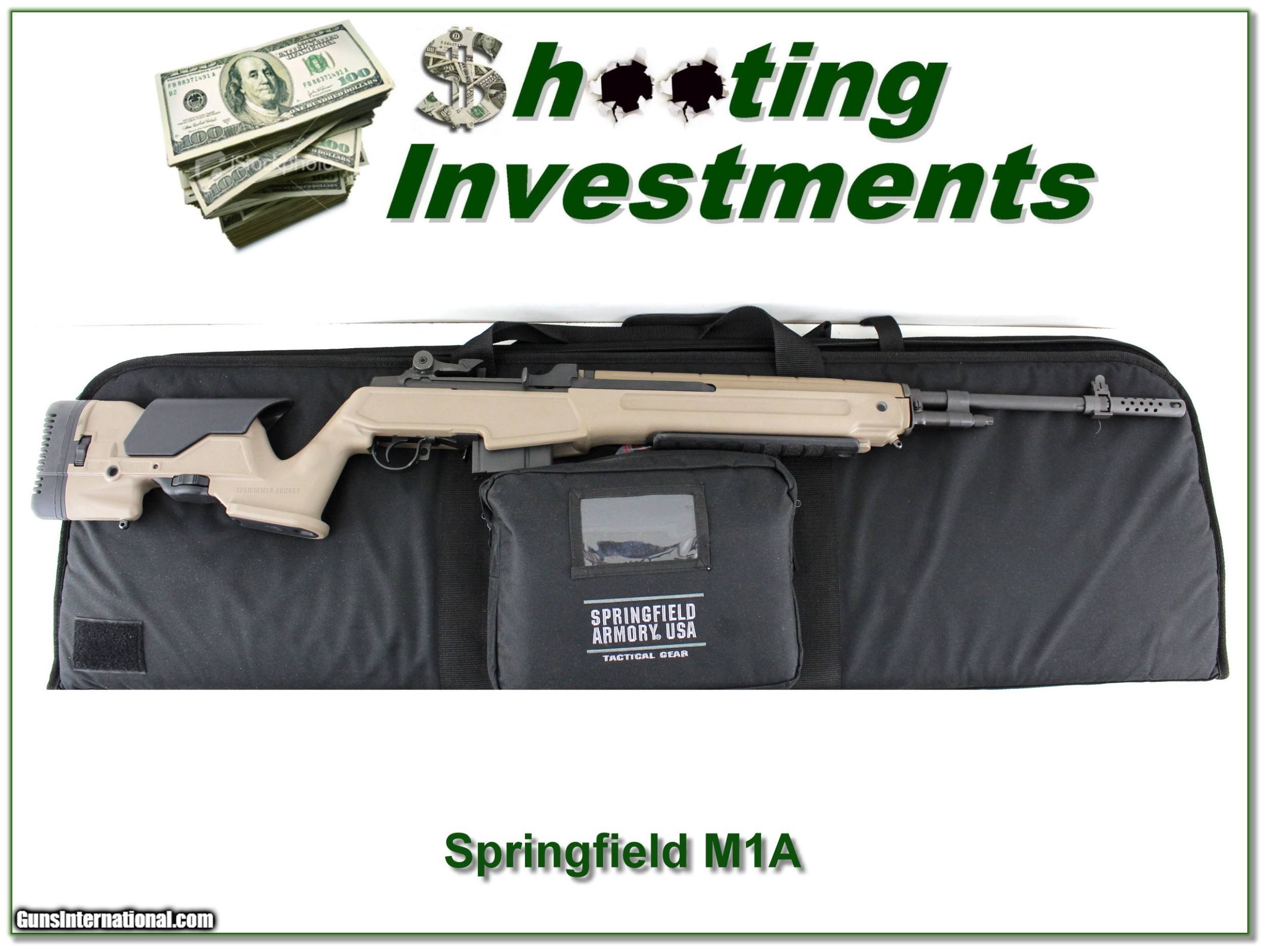 Description: Shooters, this is a new and unfired Springfield, M1A 308. It is the limited edition with the archangel stock Desert FDE. It has both mussel brake and flash hiders, 3 mags, scope mount, large zipper gun case (broken Zipper) it came in, and some other original pieces, papers, etc. I am selling this one on consignment and as such lay-a-way can’t be used. It does of course have the standard 3-day inspection. Shipping and insurance is $59. Please email me with any questions or larger pictures. (Consign your quality firearms with Shooting Investments for only 12%! Let me know if you have any you would like to sell!) 22-0989 Payment: Payment is by Money Order, Cashiers Check or Personal Check. I can now also accept Credit Cards (MasterCard, Visa, Discover & American Express) with a 3% convenience fee. Shipping: The shipping charge will be listed in each description. It is $49 for most long guns. Some heavy guns, over 48in boxes or those insured for over $2000 will be higher. Shipments to Alaska and Hawaii are higher because air shipment is required. Most firearms are shipped on Tuesday and Thursday and usually in 5 days of receipt of payment. We package all shipments carefully and insure them. Optics are shipped Priority Mail and most other non-firearm shipments are shipped First Class. Returns: Our return policy is simple. If for any reason you are not pleased with your purchase, you may return your item for a full refund of purchase price. Ammunition cannot be returned. It is important to us that you are happy. Guns cannot be fired or dissembled before returning them and they must be returned in the same condition as received. Notification of a return must occur with-in 3 days of receipt at your dealer. Shipping, convenience and dealer fees are not refundable and are the responsibility of the buyer. Lay-a-way: If needed, we offer a 60 day lay-a-way option on most firearms. It is 1/3 now, 1/3 in 30 days and 1/3 in 60 days. Lay-a-way firearm sales are final and if not completed the first payment cannot be returned. Consigning your firearms with Shooting Investments: We will help you get top dollar for your firearms. While most local guns shops charge 20% or more, our fee is only 12% with a minimum of $75. At your local gun shop it might take months to sell. Selling on-line provides instant access to thousands of interested buyers. You won’t find any other on-line dealer willing to sell your firearms for only 12% or listing every gun on 3 separate s. Selling through an House typically costs the seller 15% and the buyer an addition 15% (so 30%) and you have to wait several months to sell and longer to receive funds. If properly priced, we will sell your firearms in a few weeks. Send us an email or give us a call and we’ll explain how easy it is for you to get top dollar. Trading: Trading for use is really just buying your gun to re-sell. If you have a gun you want to trade, please email a picture and we will let you know what we can give or it. You will always get more if we sell it for you on consignment. Help for California Buyers: We are happy to ship to California. It is the buyer’s responsibility to make sure any item you buy is legal in your state. We are also happy to help with your purchase of a firearm from someone other than us. If you see a gun you would like to buy but the seller can’t or won’t ship to California they can ship to use and we’ll then ship it to your California dealer. The cost for this service is only $30 + shipping. Let us know if we can help! SOLD |