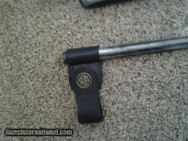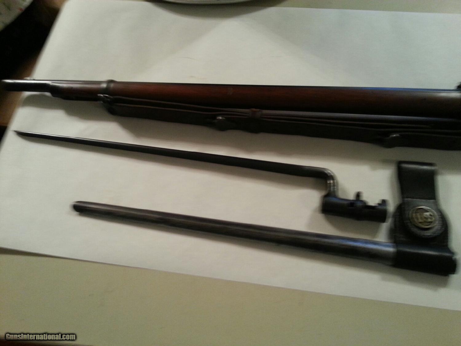 Description: All original with mating bayonet ans scabbard. Issued by Oregon militia. This rifle is in 98% condition. All original with matching serial numbers, original finish, excellent stock with original finish. The bayonet and scabbard were issued with the rifle and are in excellent condition. The blade has normal scabbard wear. All markings and cartuche are clean and clear. SOLD Antique: Yes Manufacturer: Springfield Model: Trapdoor Serial Number: 332479 Caliber Info: 45-70 Bore: bright finish, sharp rifling Condition: 98% Metal Condition: original finish clean no rust Wood Condition: Original finish, marked "Oregon" by Springfield, excellent condition Bore Condition: bright with sharp riffling Action: Trapdoor |