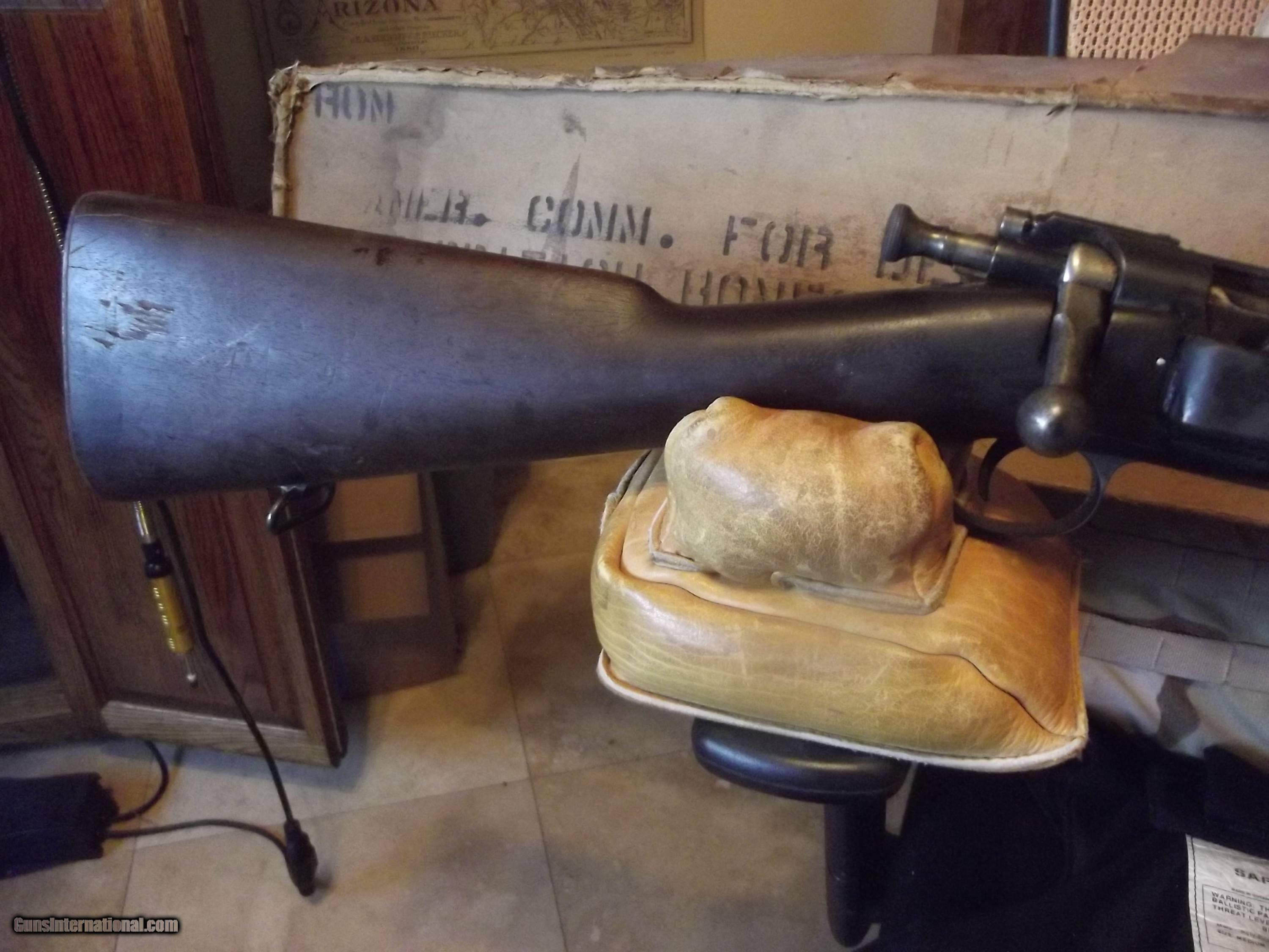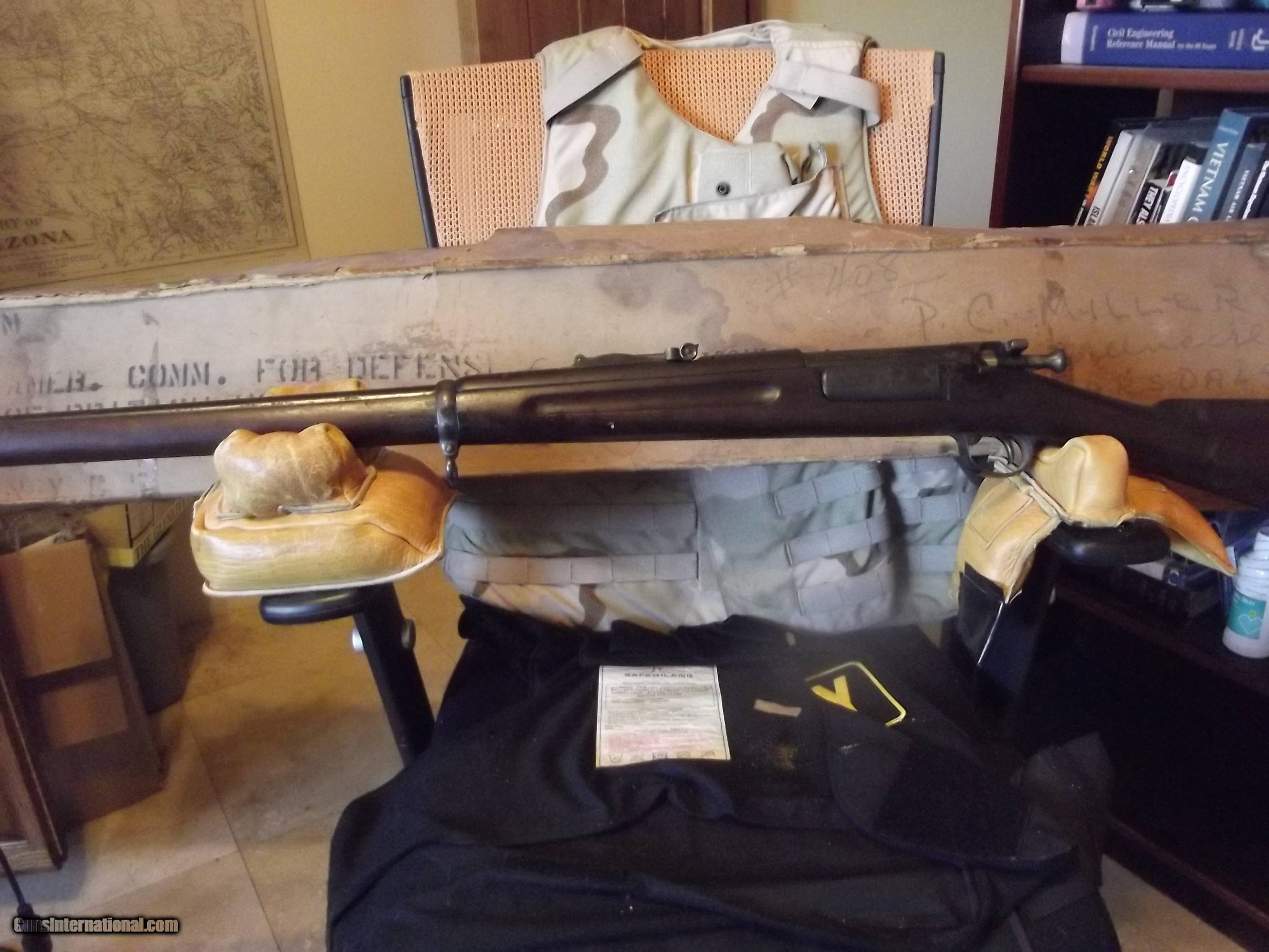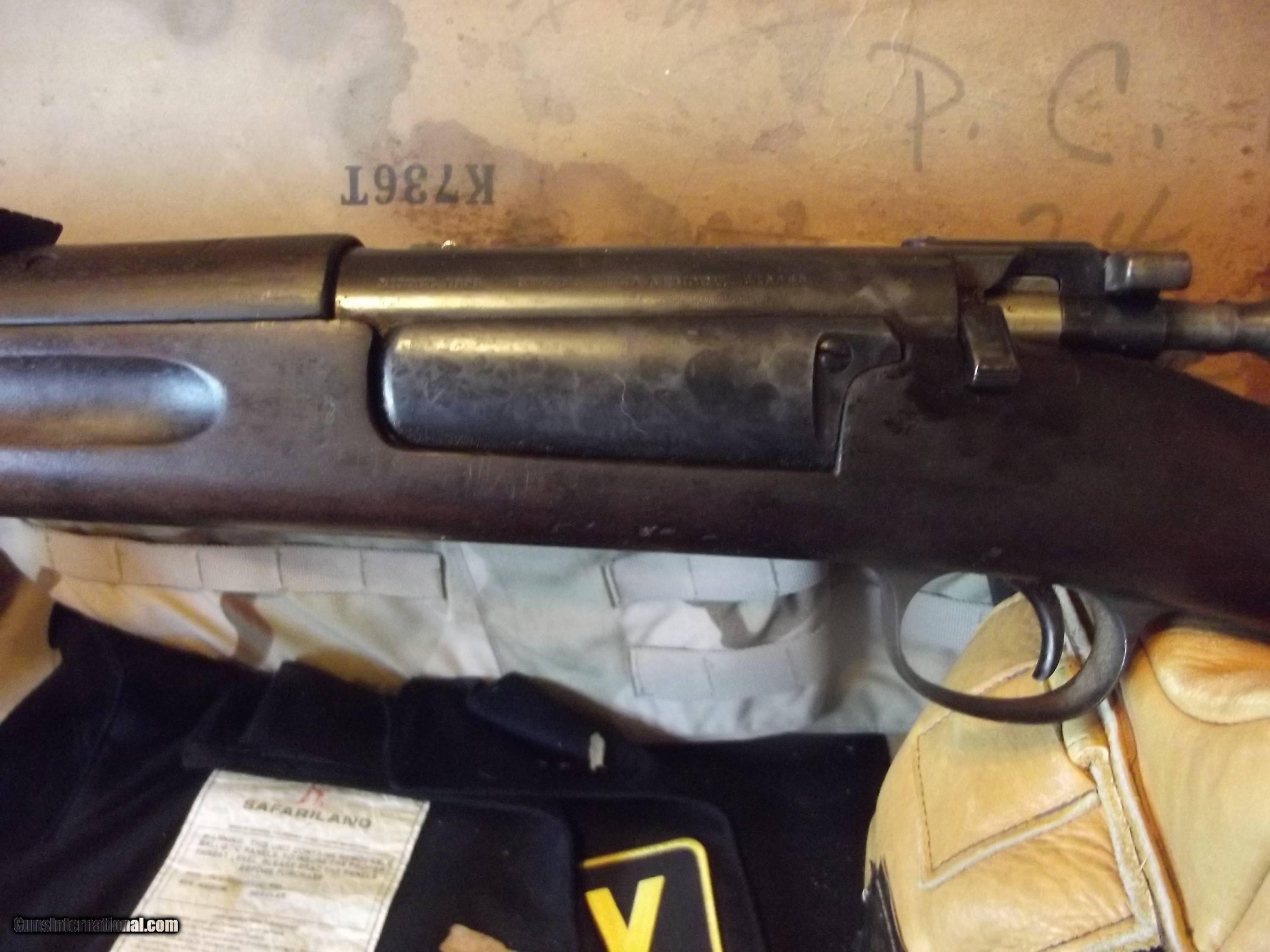 Description: US Springfield 1898 Rifle This rifle was part of loan/lease program to arm British citizens, prior to the United States entering WW2. Rifle is in good overall condition. Includes original cardboard box used to ship gun, indicating that it was part of program to protect British homes. SOLD Curio/Relic: Yes Rifle Caliber: .30-40 Krag Manufacturer: Springfield Model: 1898 Serial Number: 215069 Condition: good Metal Condition: fair-good Wood Condition: good Bore Condition: good |